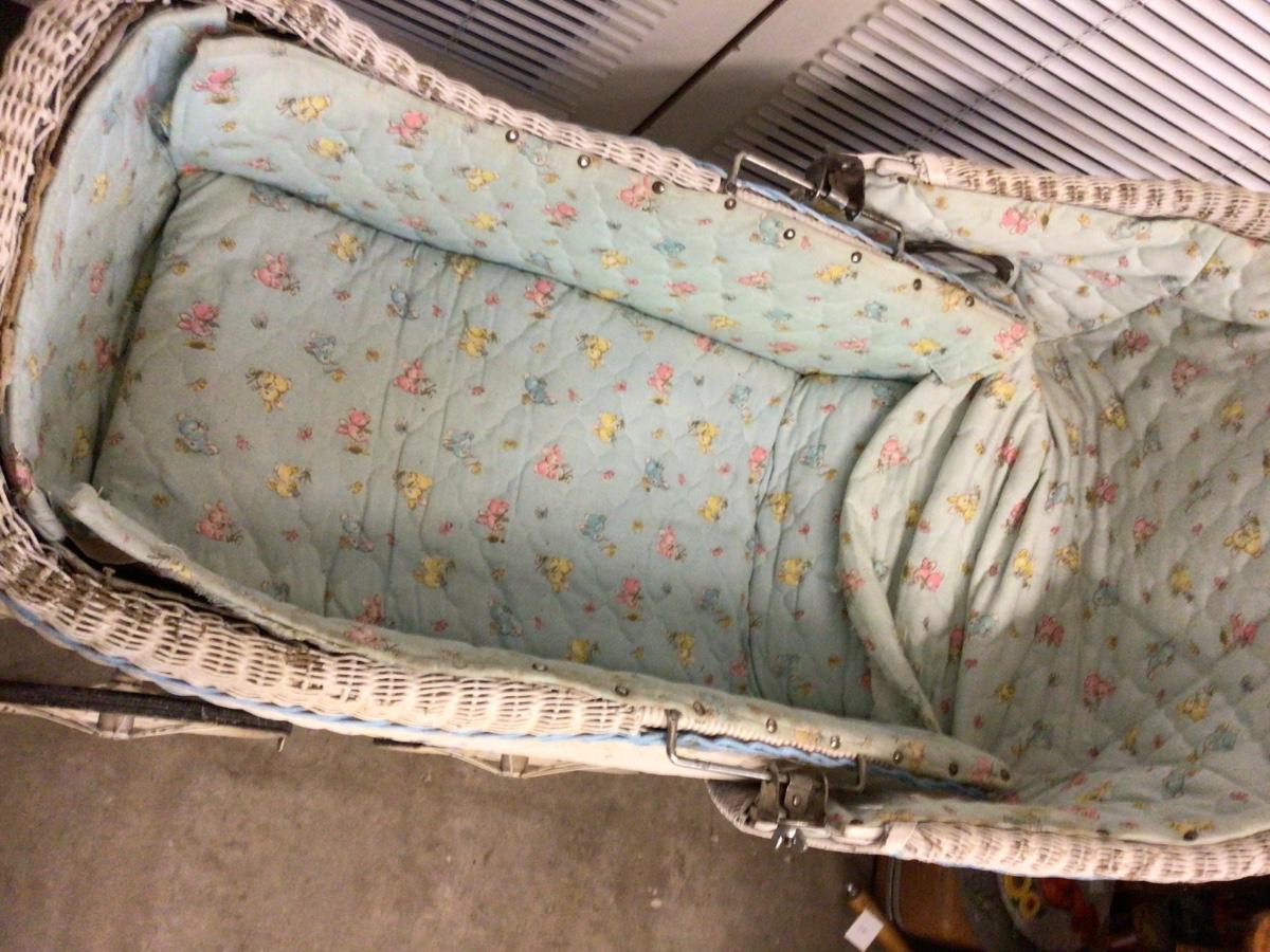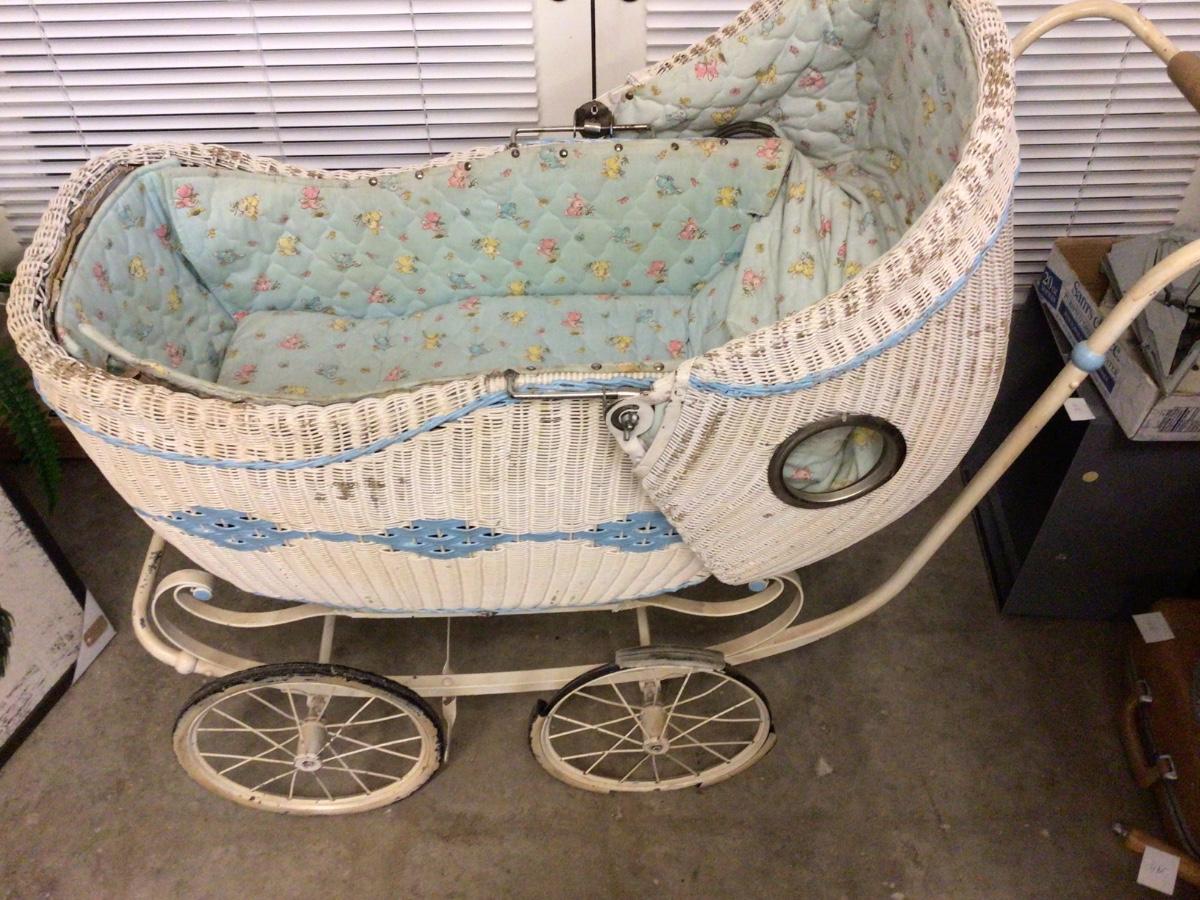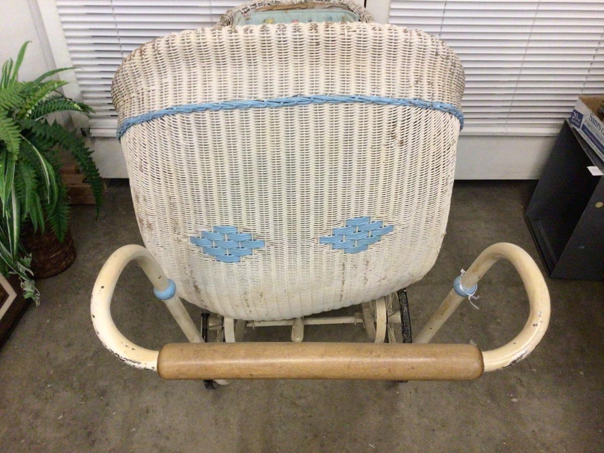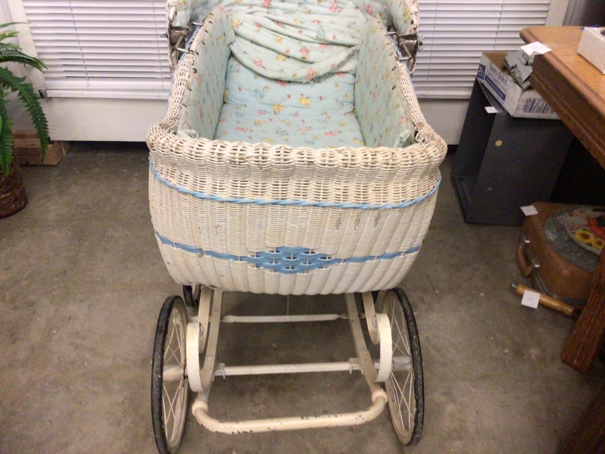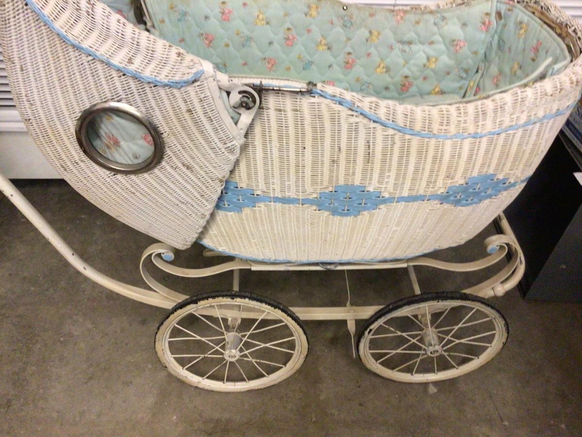 This is a great blue and white wicker baby buggy. It has a Fa brick inside liner.