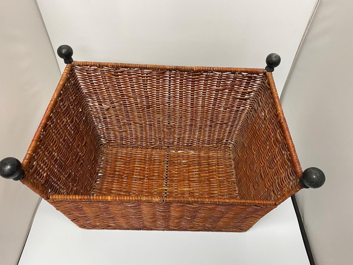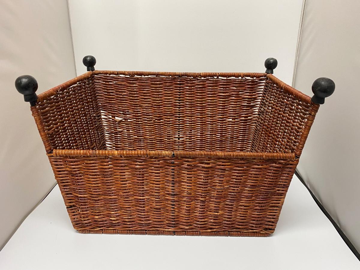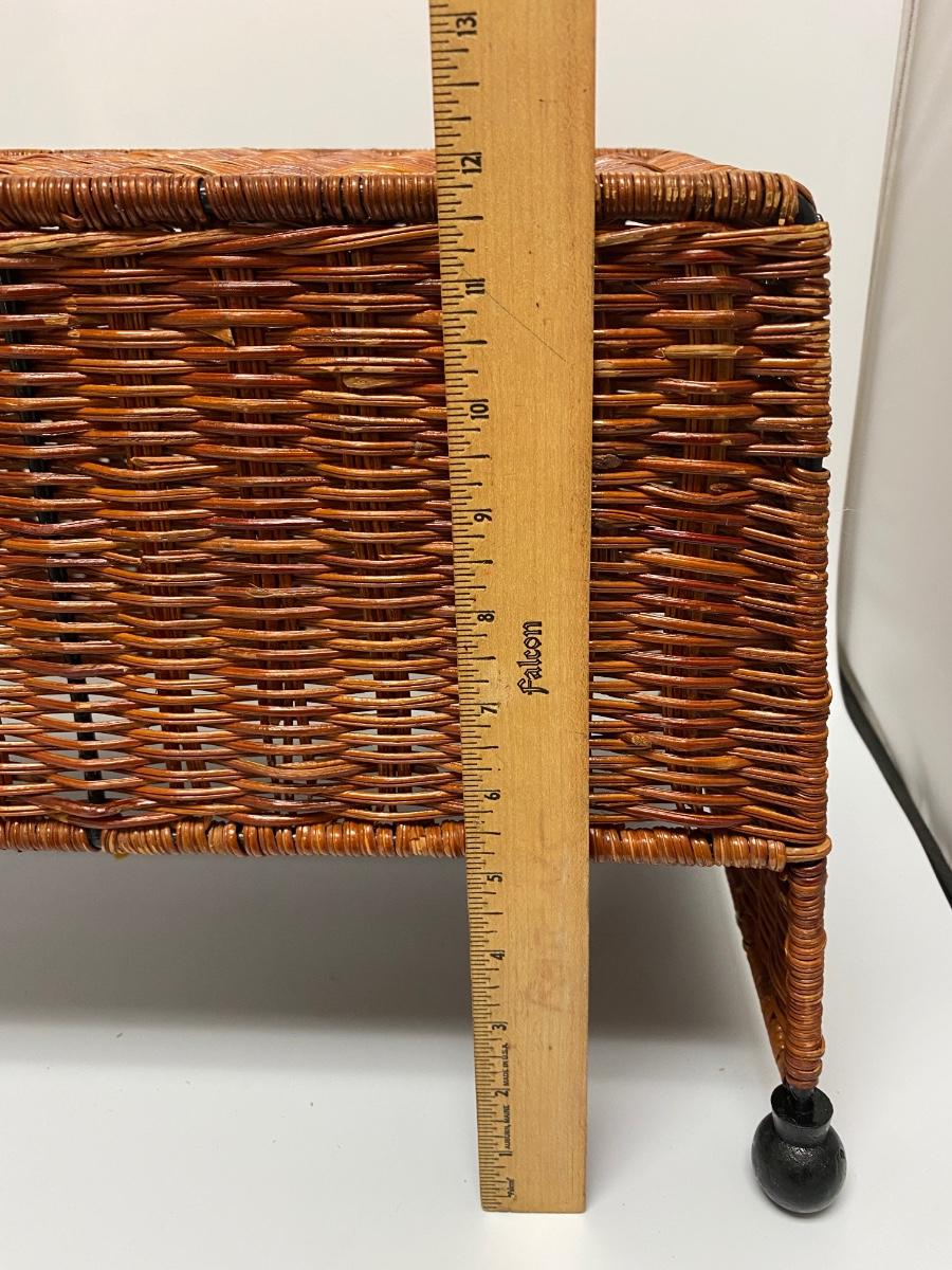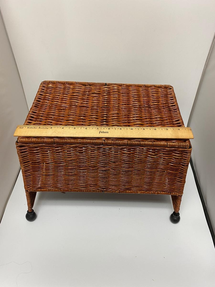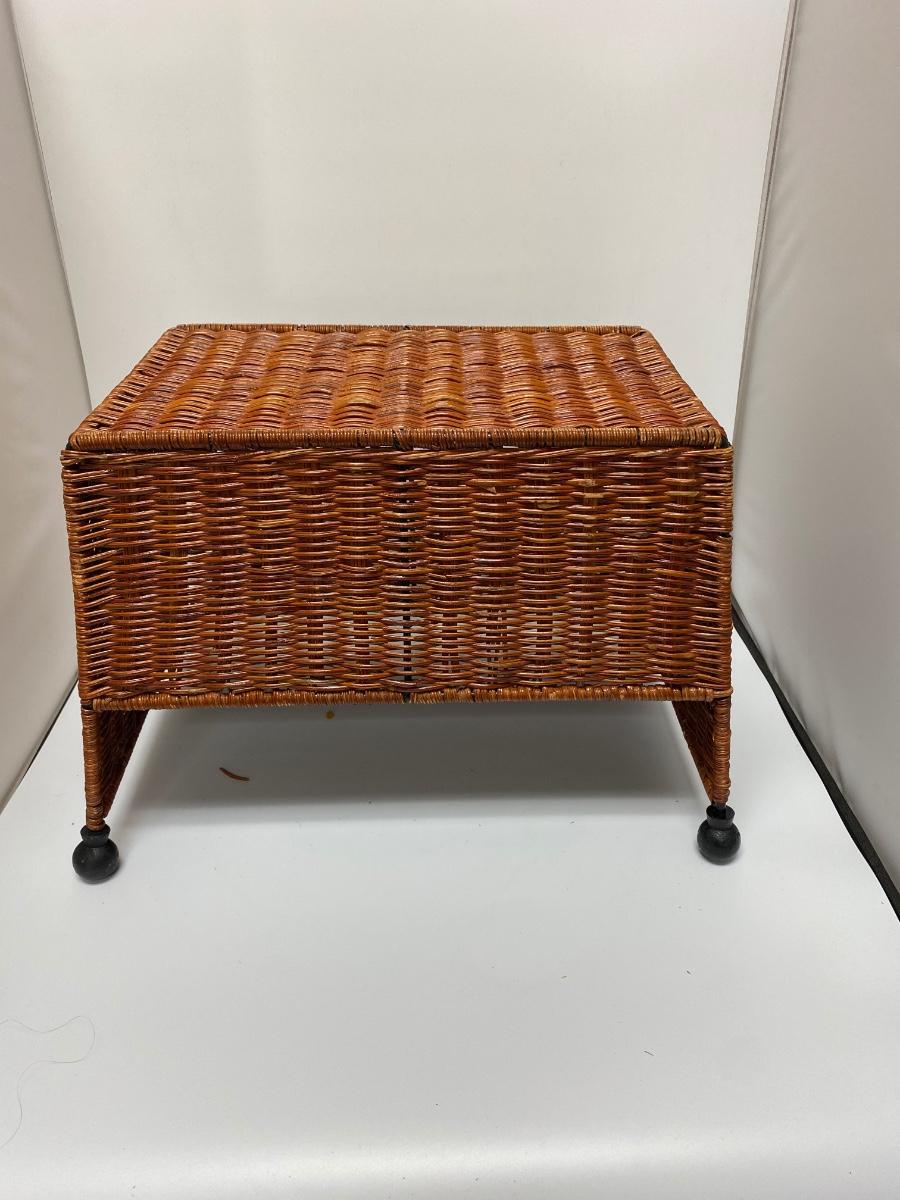Wicker foot stool ottoman/ basket combo. Use as a footrest or flip over for storage basket. Good condition. About 12" high and 15" wide.