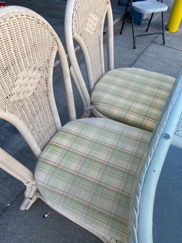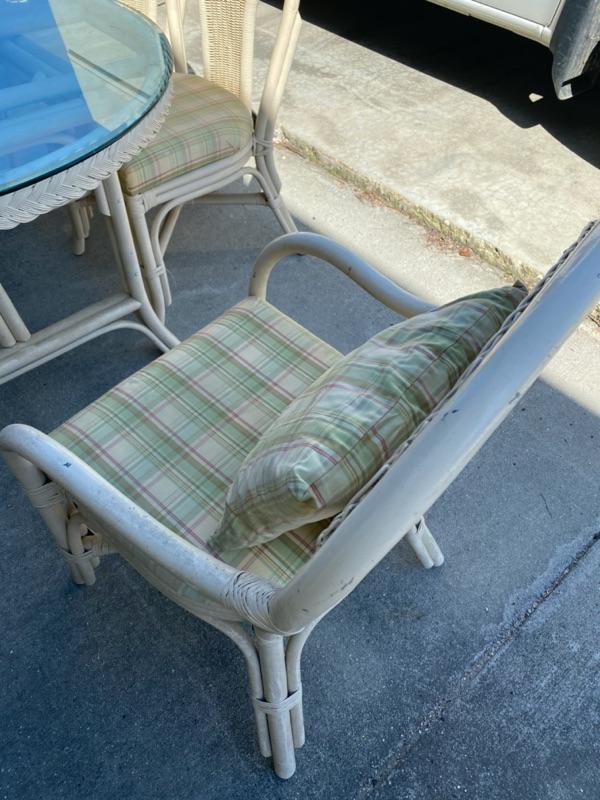 Wicker/Glass Table w/4 side chairs and 2 arm chairs with cushions-Lot 642