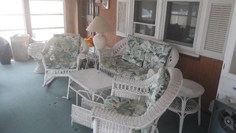7 pieces included in this set. 1 rocker, 1 chair, 1 sofa, magazine/newspaper rack, lamp & 3 tables. Good condition. Located in Florida Room.