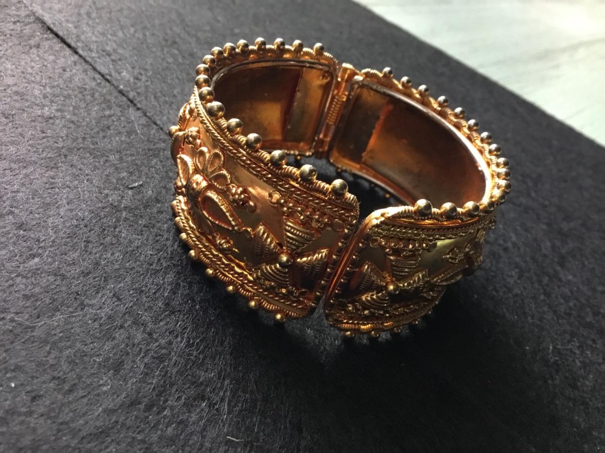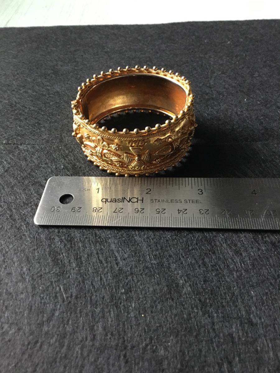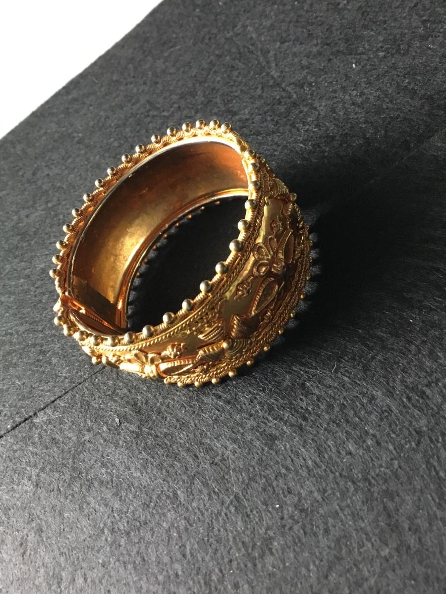 Wide hinged yellow gold tone bangle bracelet with floral and scroll motifs