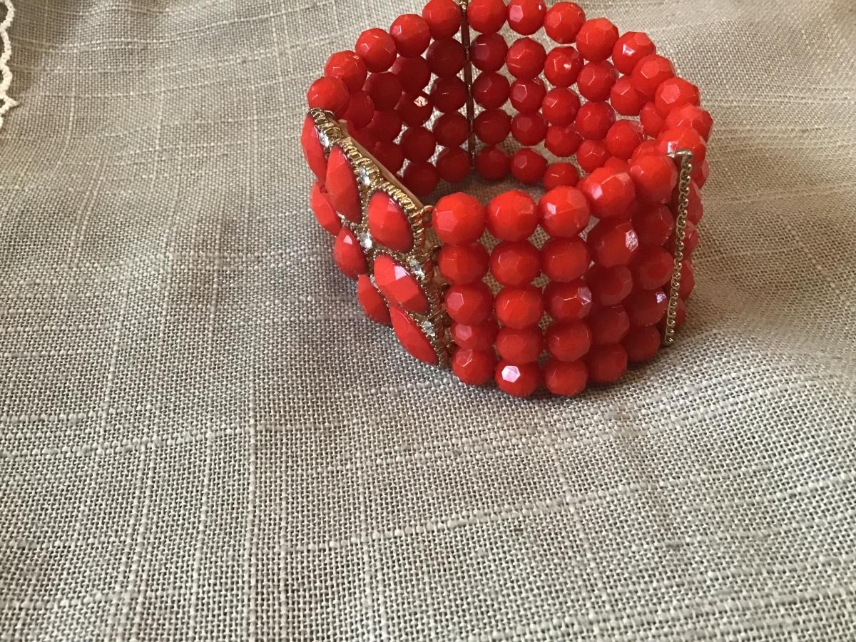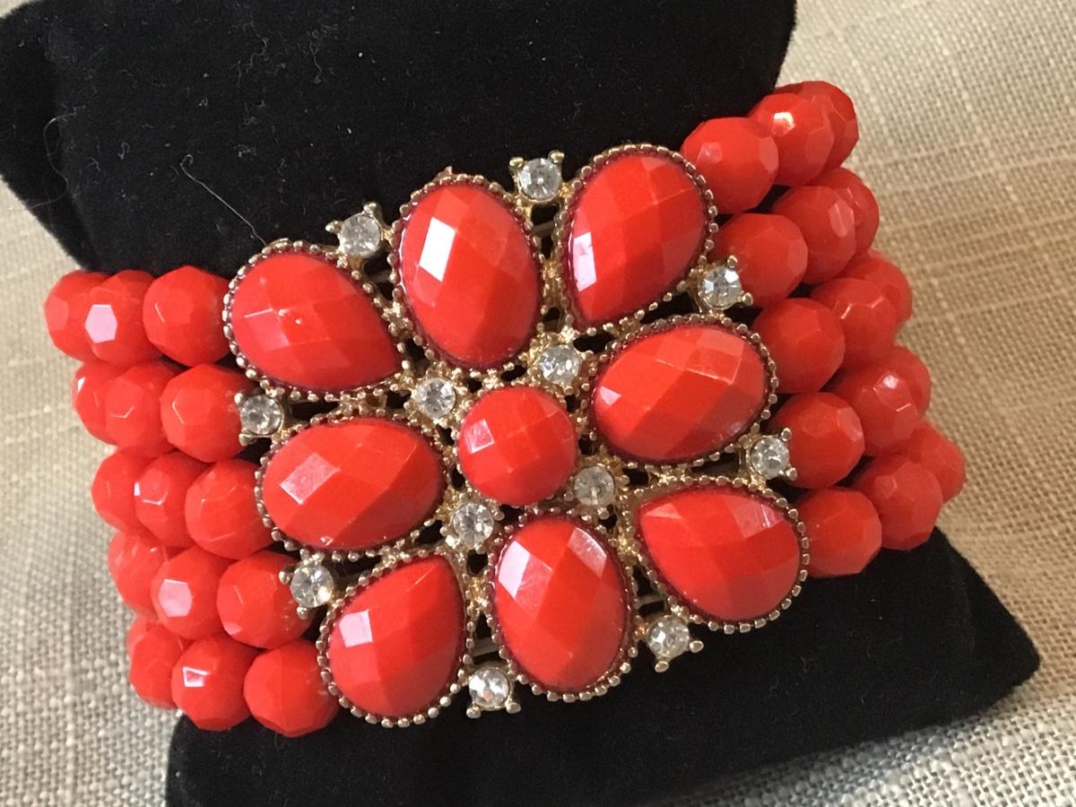 Wide Multi-Strand Red/Orangs Beaded Stretch Expansion Bracelet Faceted Center