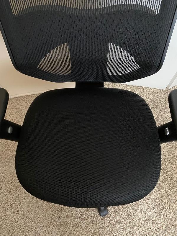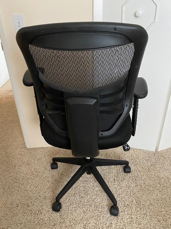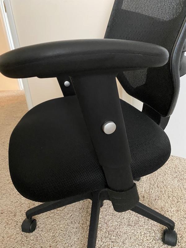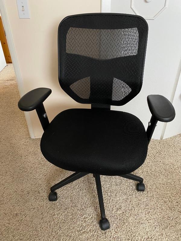 Wide seat and back desk chair. Has adjustable seat height and arm height. Rolls. Good condition.