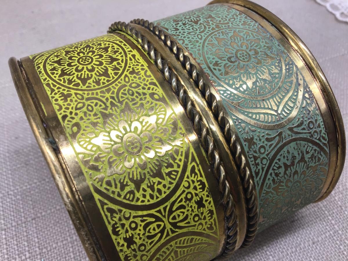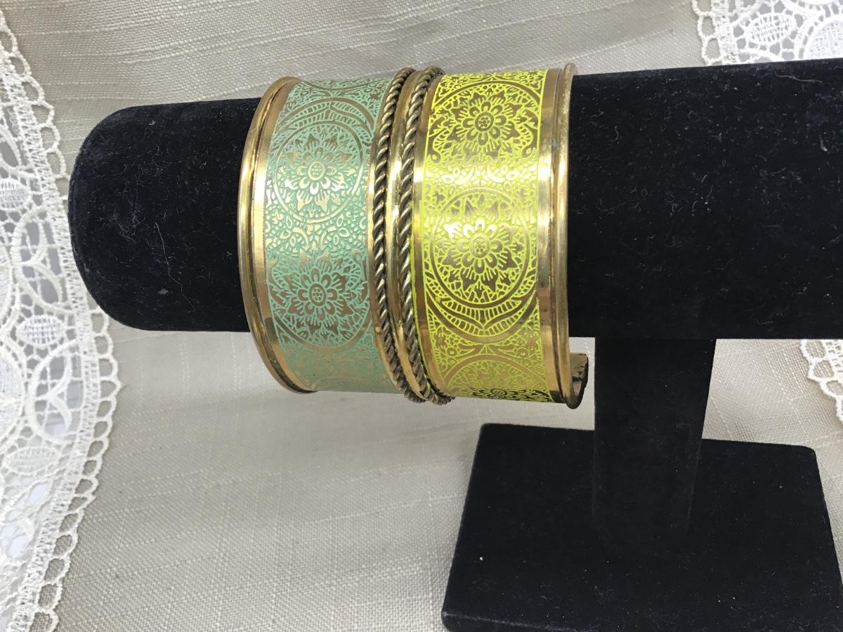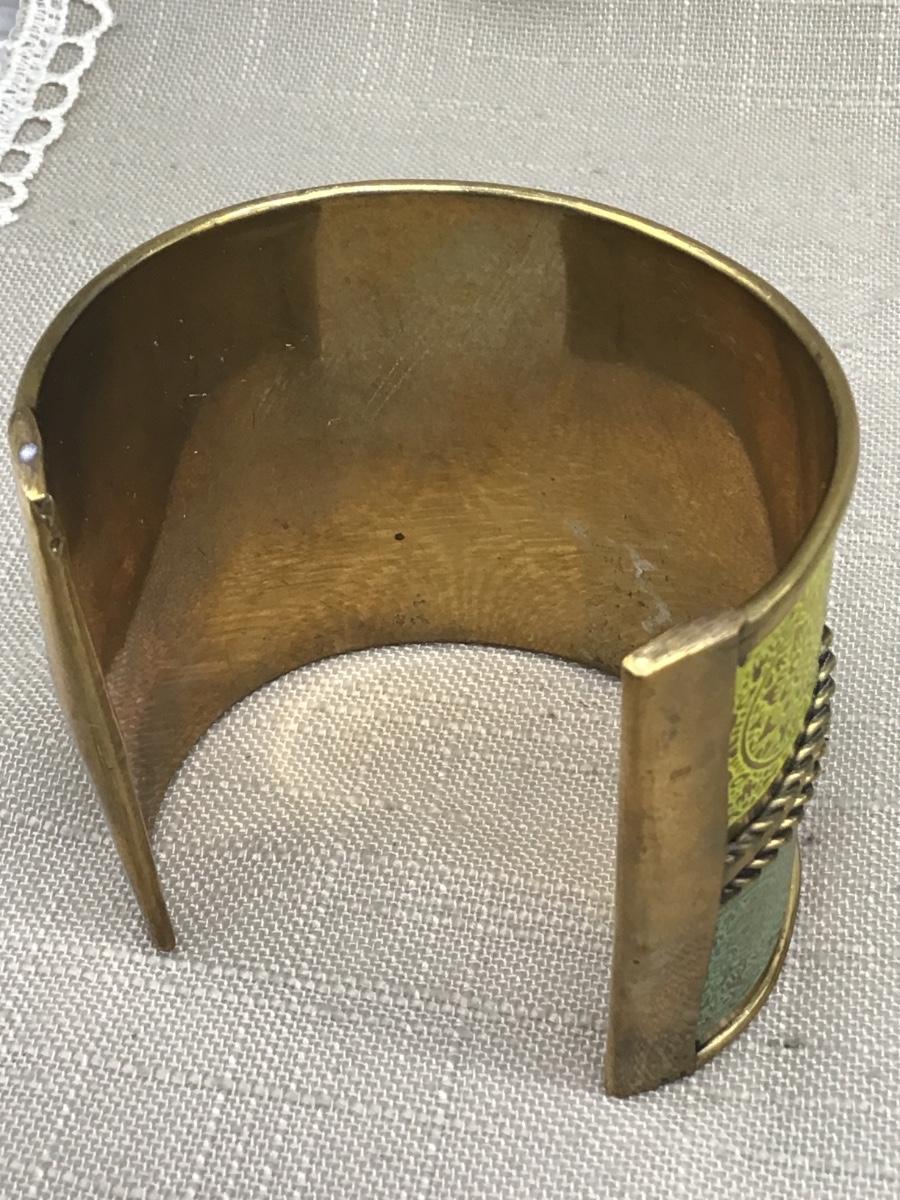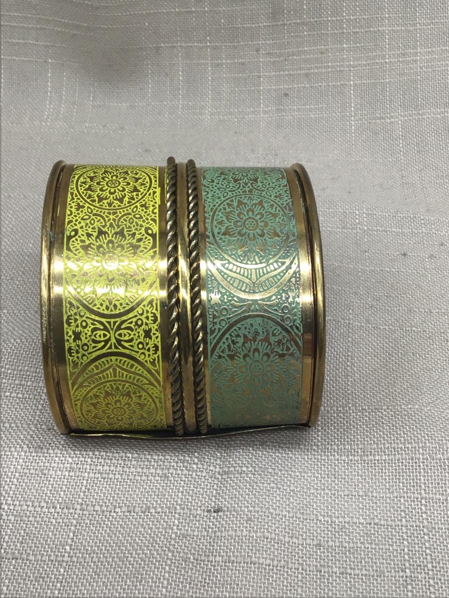 Wide Yellow Teal Etched Wide Brass Cuff