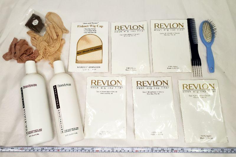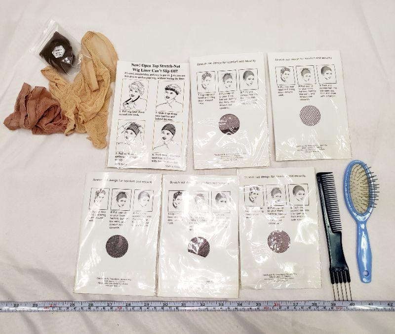 Synthetic and natural hair wig shampoo and conditioner, both bottles are almost full, 6 new in package mesh wig cap liners, brush and comb all included in this lot.