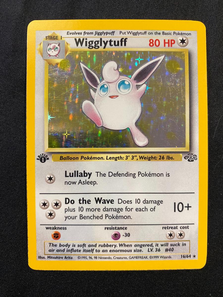 This is a Wigglytuff Holo Pokemon card from the First Edition Jungle set, marked #16/64. The card features a gold border with distinctive holographic elements. It has 80 HP and includes the moves Lullaby and Do the Wave. Manufactured in 1999 by Wizards of the Coast. Condition is light play.