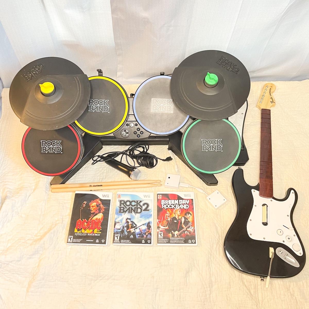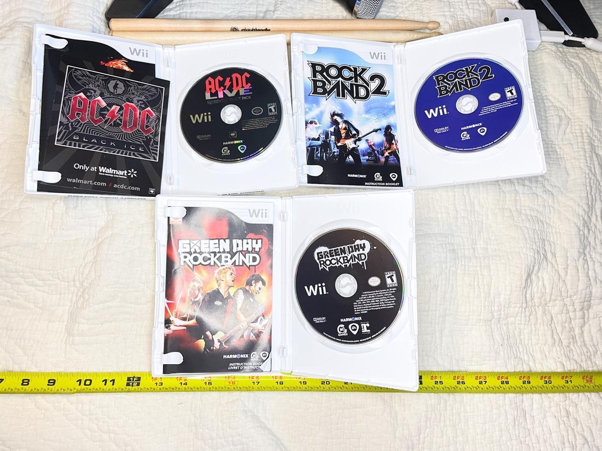 WII ROCKBAND GAMES, DRUMS, GUITAR, AND MICROPHONE