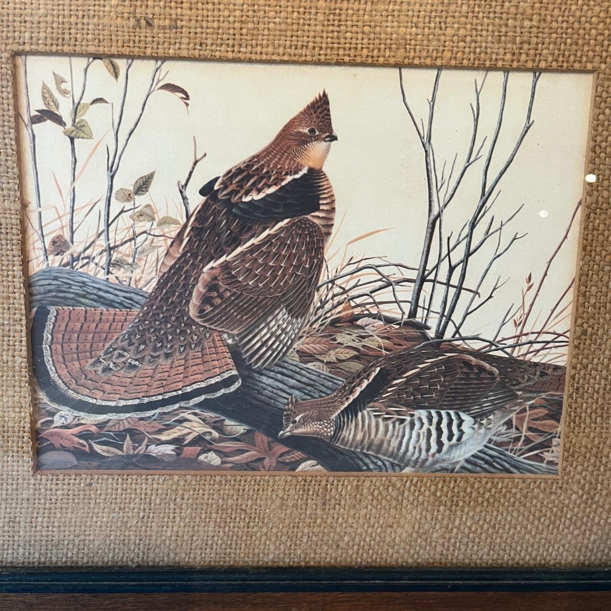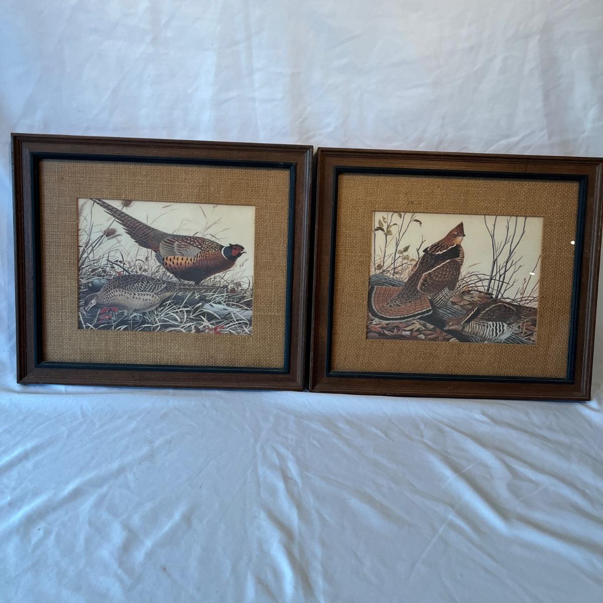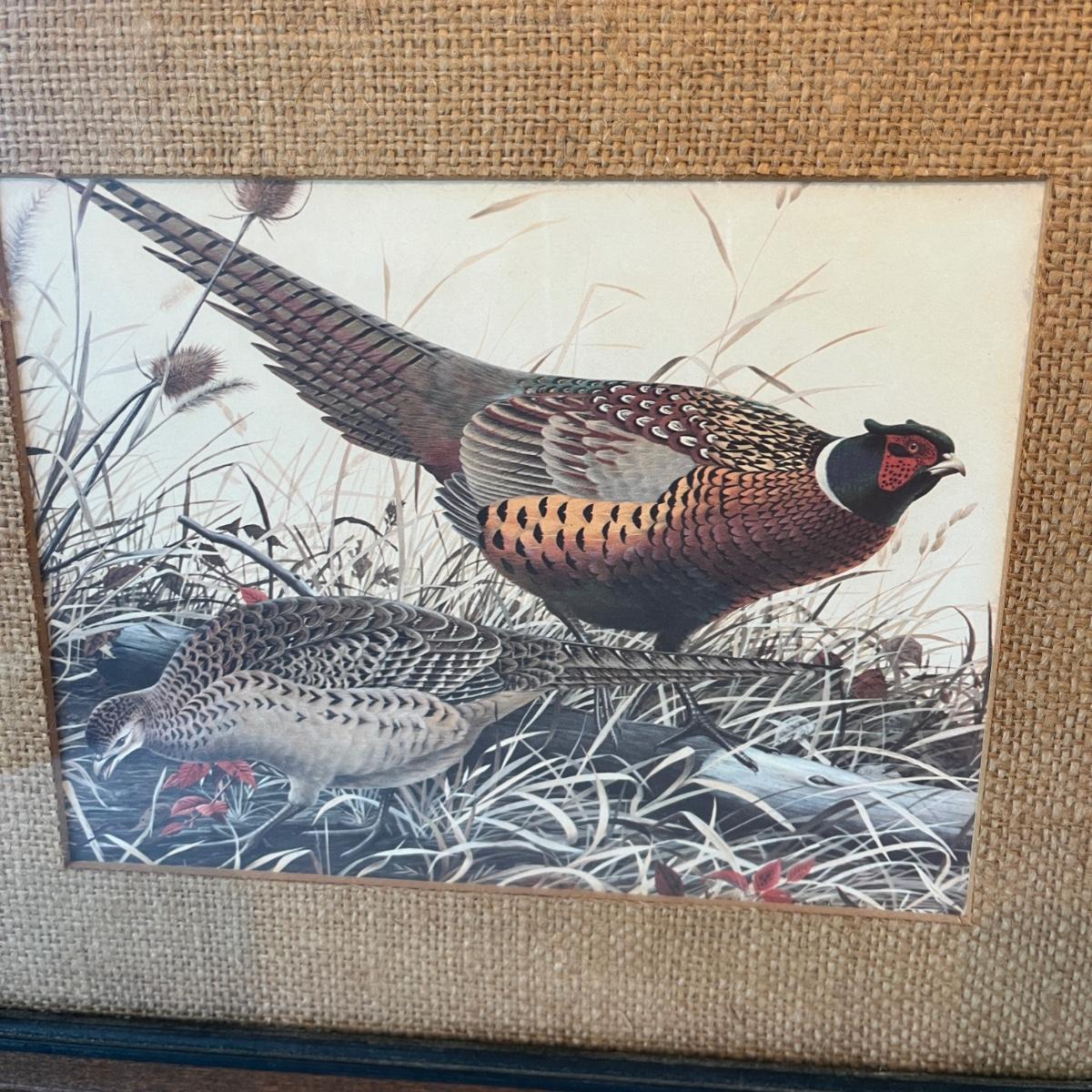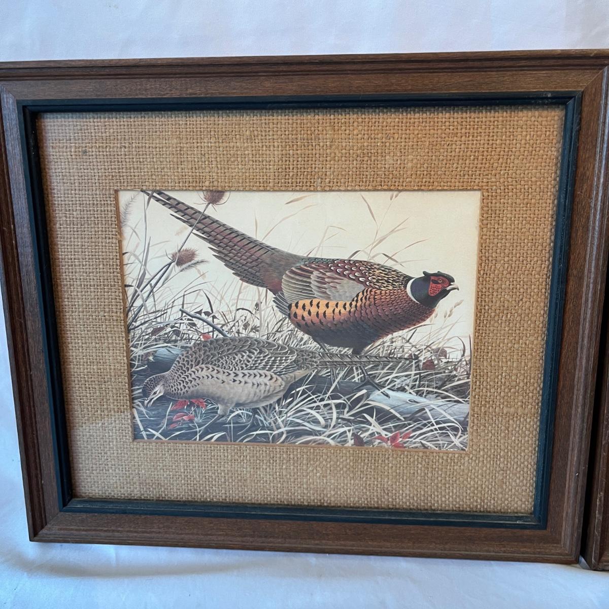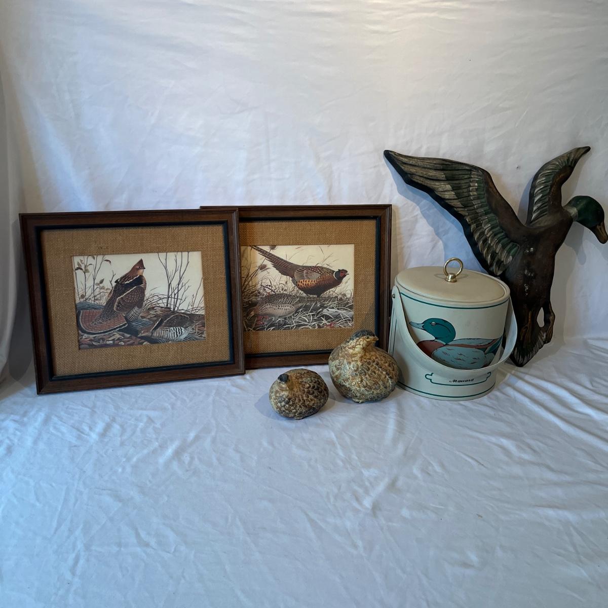 Lot includes a heavy metal mallard wall hanging, two wooden framed pheasant art, two ceramic pheasants and a George’s Briard plastic ice bucket. Frames measure 13.5” x 11”H.