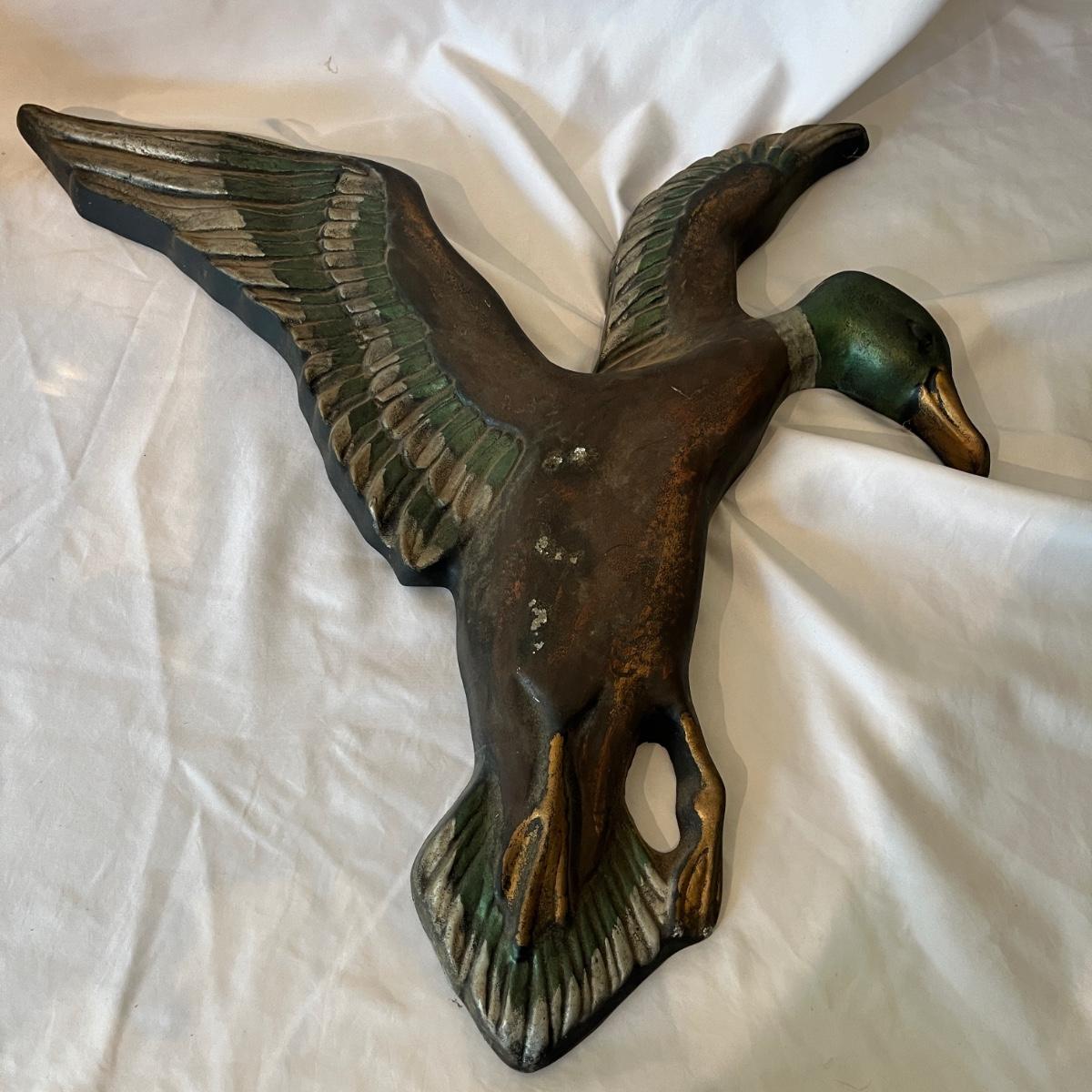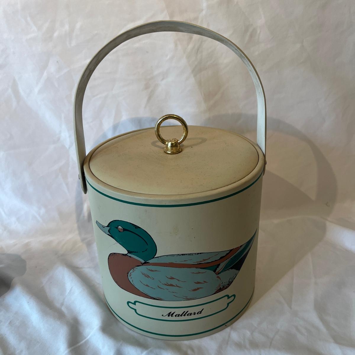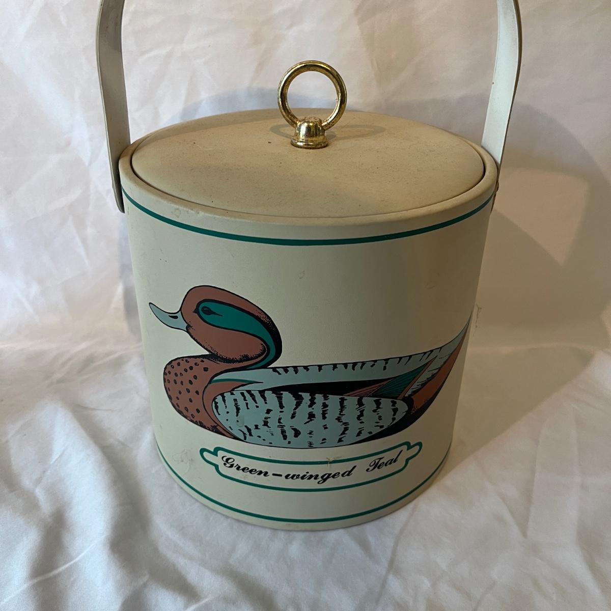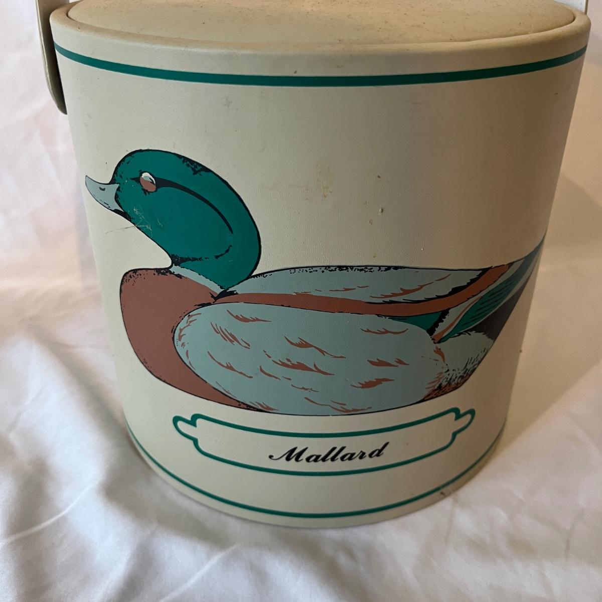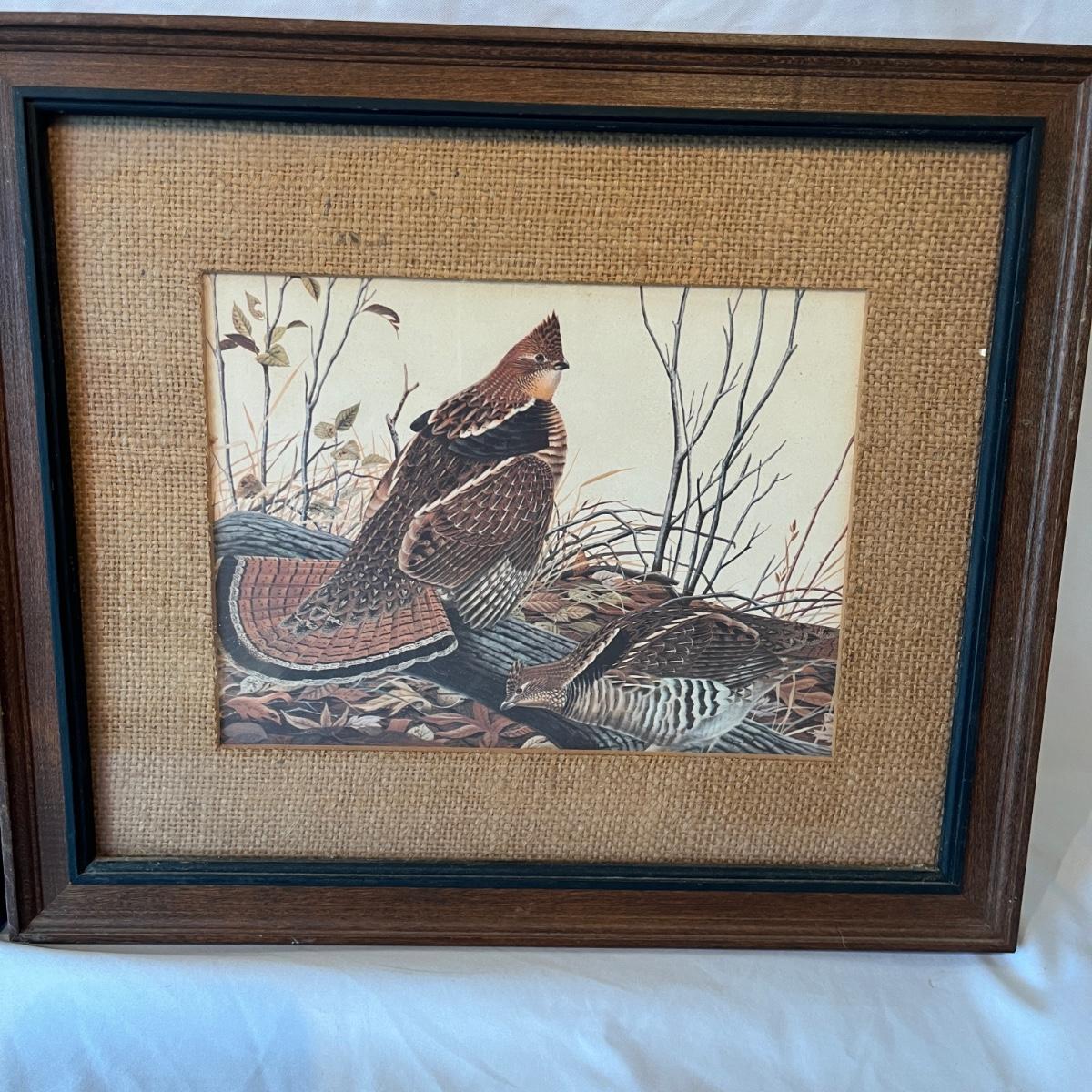 Lot includes a heavy metal mallard wall hanging, two wooden framed pheasant art, two ceramic pheasants and a George’s Briard plastic ice bucket. Frames measure 13.5” x 11”H.