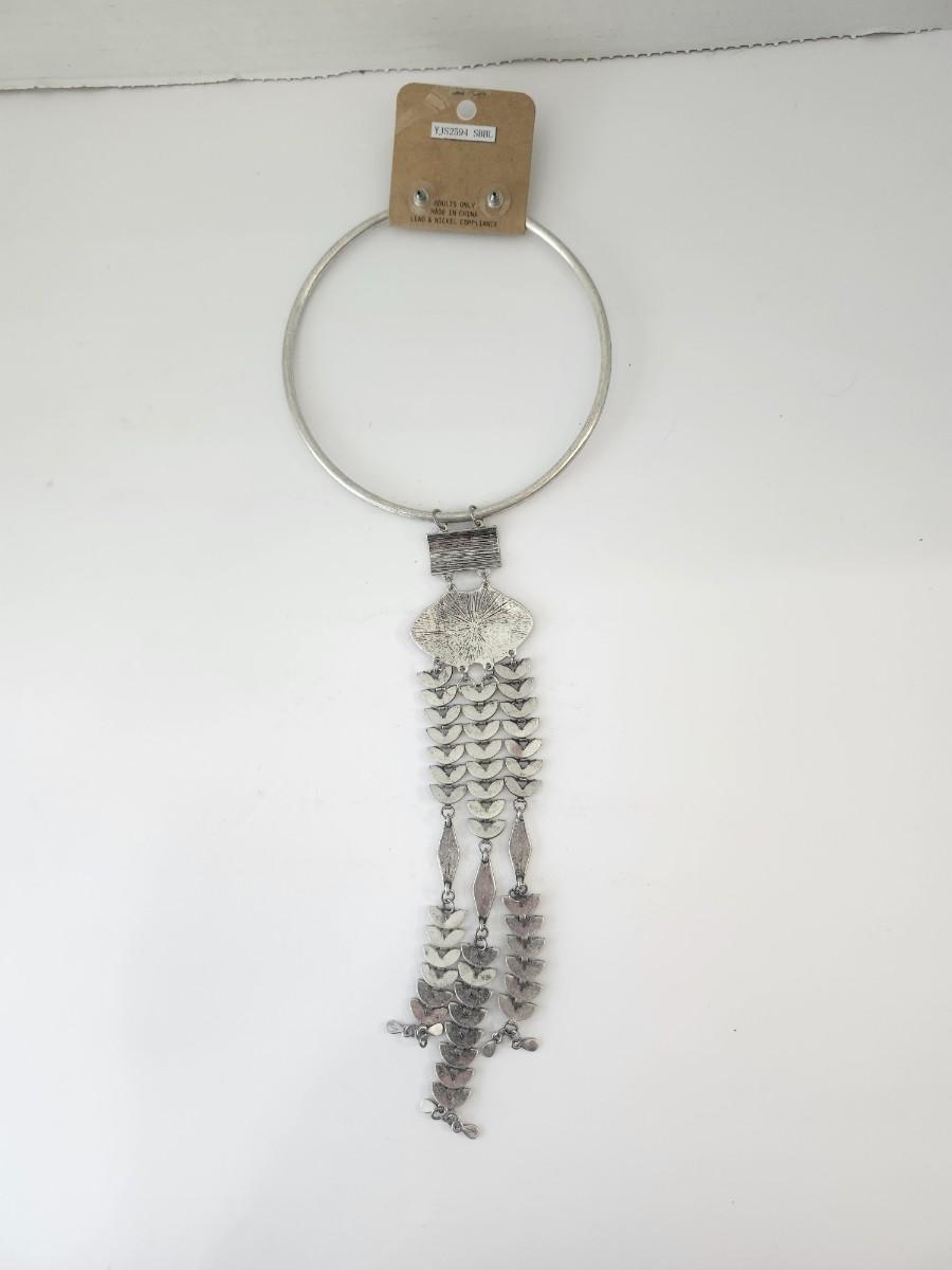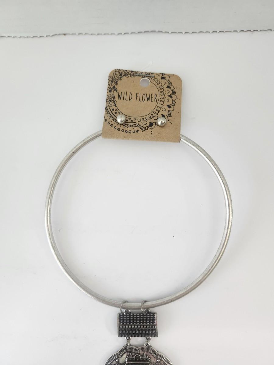 Wild Flower Silver Tone Torque Necklace With Dangling Fringe Pendant