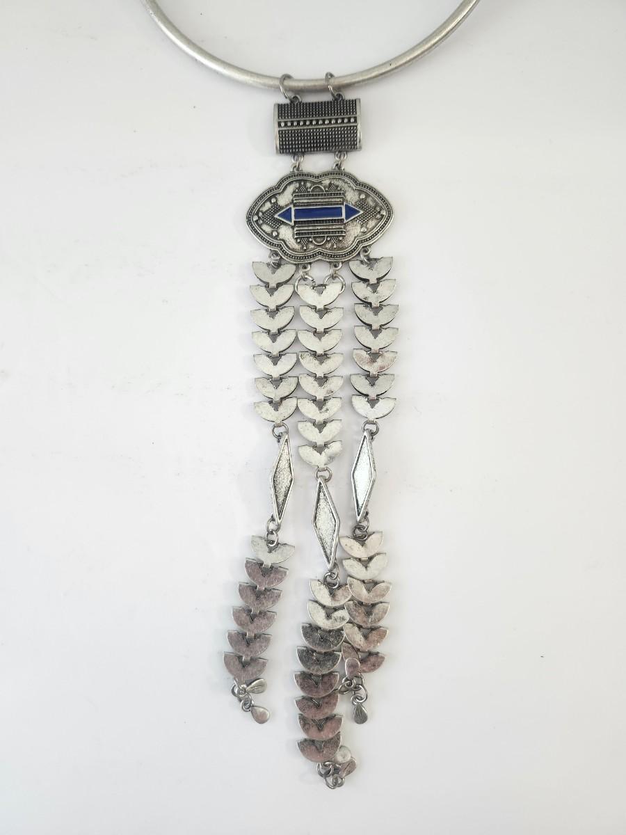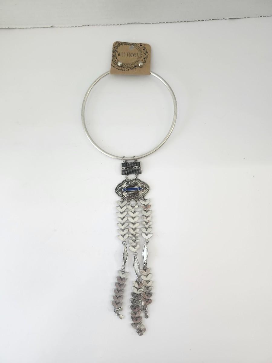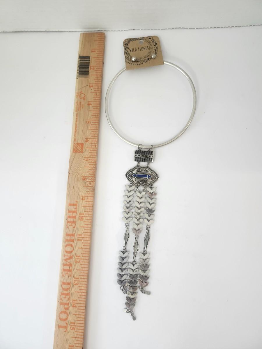 Rigid silver tone torque style necklace with an attached decorative pendant and cascading fringe elements. Pendant features layered geometric metalwork with a small blue enamel style accent at the center, followed by multiple articulated leaf shaped dangles that move freely. Marked with original Wild Flower display card at the top. Silver tone metal throughout. Design and materials described strictly from visible details only.