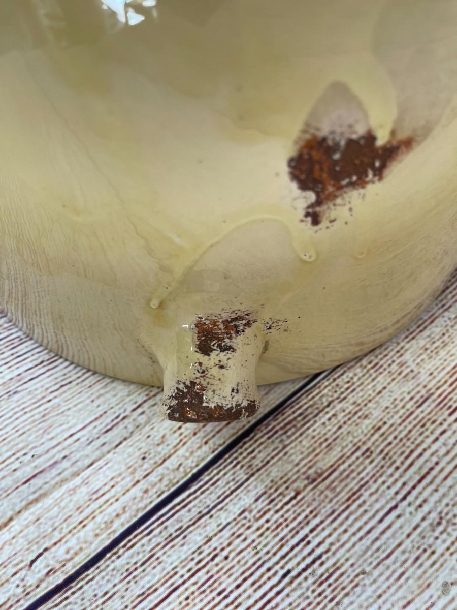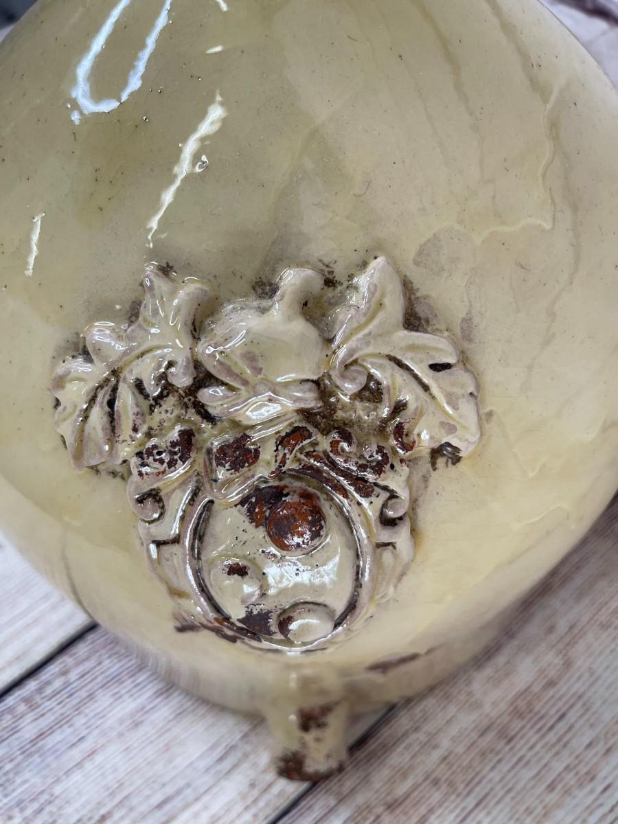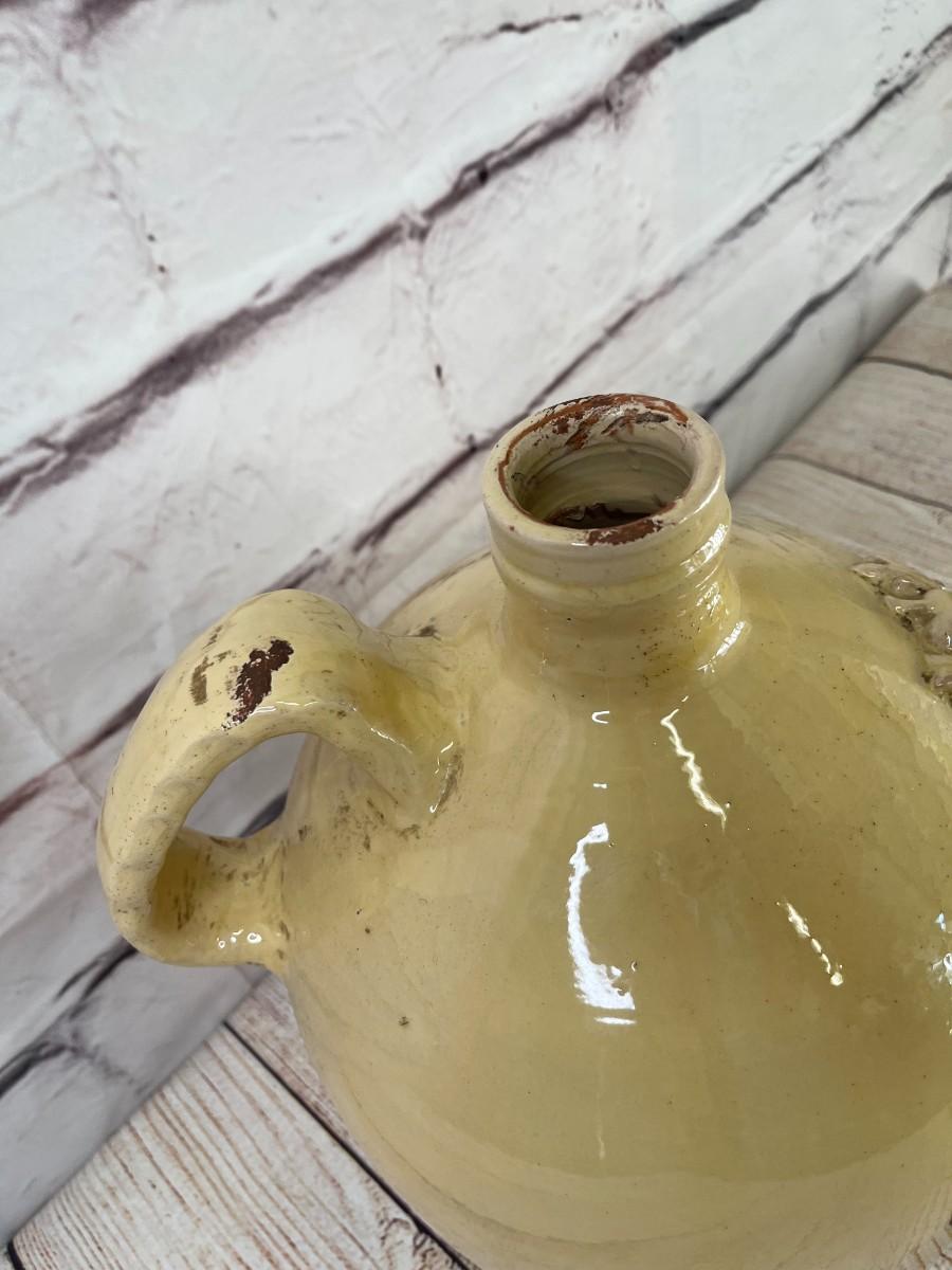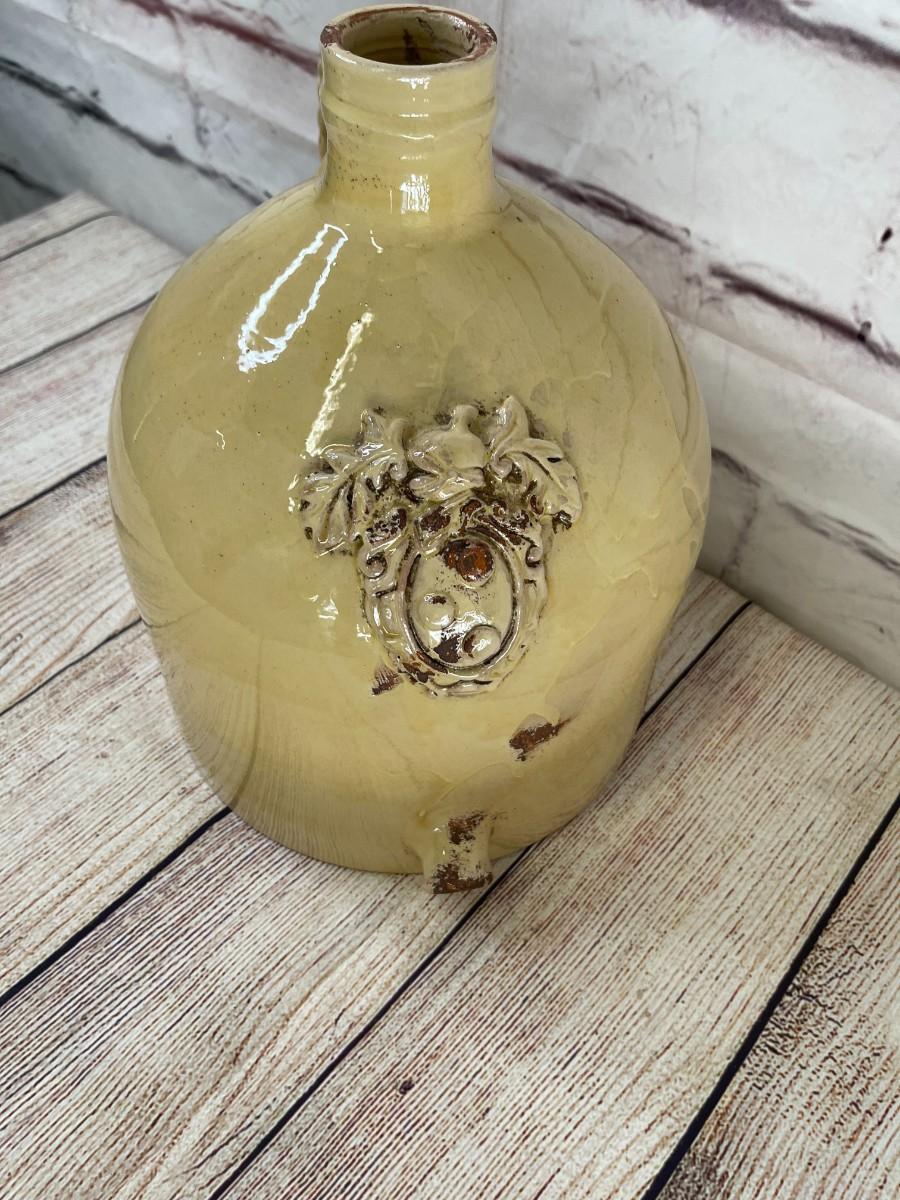 Wild Olive Co yellow glazed pottery jug with intentional crazing throughout. 12" high x 10 1/2" diameter. Very good condition. # 318