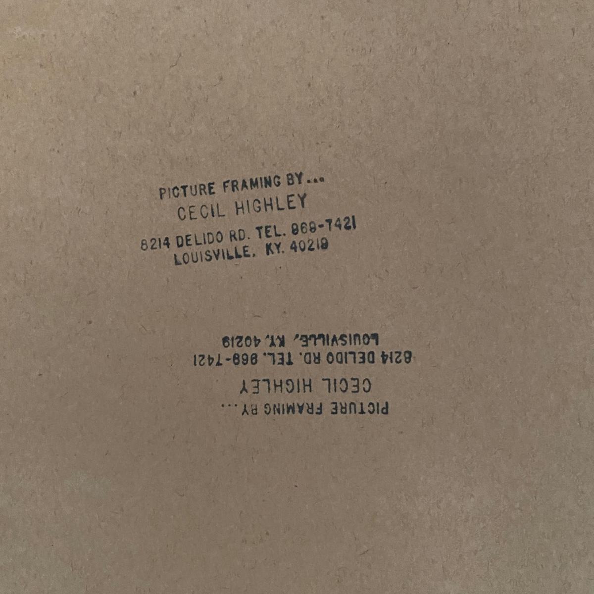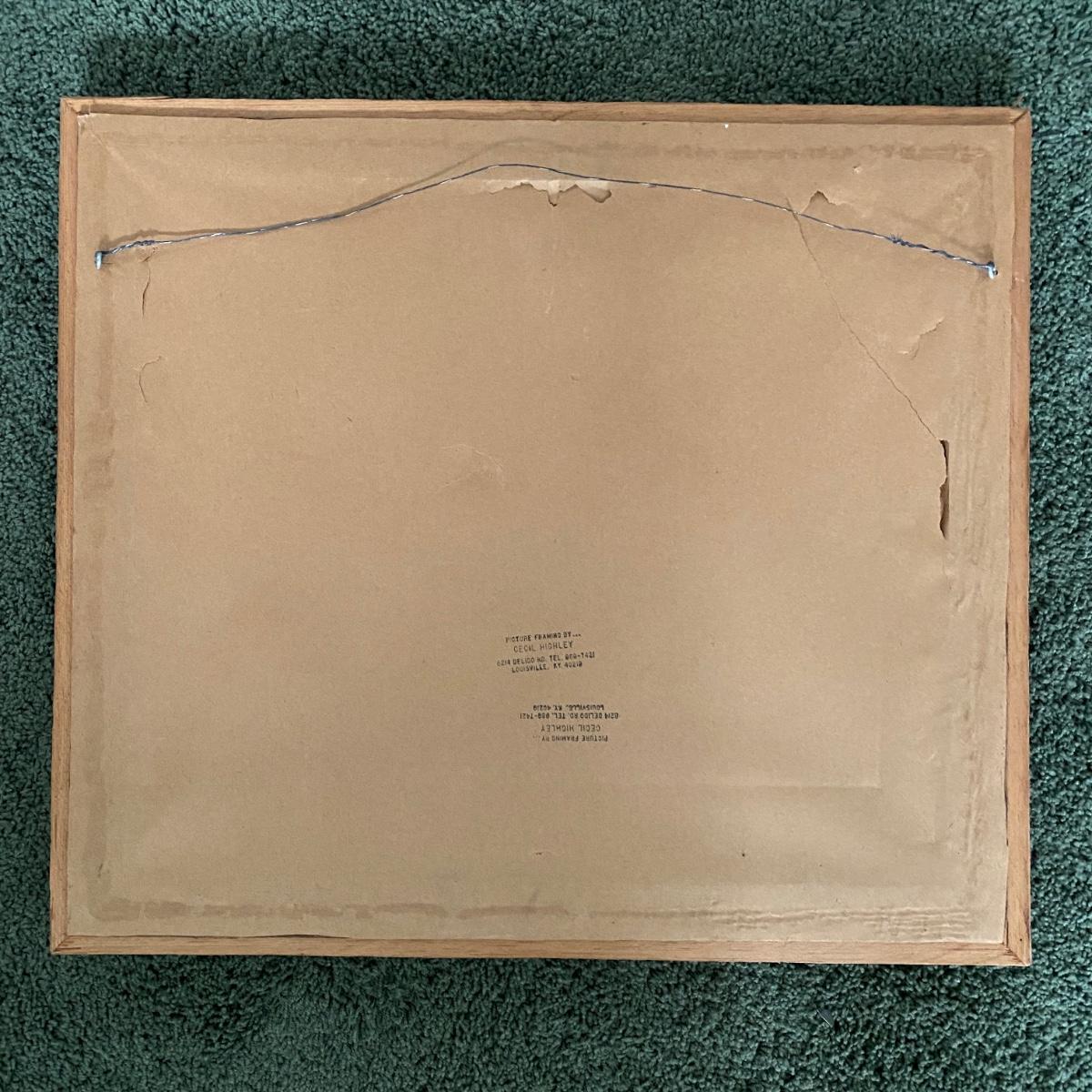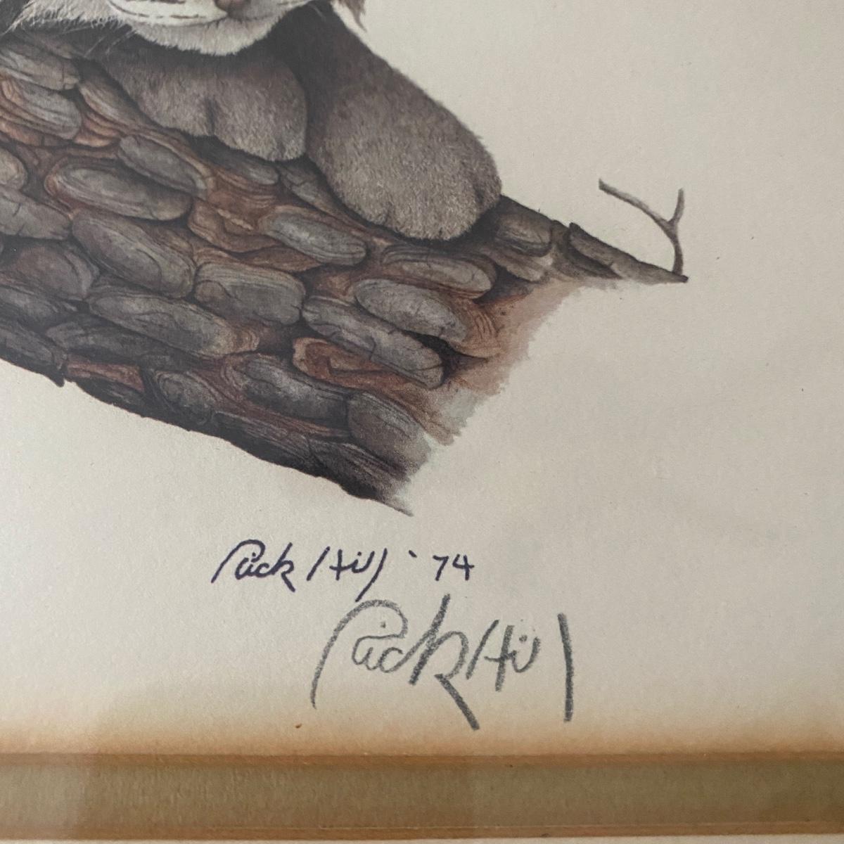 An offset lithograph print called Wildcat that is pencil signed by Rick Hill. The plate is numbered VIII in upper left. It is signed in plate and in pencil on the lower right. The print is under glass in a wooden frame. Some small tears on paper backing. 23” x 20” Shipping available