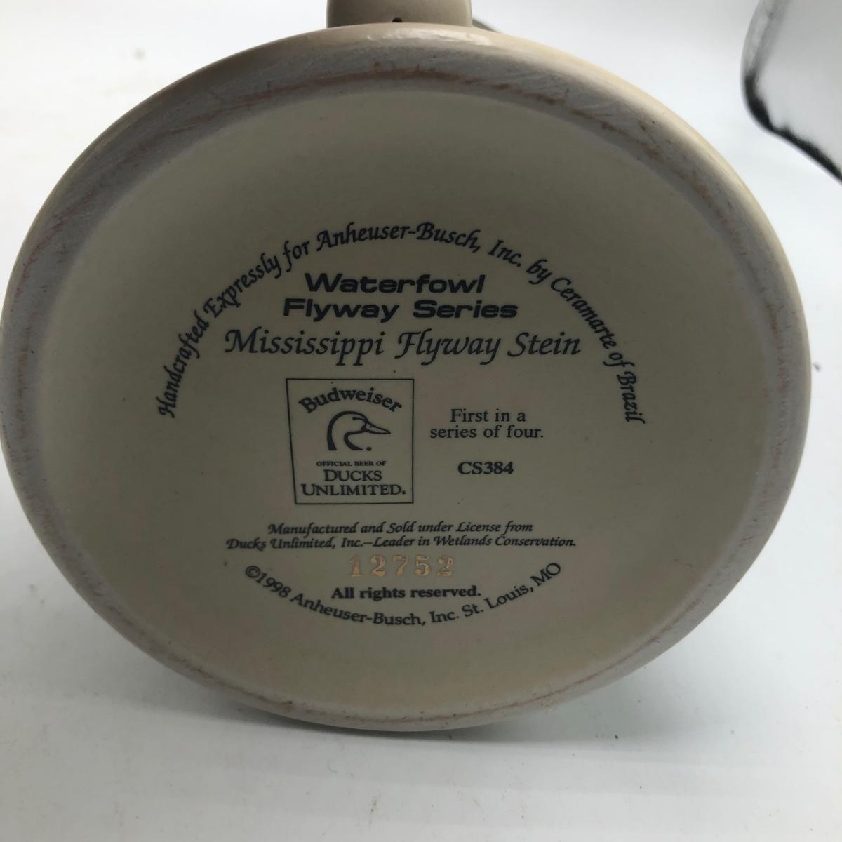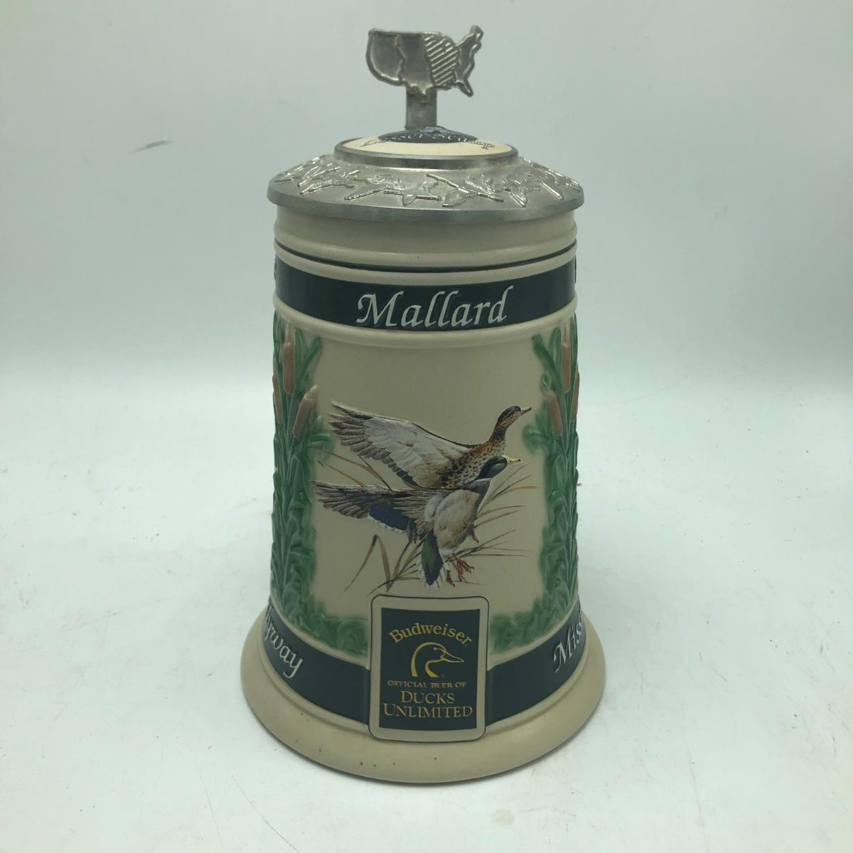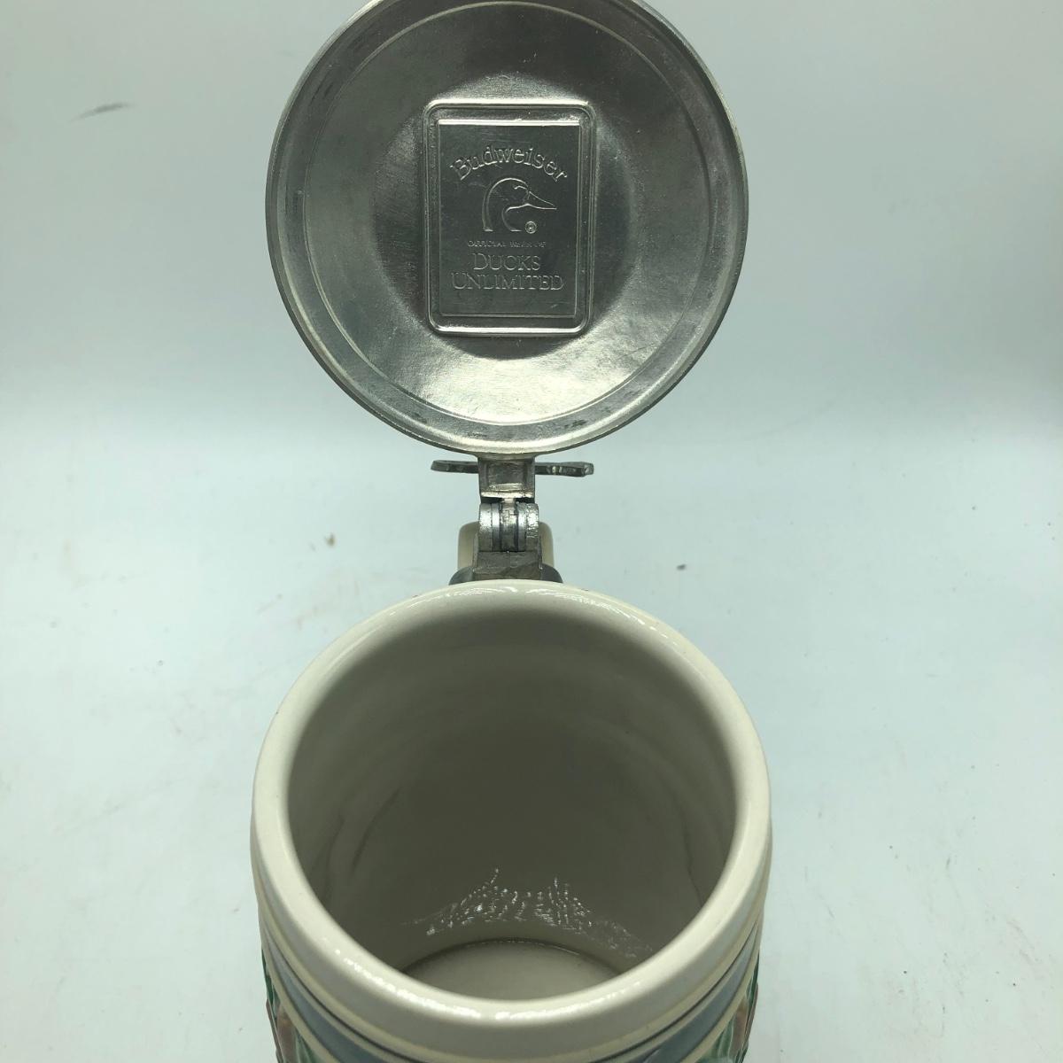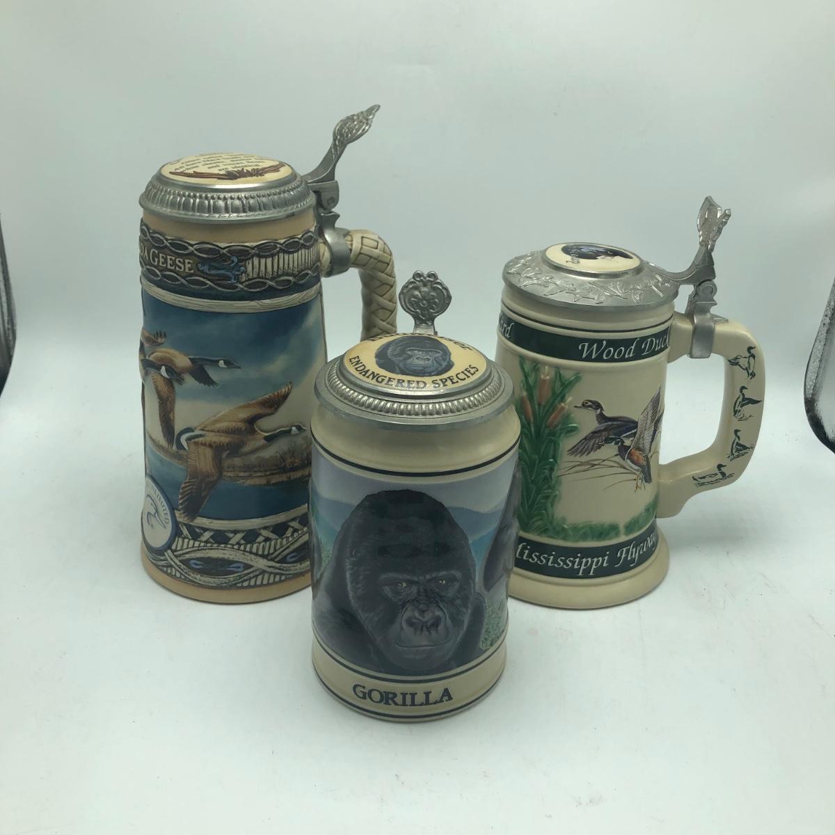 Lot contains three beer steins including Budweiser Endangered Species stein, Budweiser Ducks Unlimited stein and a Ducks Unlimited stein. Largest stein measures 4.5” x 5.5” x 9.5”.