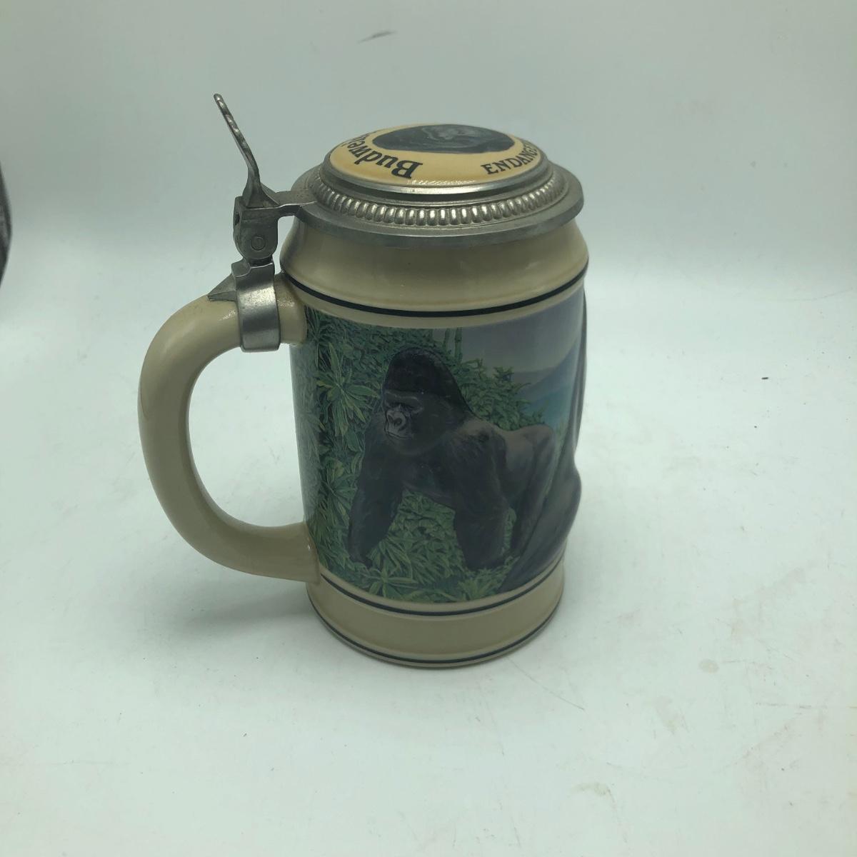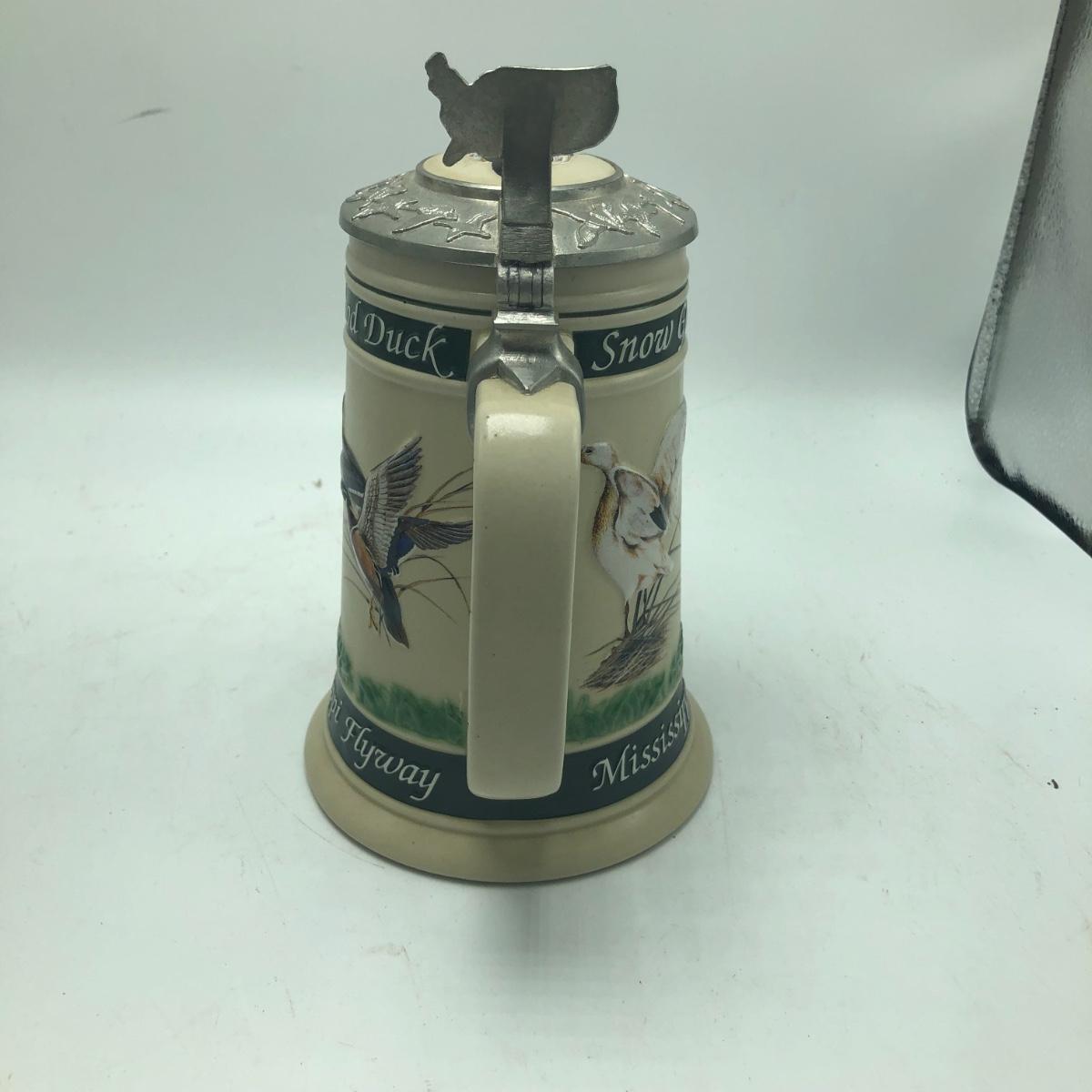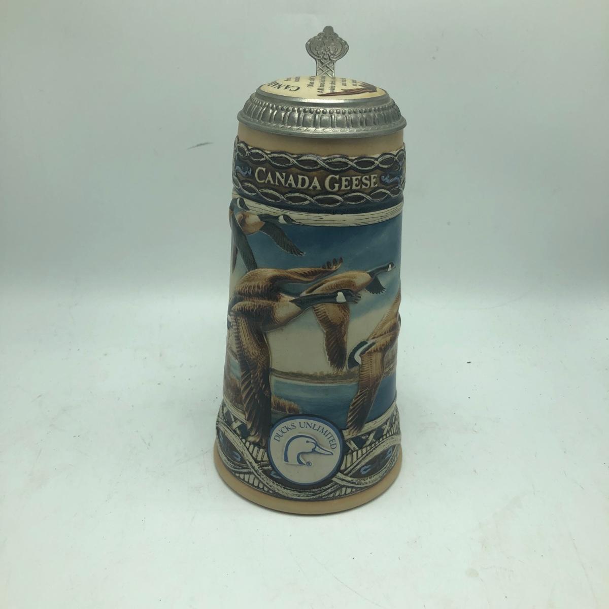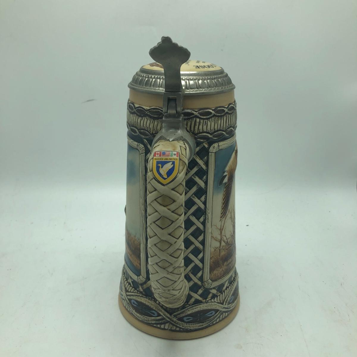 Lot contains three beer steins including Budweiser Endangered Species stein, Budweiser Ducks Unlimited stein and a Ducks Unlimited stein. Largest stein measures 4.5” x 5.5” x 9.5”.