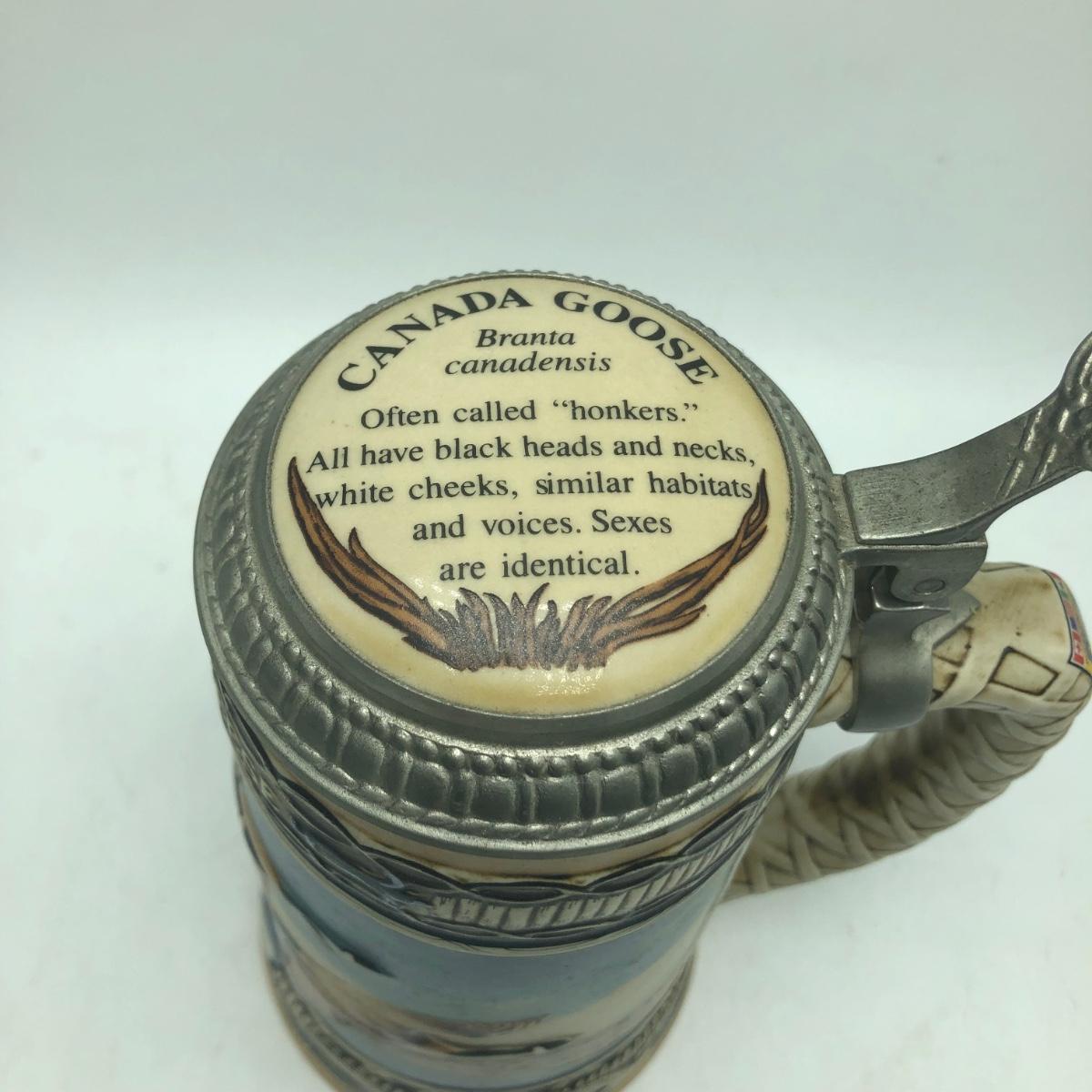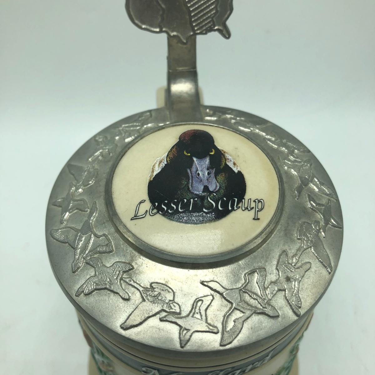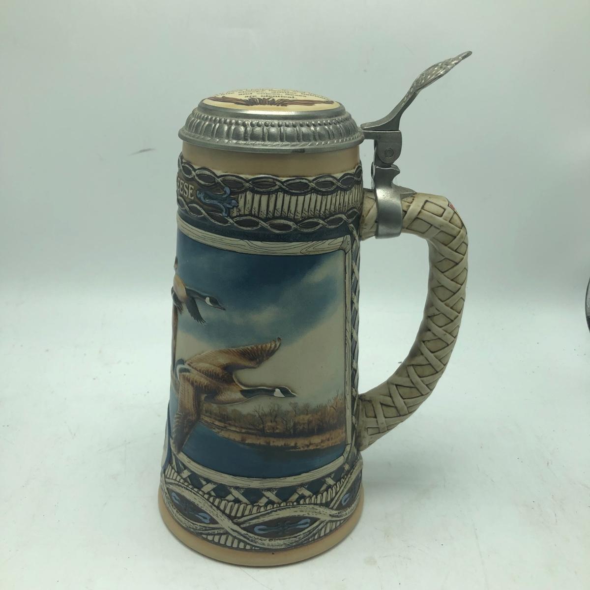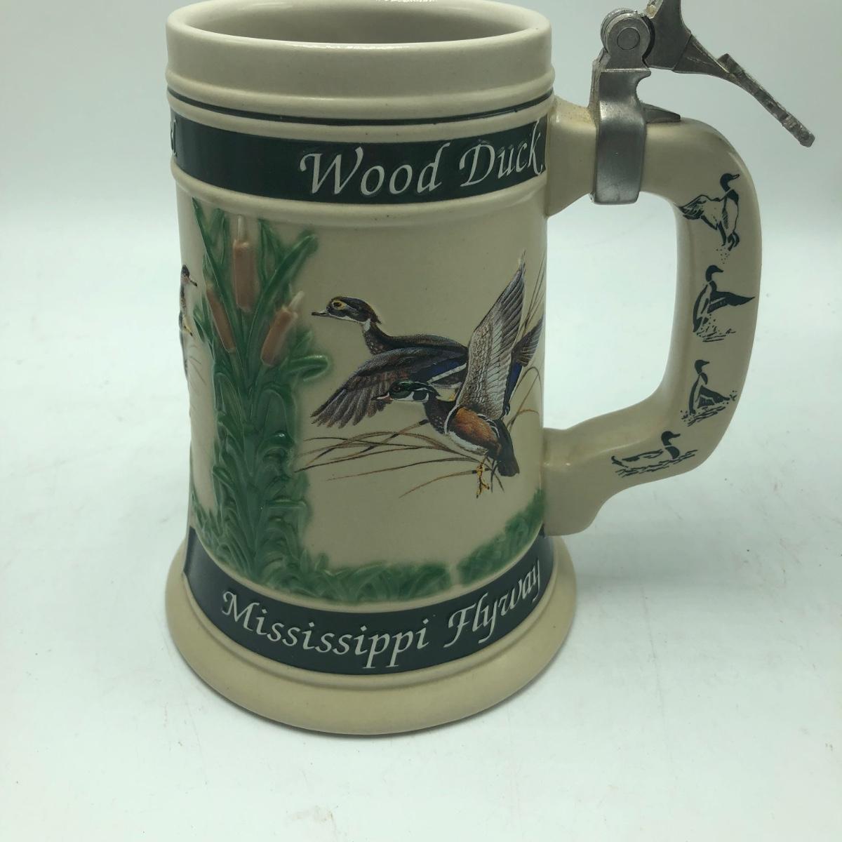 Lot contains three beer steins including Budweiser Endangered Species stein, Budweiser Ducks Unlimited stein and a Ducks Unlimited stein. Largest stein measures 4.5” x 5.5” x 9.5”.