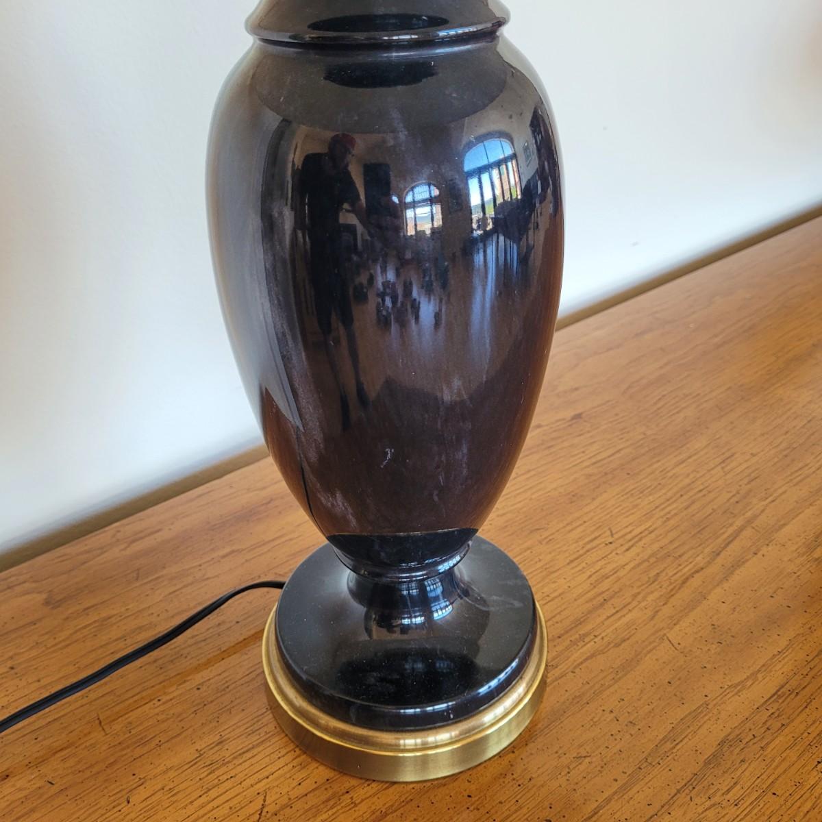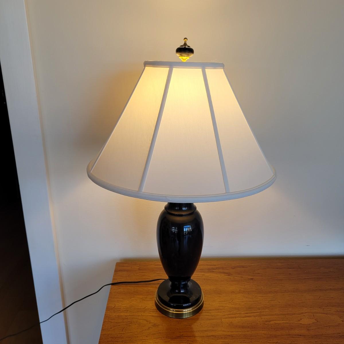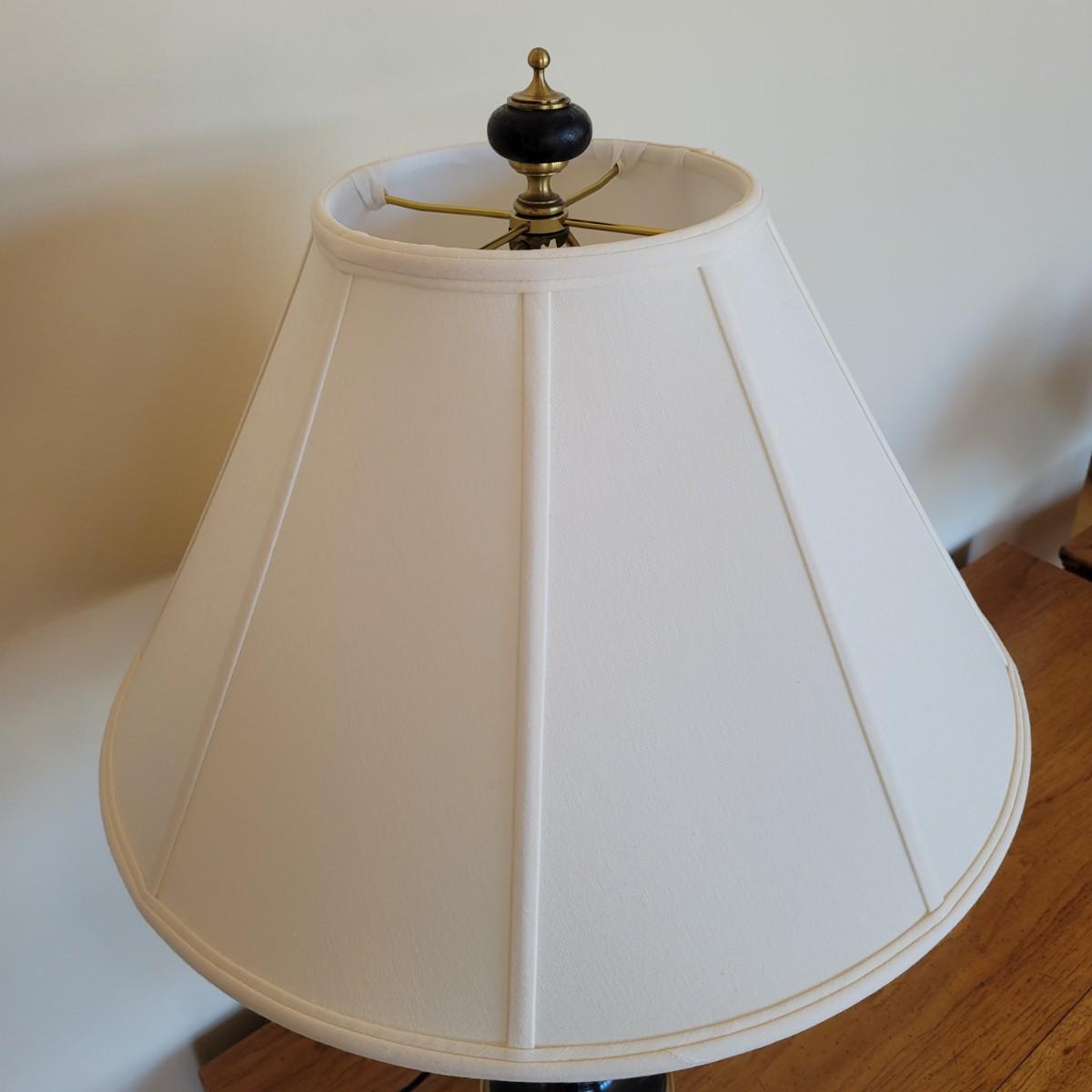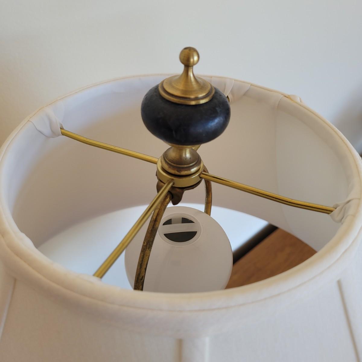 This lot includes a Wildwood Lampholder brand black marble table lamp. The base of the lamp is made from polished metal and it has a heavy black marble body. The lamp shade is made from white fabric and metal. The lamp powered on when plugged in and includes an LED bulb. It measures 18" x 18" x 30"H.