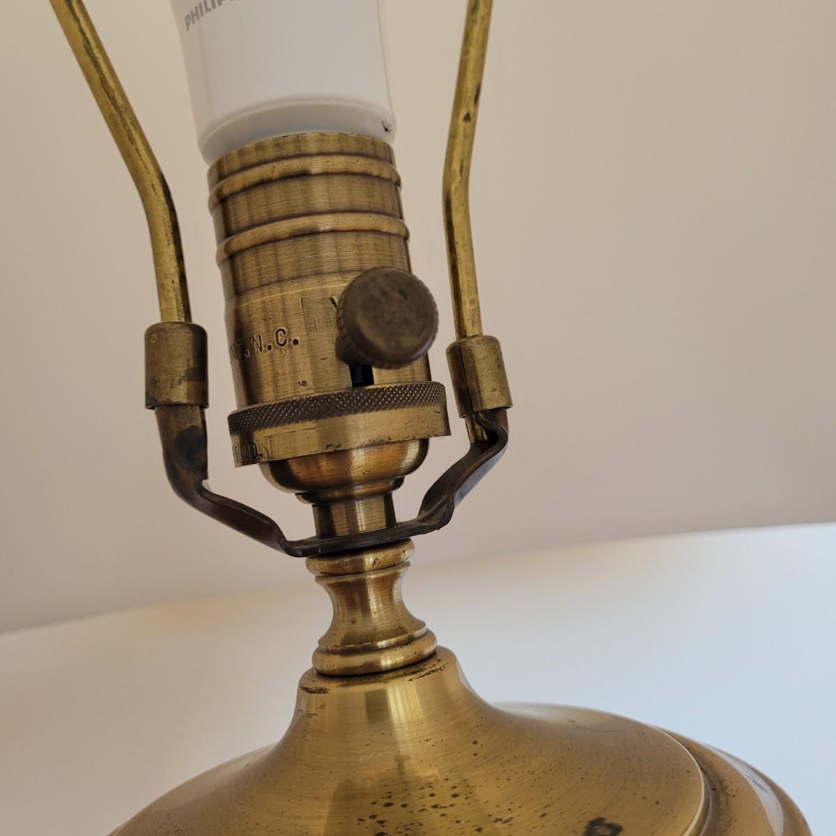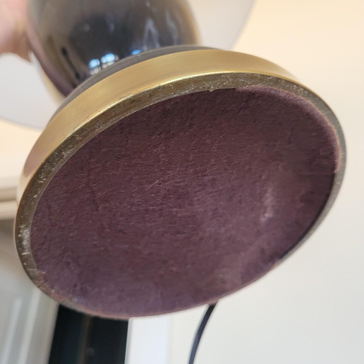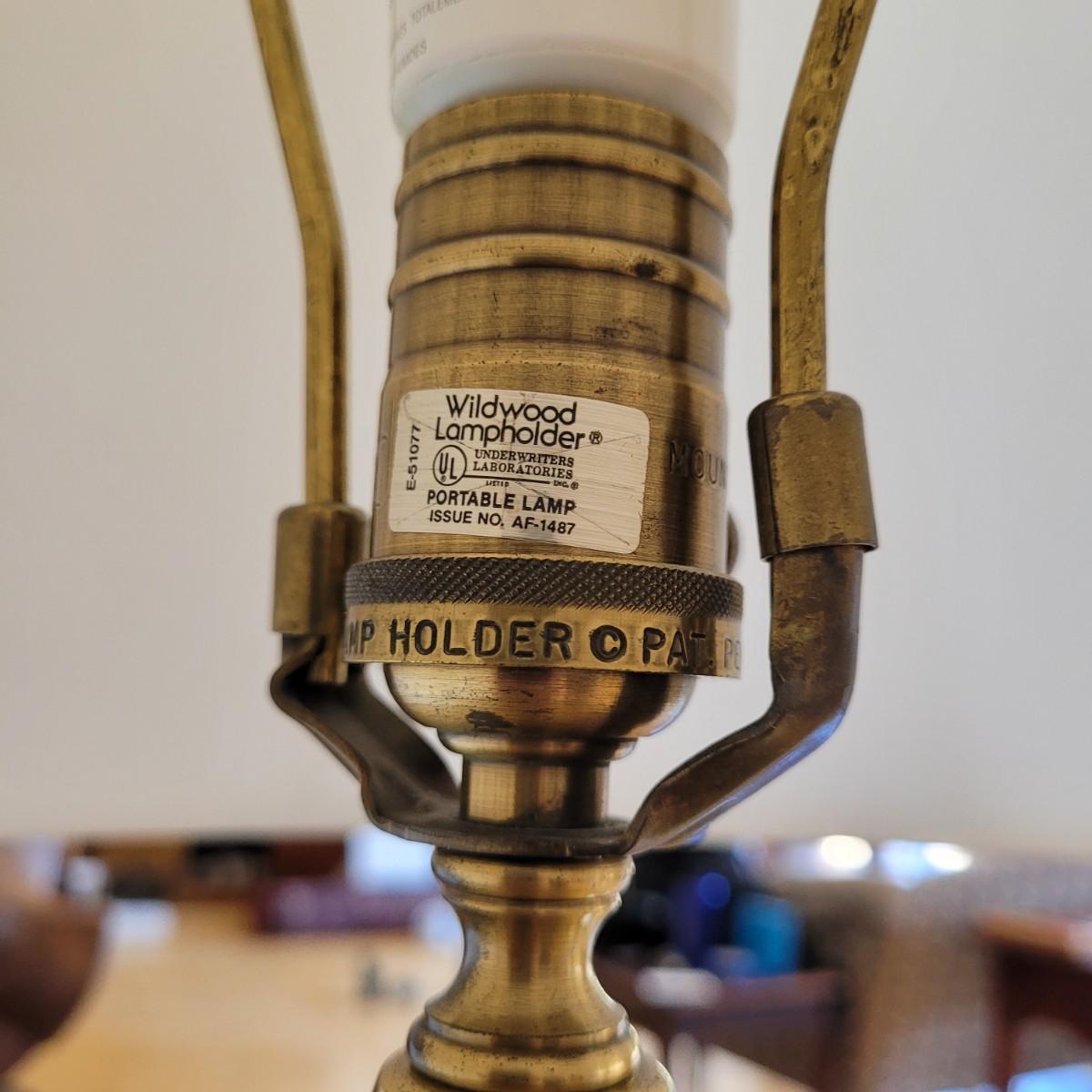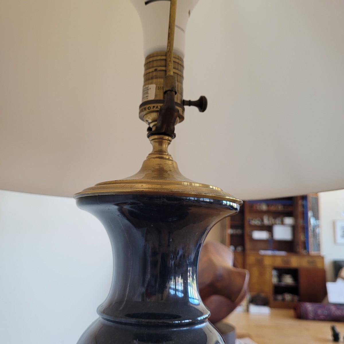 This lot includes a Wildwood Lampholder brand black marble table lamp. The base of the lamp is made from polished metal and it has a heavy black marble body. The lamp shade is made from white fabric and metal. The lamp powered on when plugged in and includes an LED bulb. It measures 18" x 18" x 30"H.