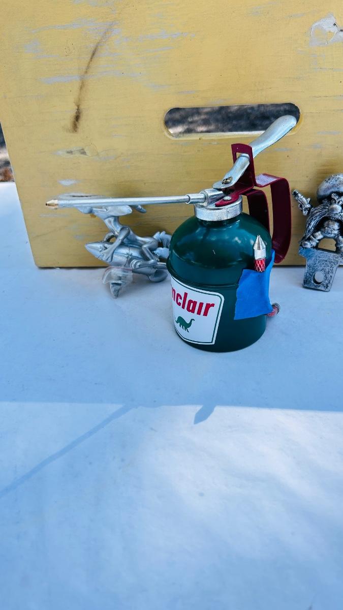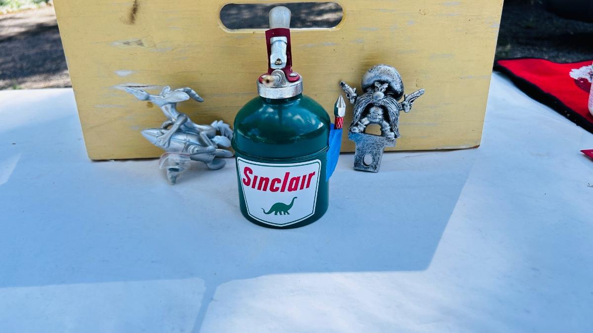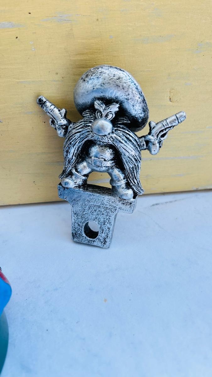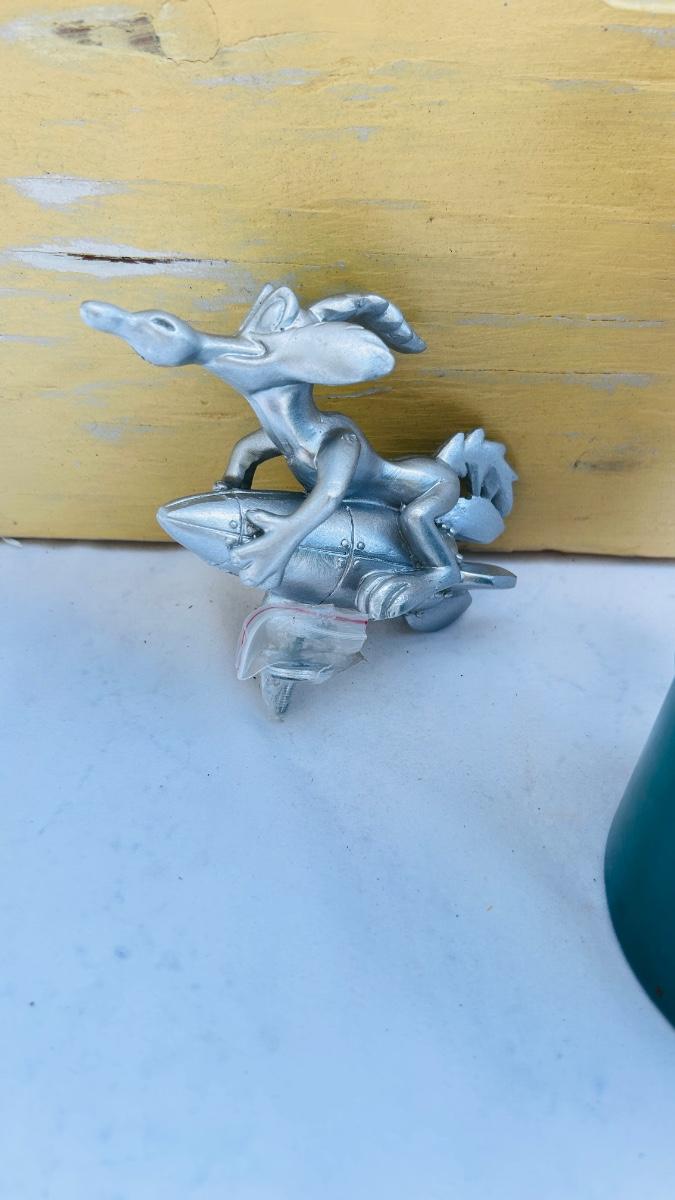 WILEY COYOTE HOOD ORNAMENT, YOSEMITE SAM LICENSE PLATE SWAG, AND SINCLAIR OIL CAN
