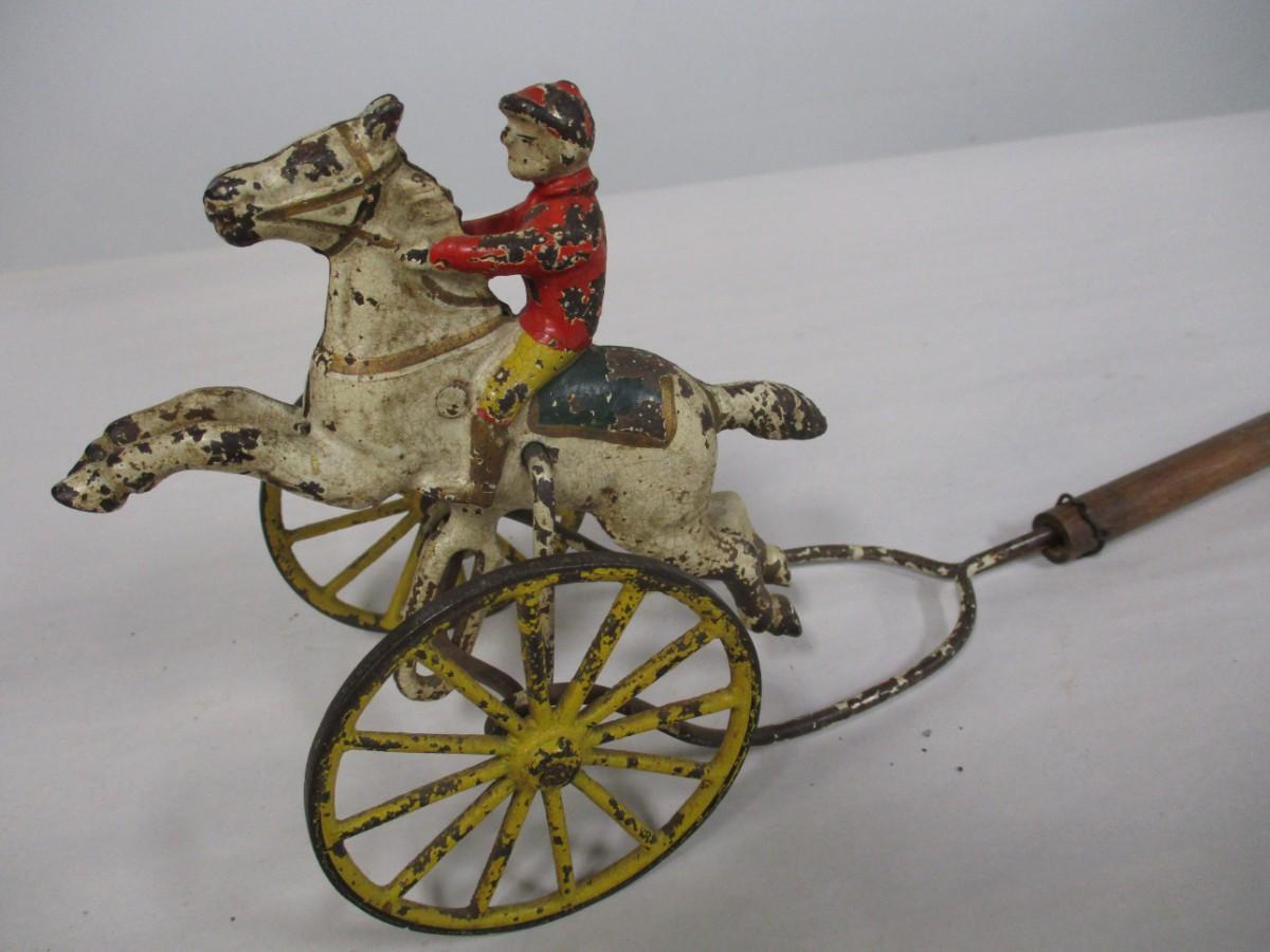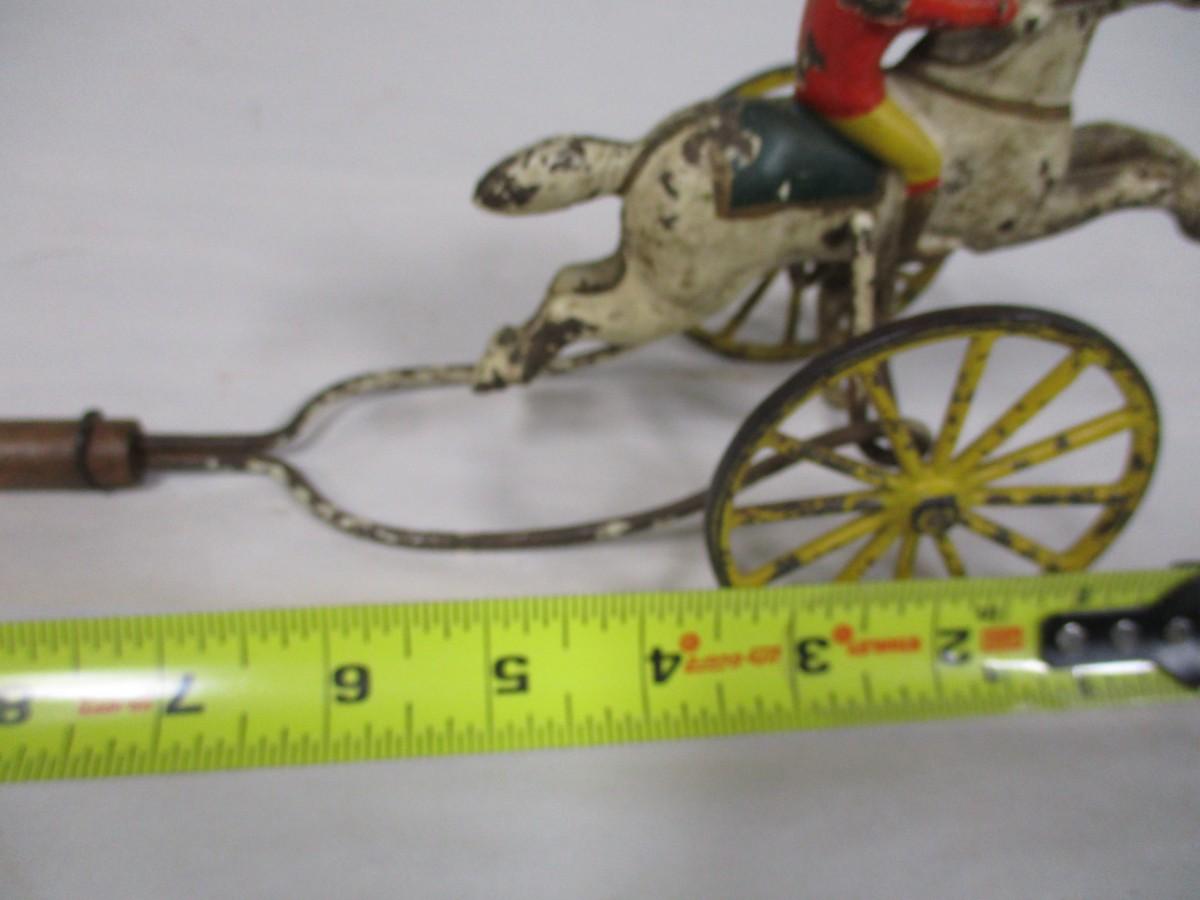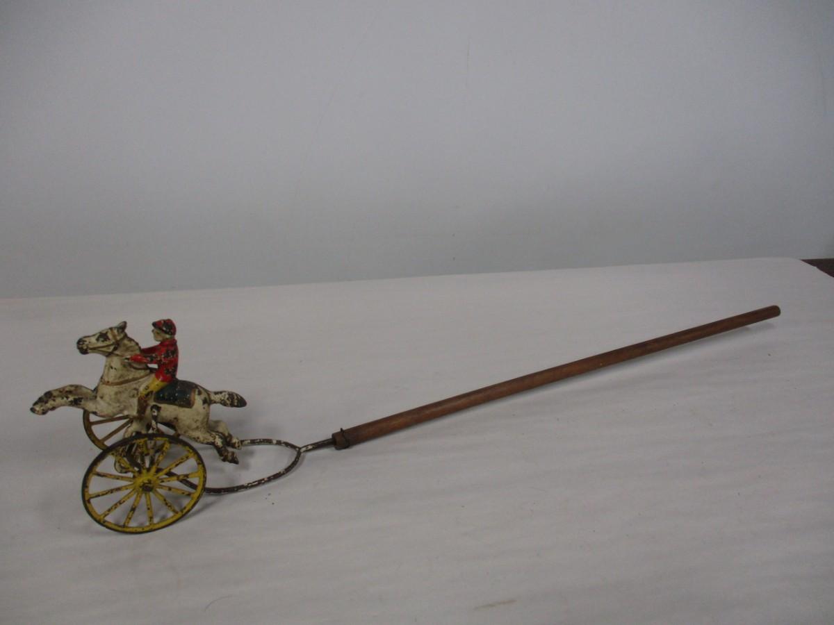 Antique Wilkens Cast Iron Racehorse Push Toy includes Hand Rod