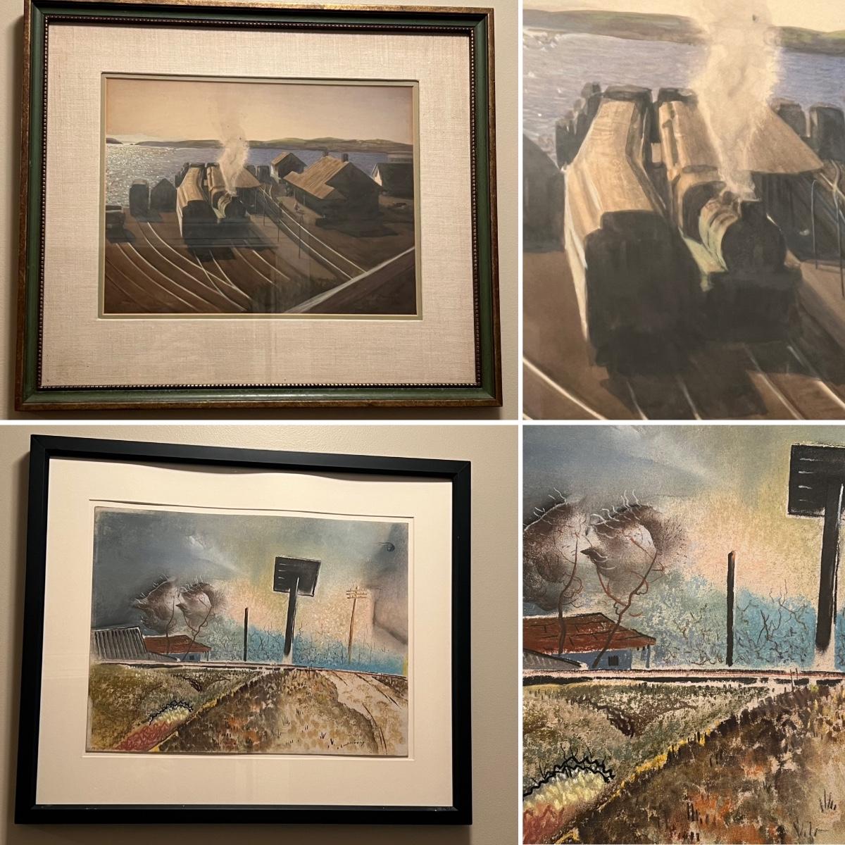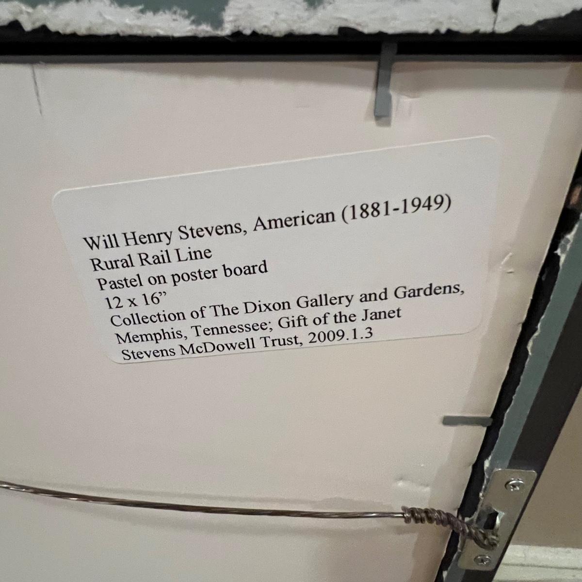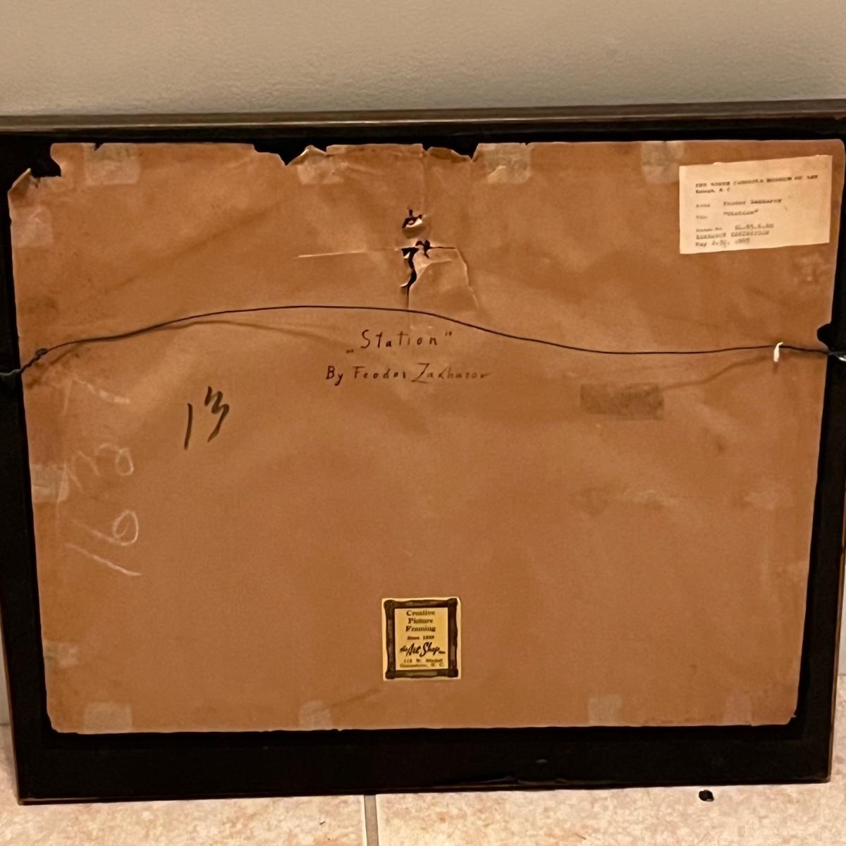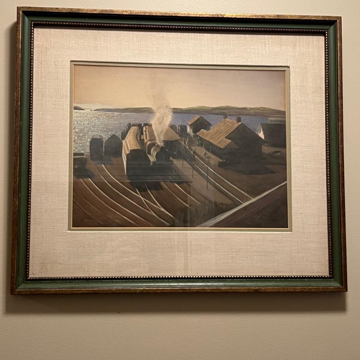 Two framed paintings. The Will Henry Steven’s ‘Rural Rail Line’ is a pastel on poster board. Please note there is a slight ripple in this art including the mat. The other painting is by Feoder Zakharov and is titled ‘Station’. It appears to be a watercolor dated 1935. Both are signed plus more information on the backs, see photos. Both are under glass with one mounted in a modern black resin frame, the other has a vintage wooden frame.
