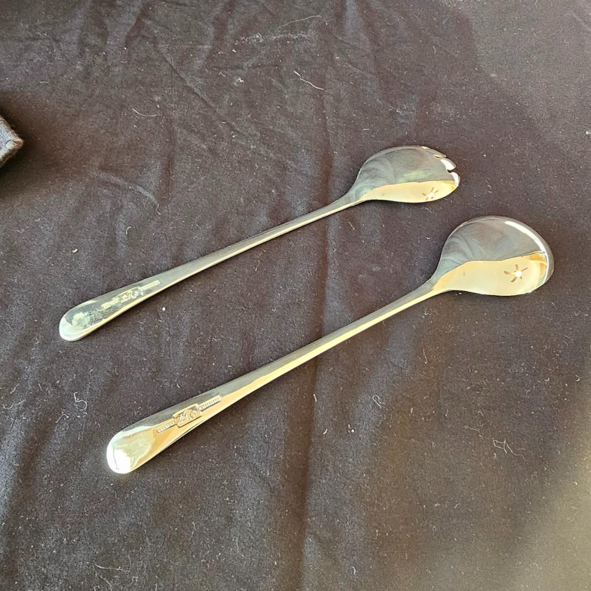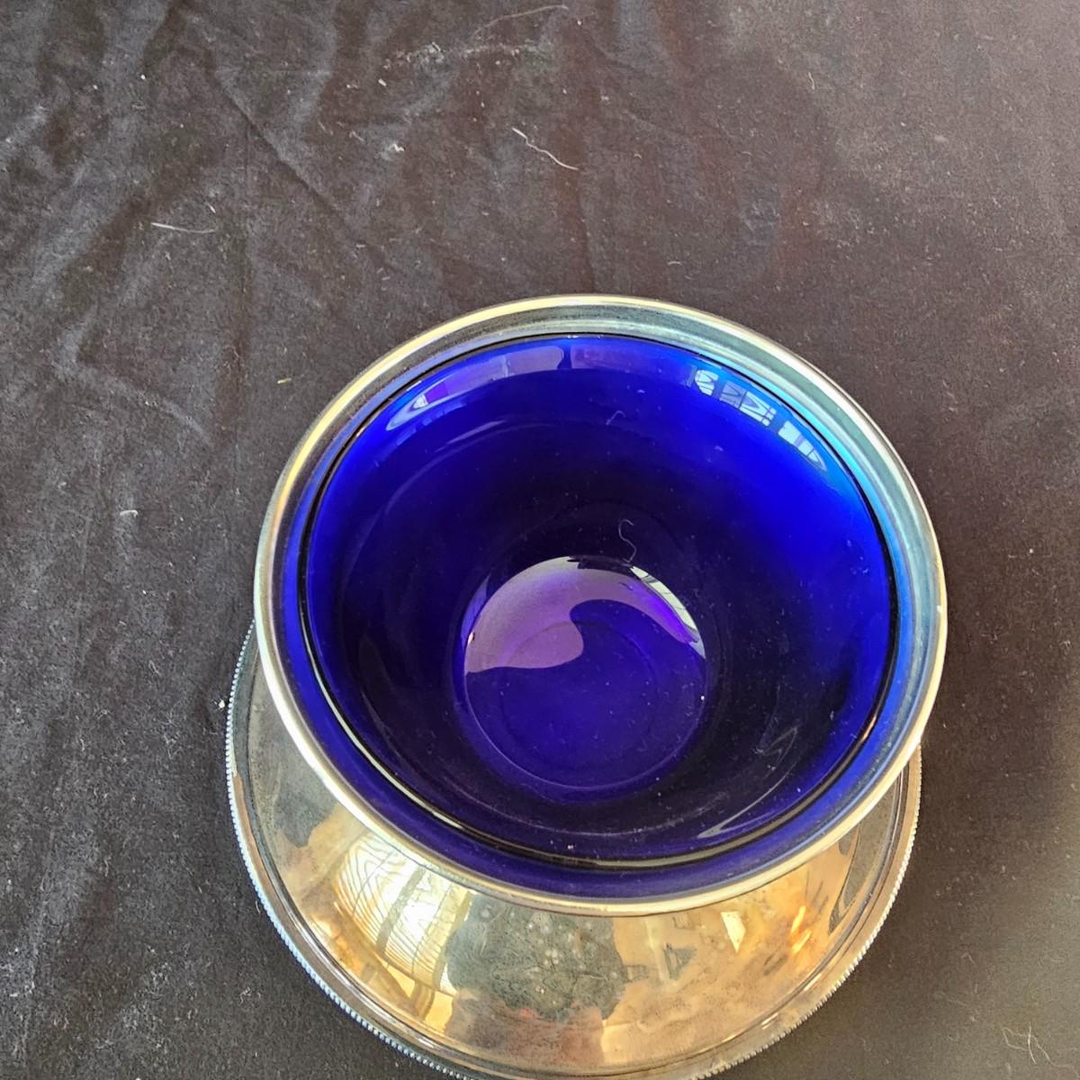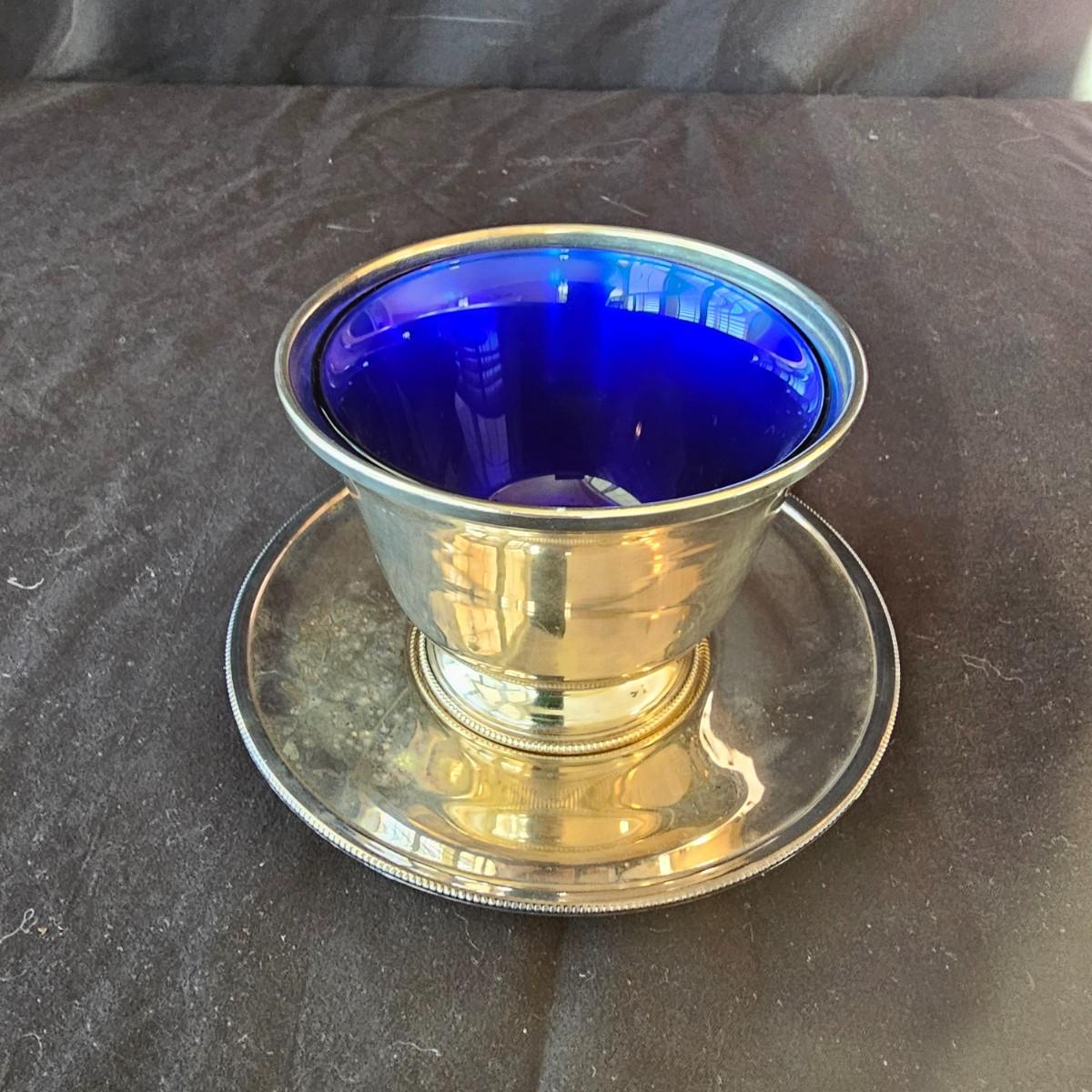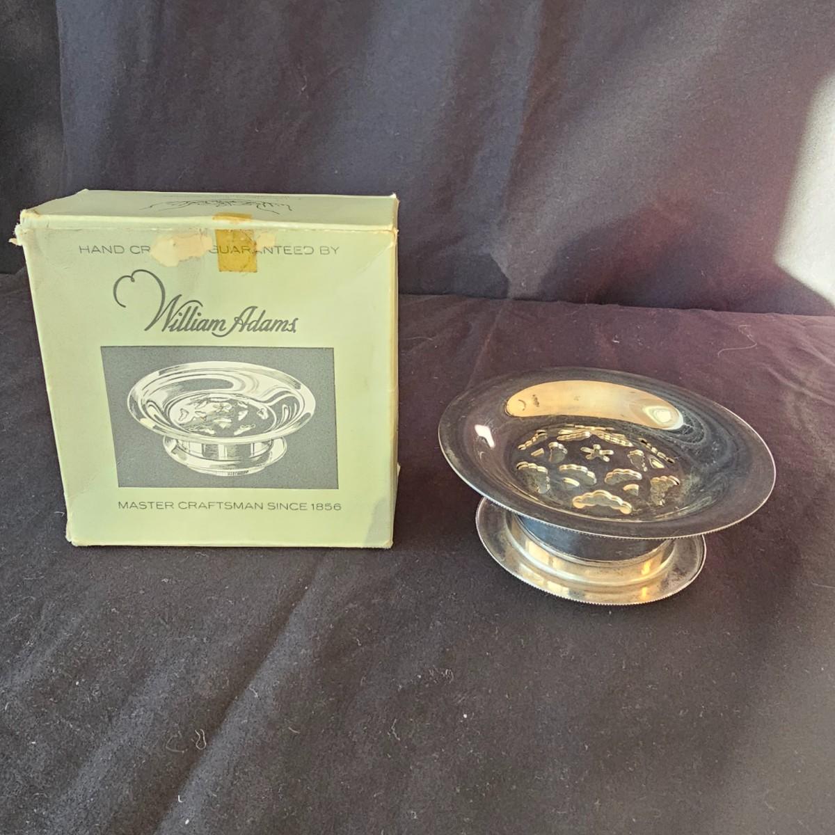 Four pieces of silver plate serving ware by William Adams.. Unique butter curler that produces extruded shapes for elegant dining. Item comes with complete instructions on box, measures 4.5"D x 2"H. Silverplate cup/saucer and cobalt blue glass insert measures 5 5" D x 3"H. Two salad spoons in monogram pouch both 9.5" long. All items bear WA marks and logos. Some tarnish and discoloration. See photos for details. Shipping available.