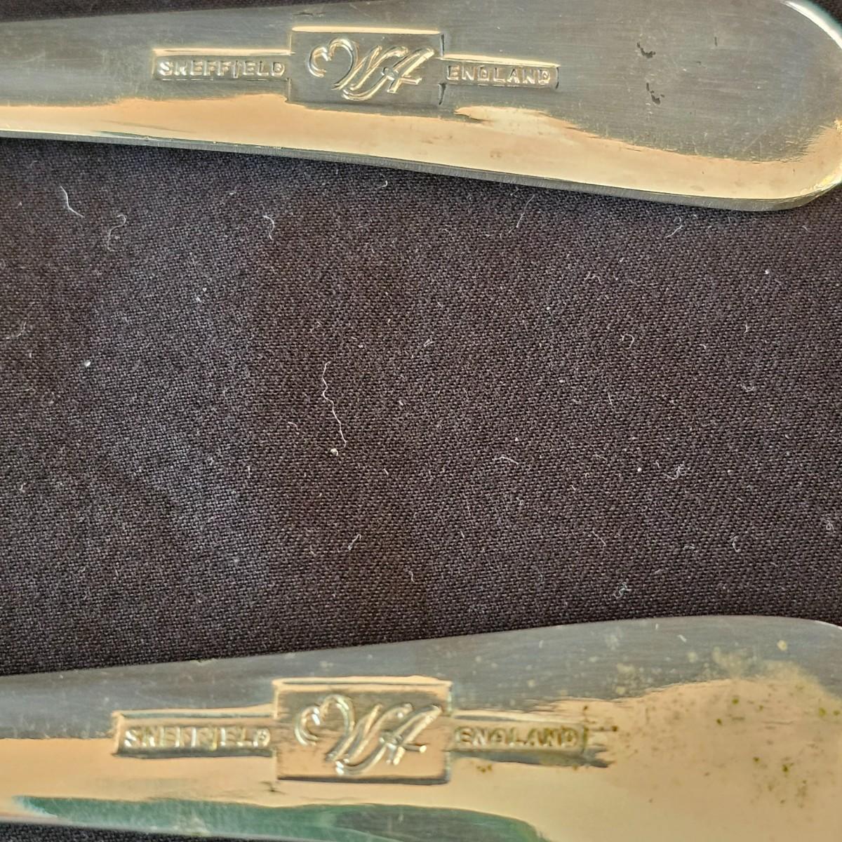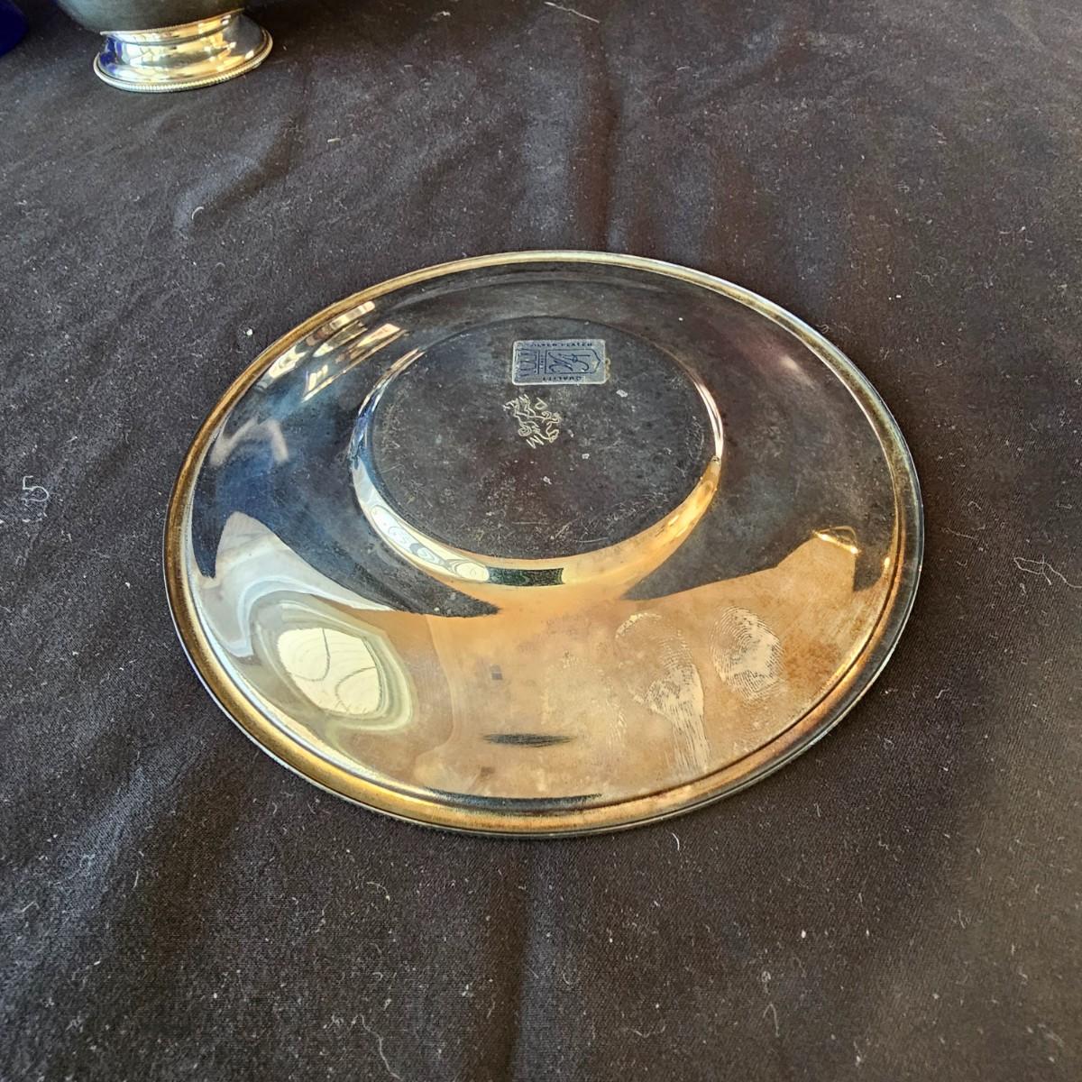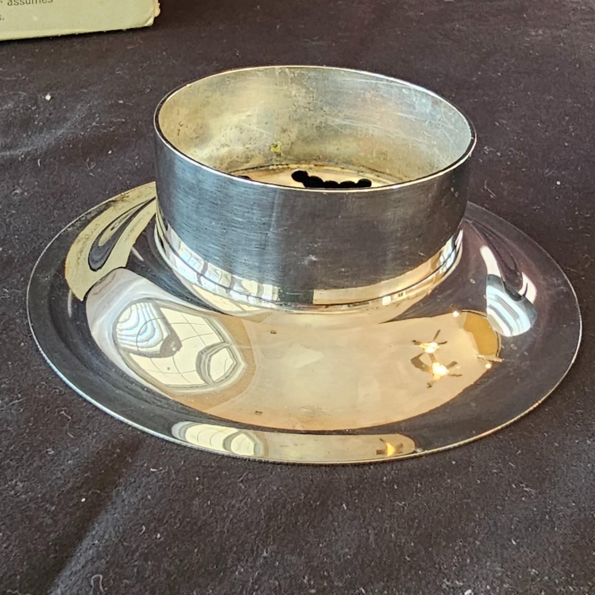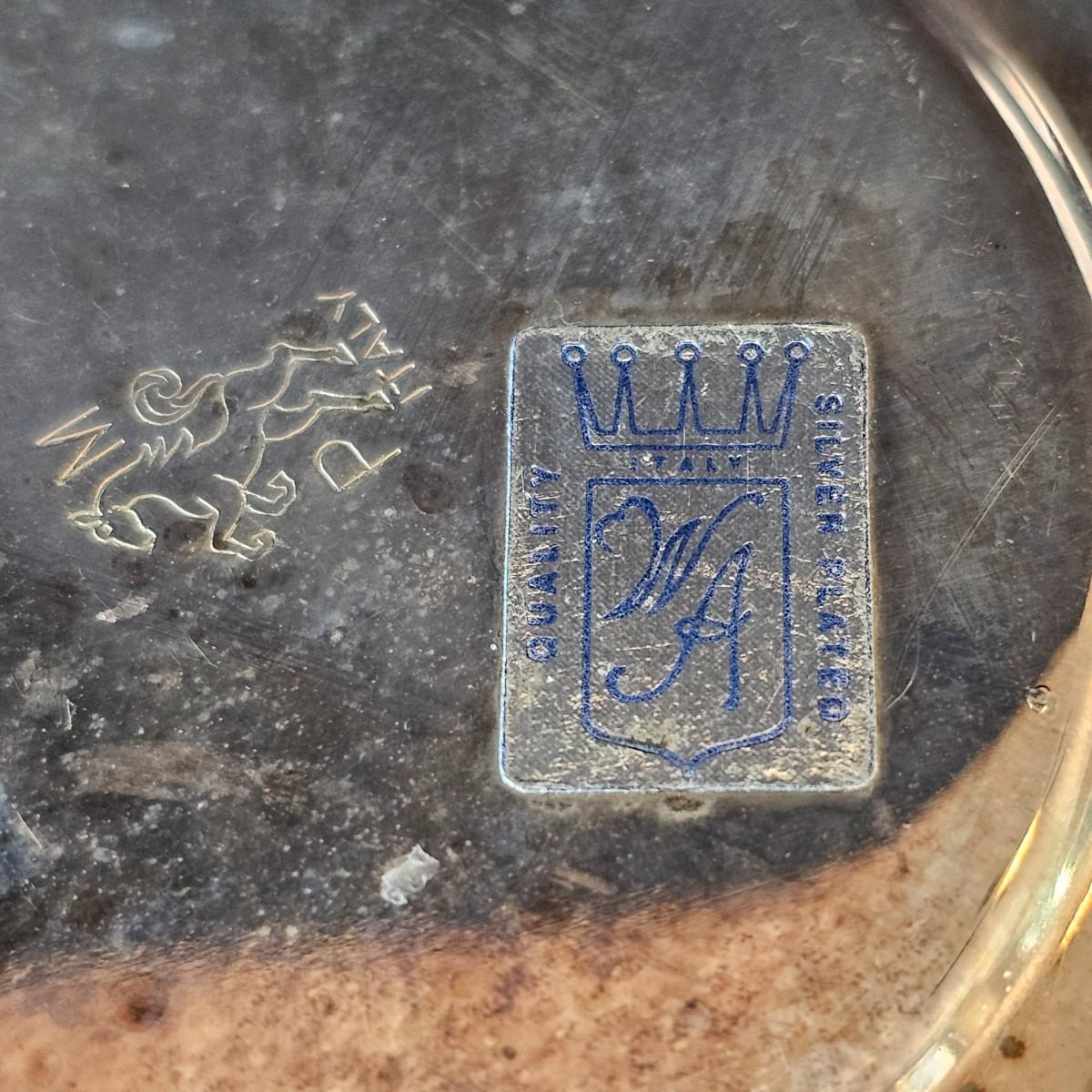 Four pieces of silver plate serving ware by William Adams.. Unique butter curler that produces extruded shapes for elegant dining. Item comes with complete instructions on box, measures 4.5"D x 2"H. Silverplate cup/saucer and cobalt blue glass insert measures 5 5" D x 3"H. Two salad spoons in monogram pouch both 9.5" long. All items bear WA marks and logos. Some tarnish and discoloration. See photos for details. Shipping available.