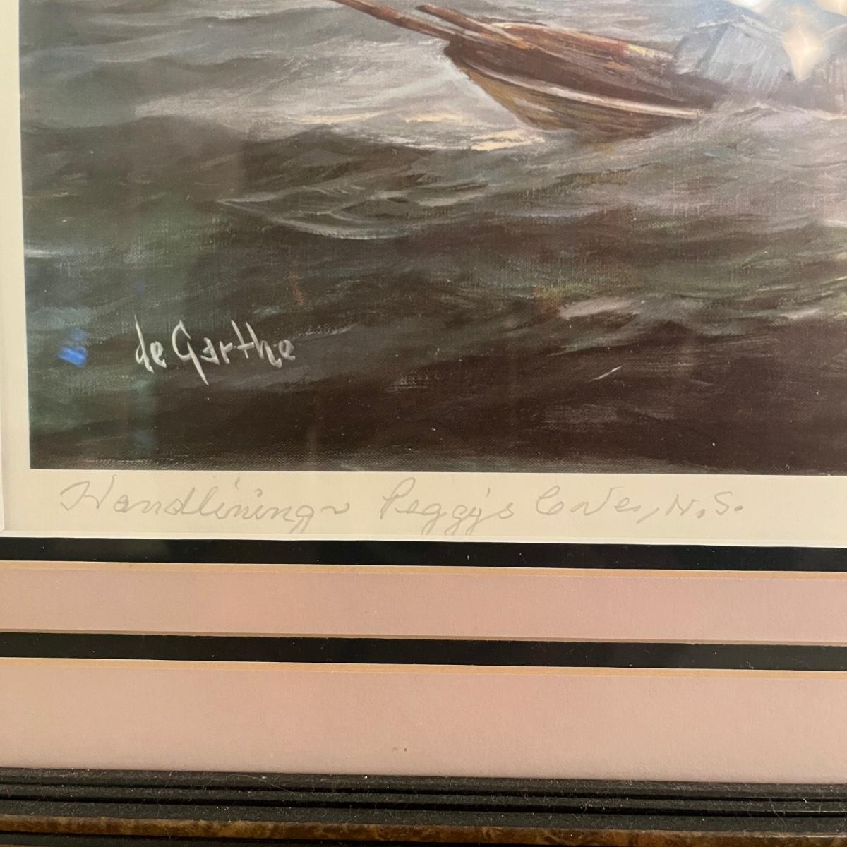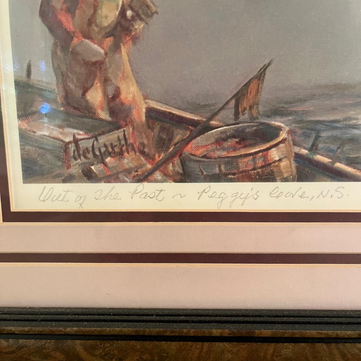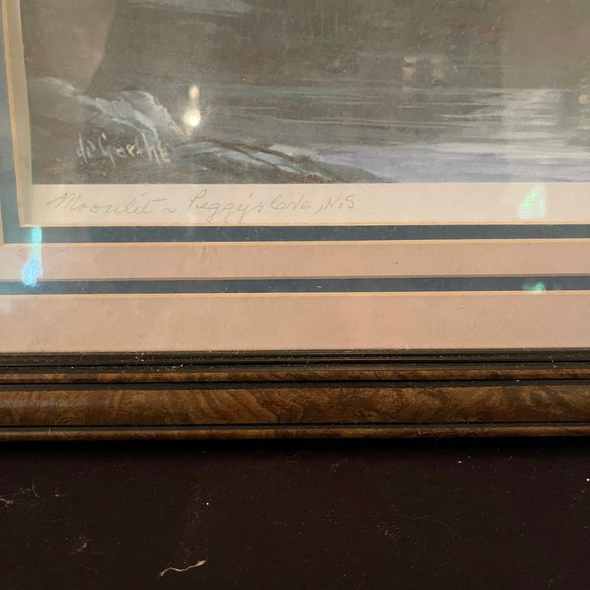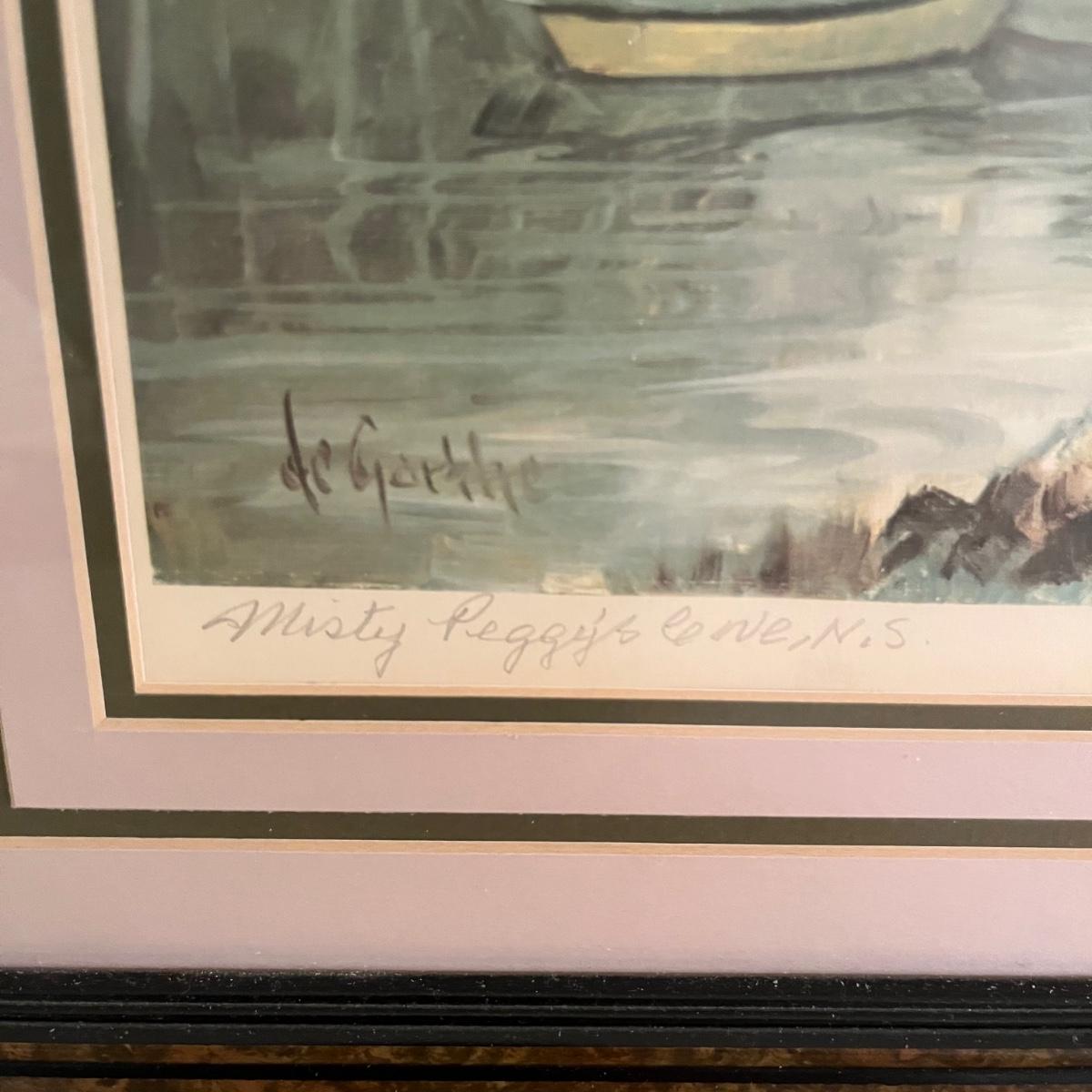 Lot includes five framed and matted prints by William DeGarthe. Titles are Handlining Peggy’s Cove N.S., Sheds on Peggy’s Cove N.S., Misty Peggy’s Cove, Moorilet Peggy’s Cove N.S. and Out of the Past Peggy’s Cove N.S. Largest frame measures 18” x 21.5”. Frames are wooden.
