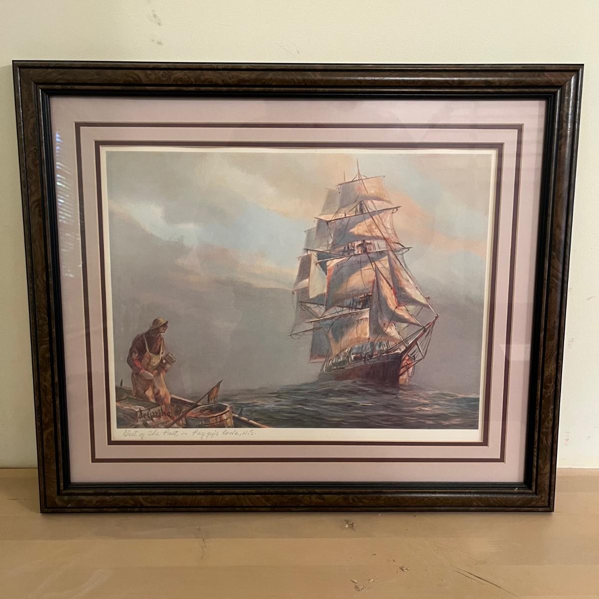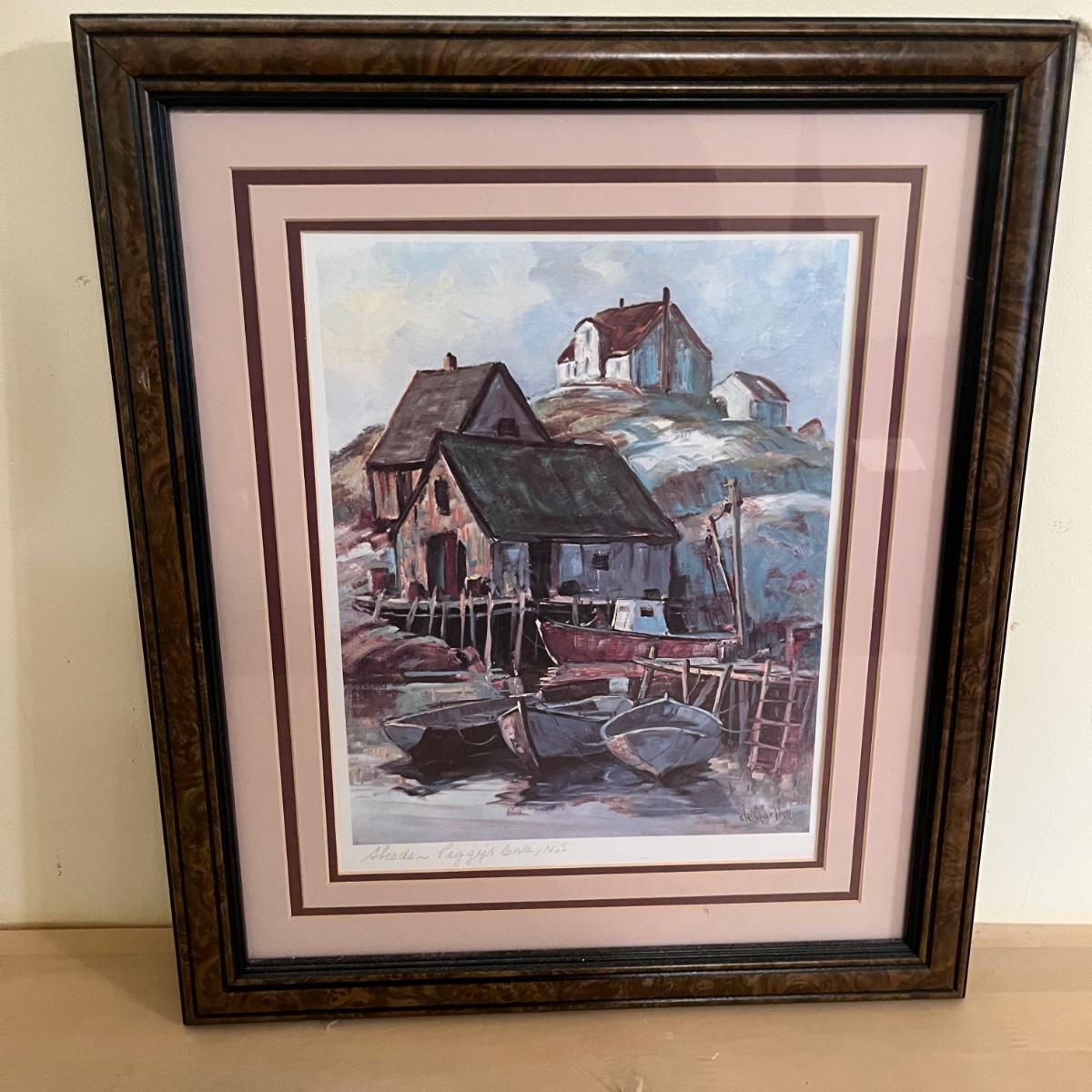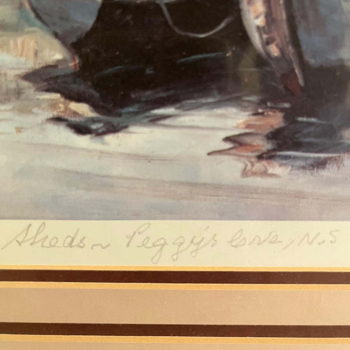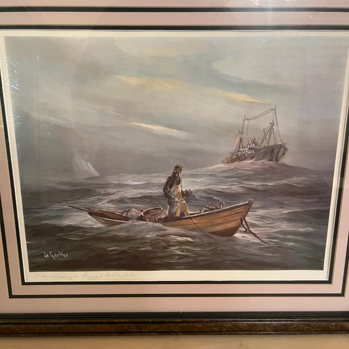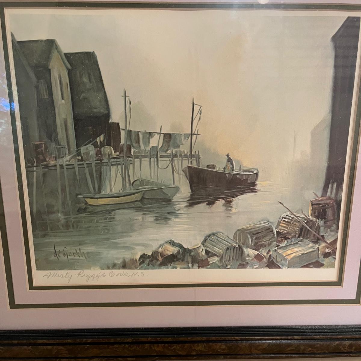 Lot includes five framed and matted prints by William DeGarthe. Titles are Handlining Peggy’s Cove N.S., Sheds on Peggy’s Cove N.S., Misty Peggy’s Cove, Moorilet Peggy’s Cove N.S. and Out of the Past Peggy’s Cove N.S. Largest frame measures 18” x 21.5”. Frames are wooden.
