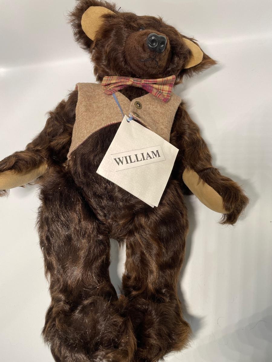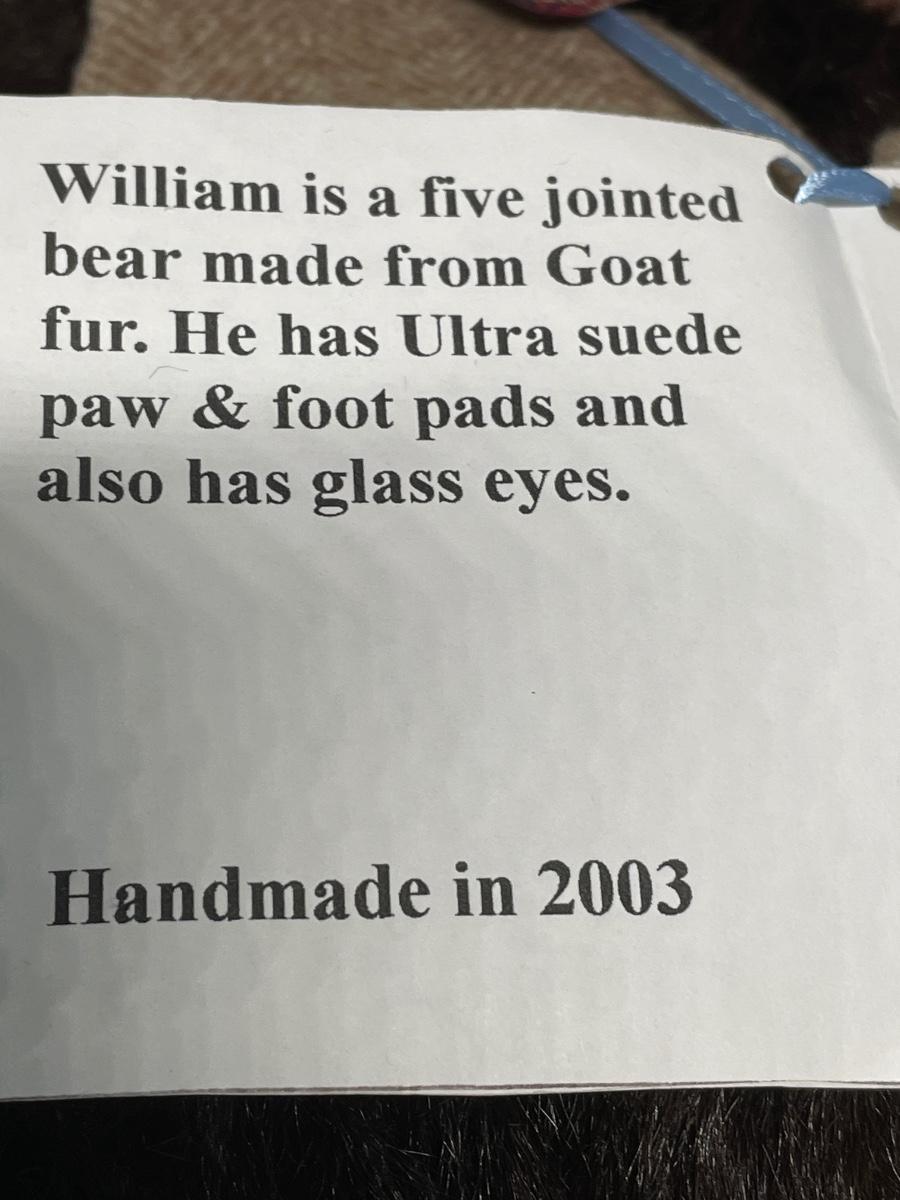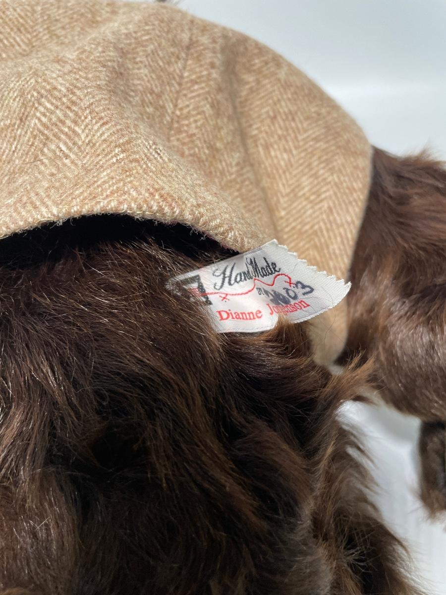 Made by Dianne Jorgenson. Glass eyes, suede paw footpads & goat fur. 19” tall