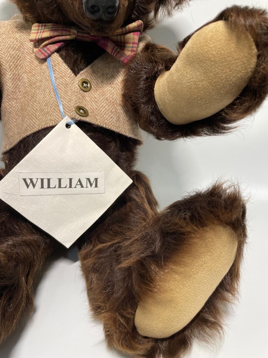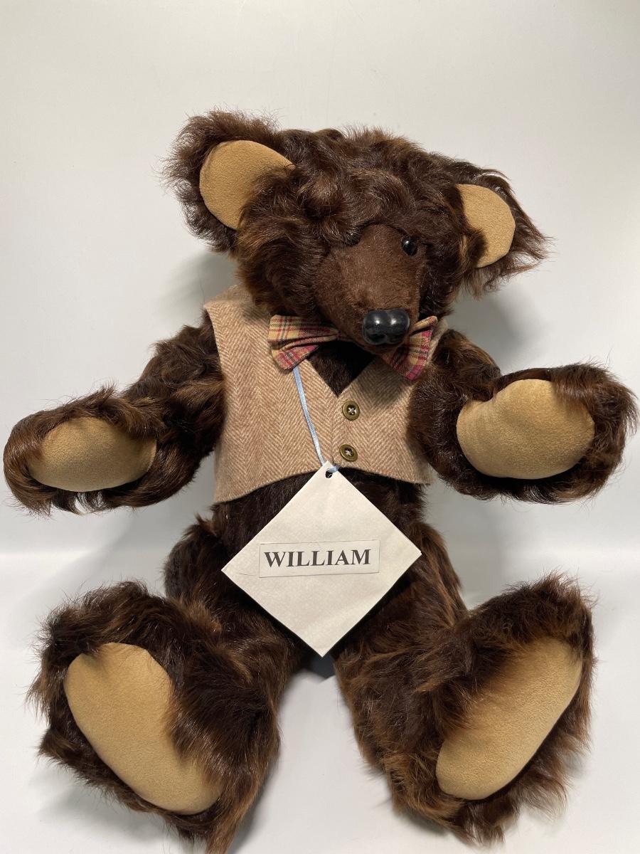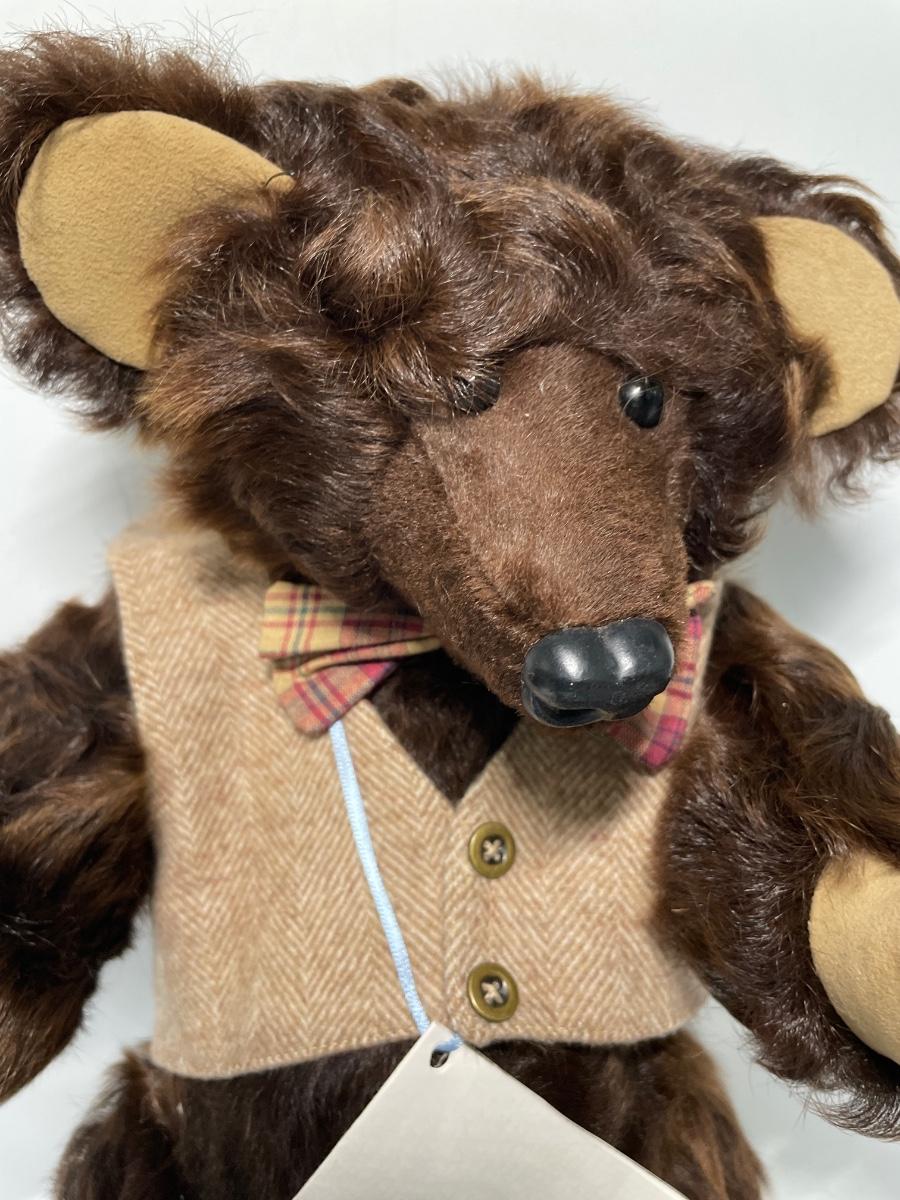 Made by Dianne Jorgenson. Glass eyes, suede paw footpads & goat fur. 19” tall