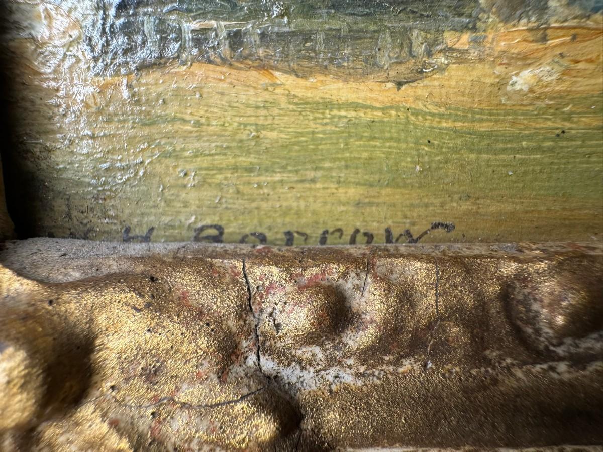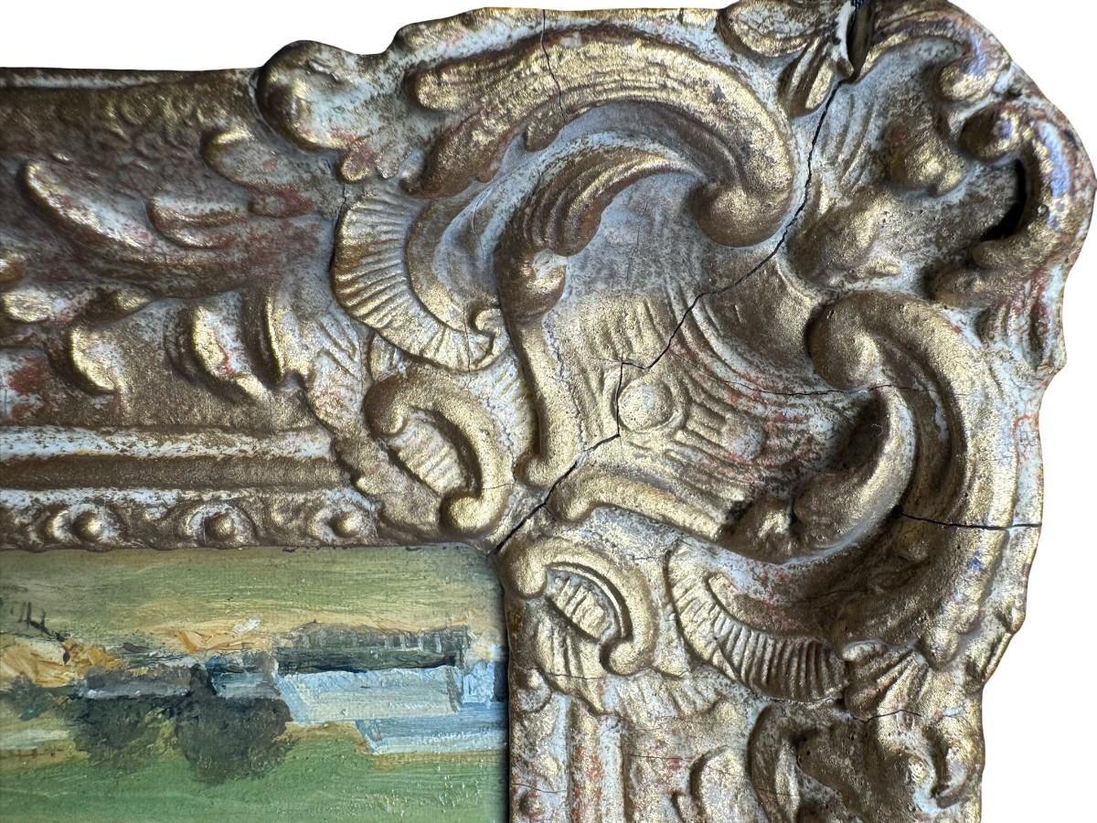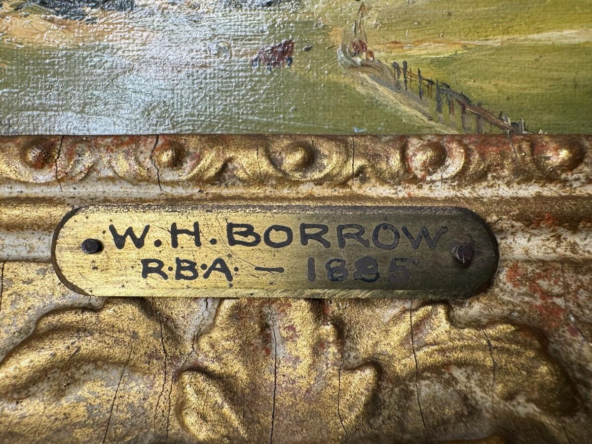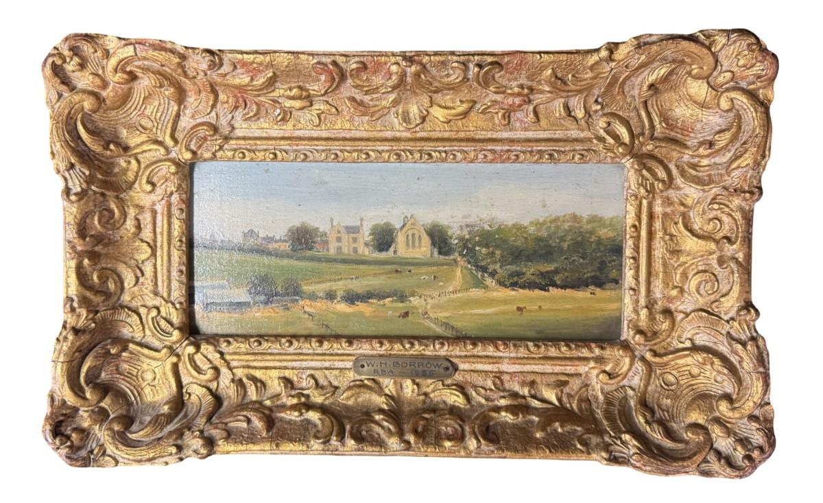 Signed W.H. Borrow in the bottom left corner. This is a landscape scene with farms and estate in the background. The gesso frame has some cracking throughout, commensurate with age. Measurement: 16”W x 10”H. Pre-auction estimate: $300-$500. [JP]