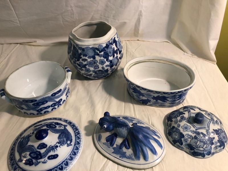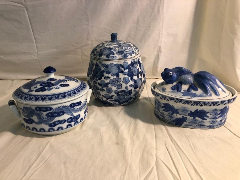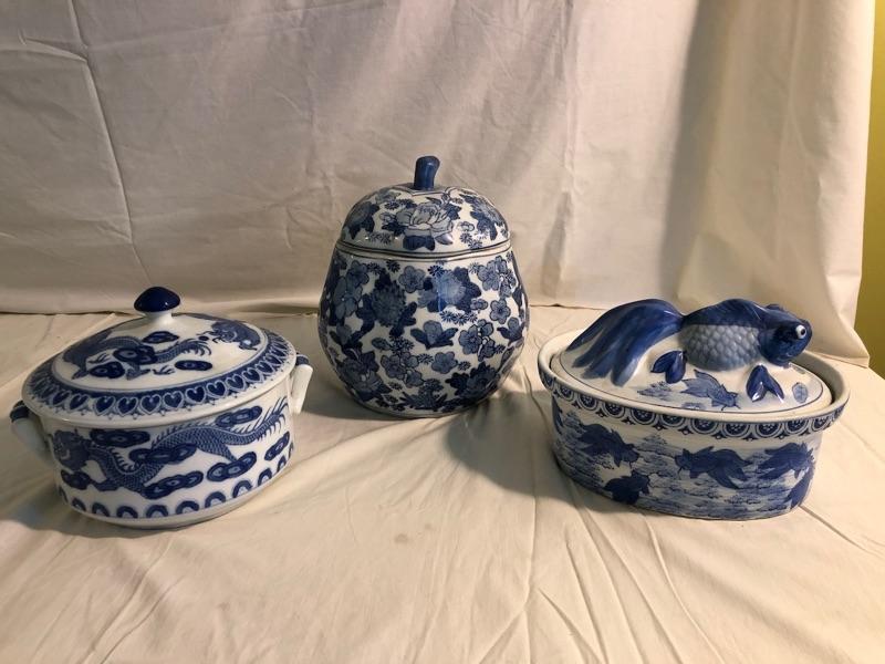 2 ceramic casserole dishes with decorative lids in asian style along with blue and white asian style storage jar all from William Sonoma Dragon caserole is 7in bowl and 7in tall to top of lid, fish casserole is 9in wide on oval and 7in tall to top of fish, the storage jar is 10in tall with 9in diameter at it’s widest