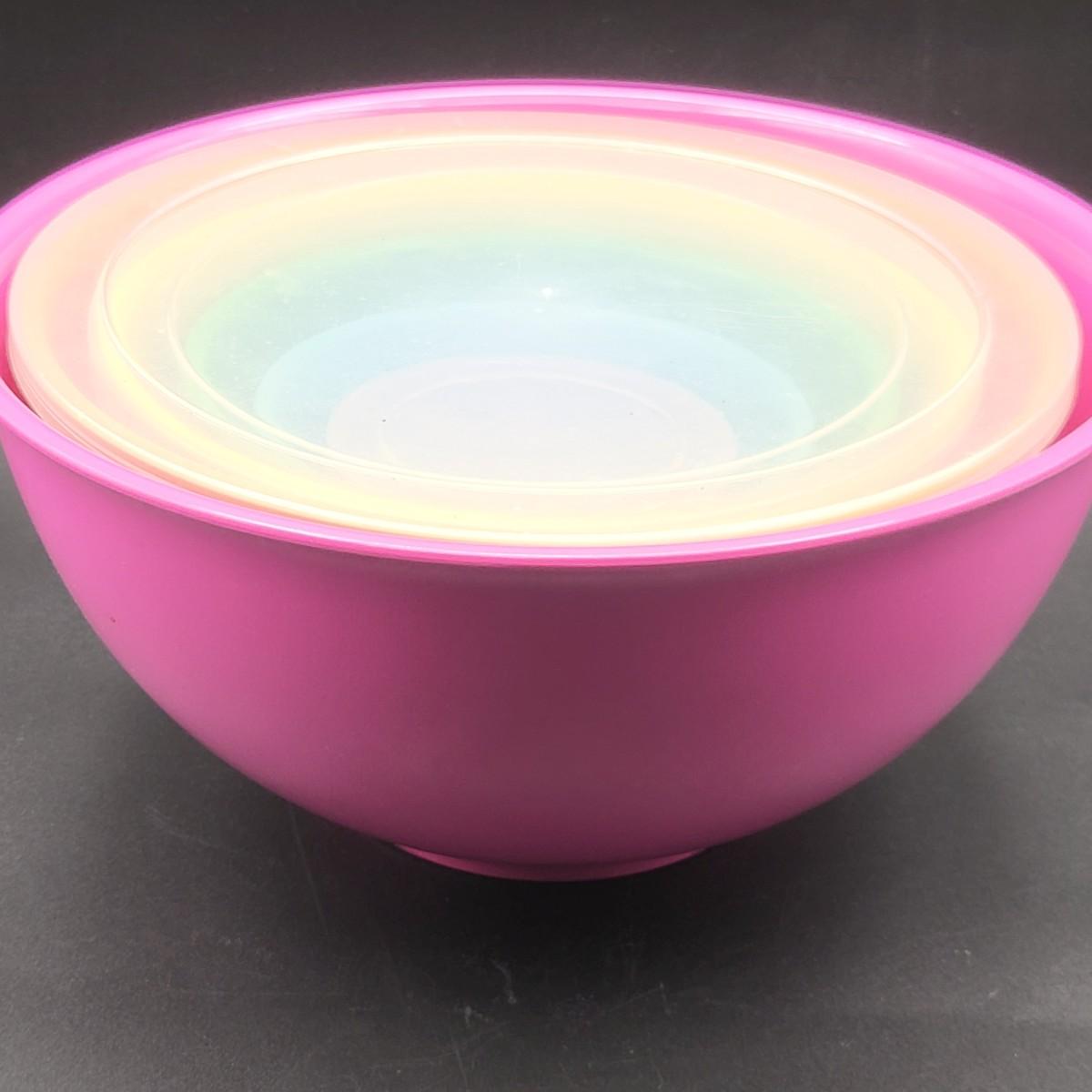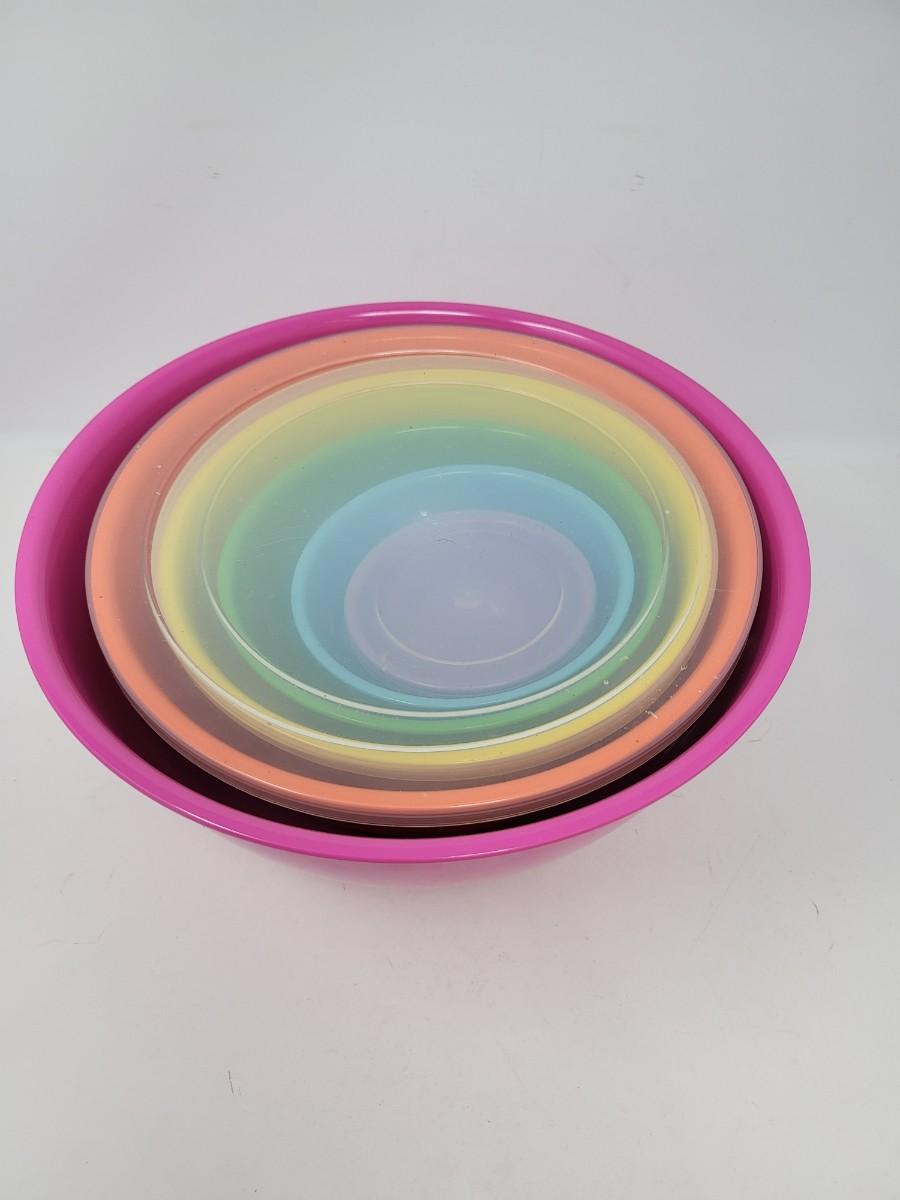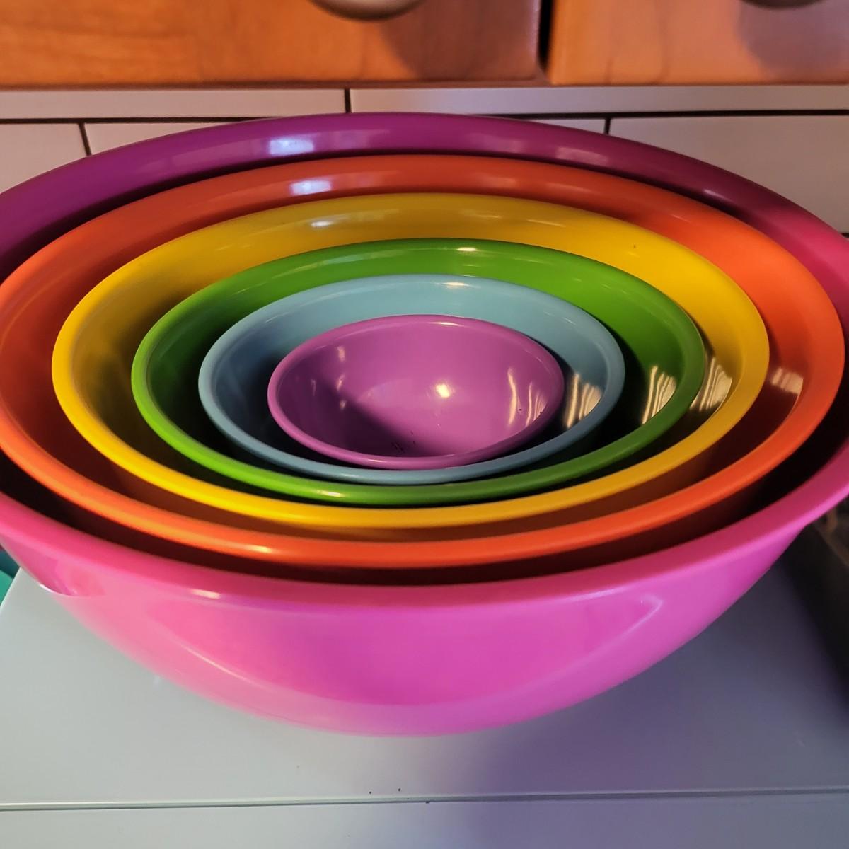 Set of six William Sonoma nesting mixing bowls. Some have lids. Largest bowl is 11.5" x 5.5" and smallest 4" x 2".