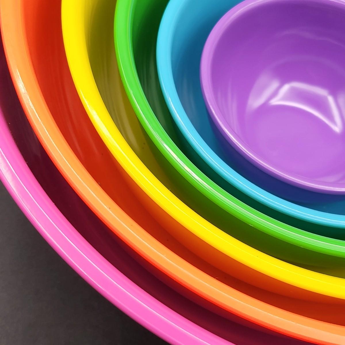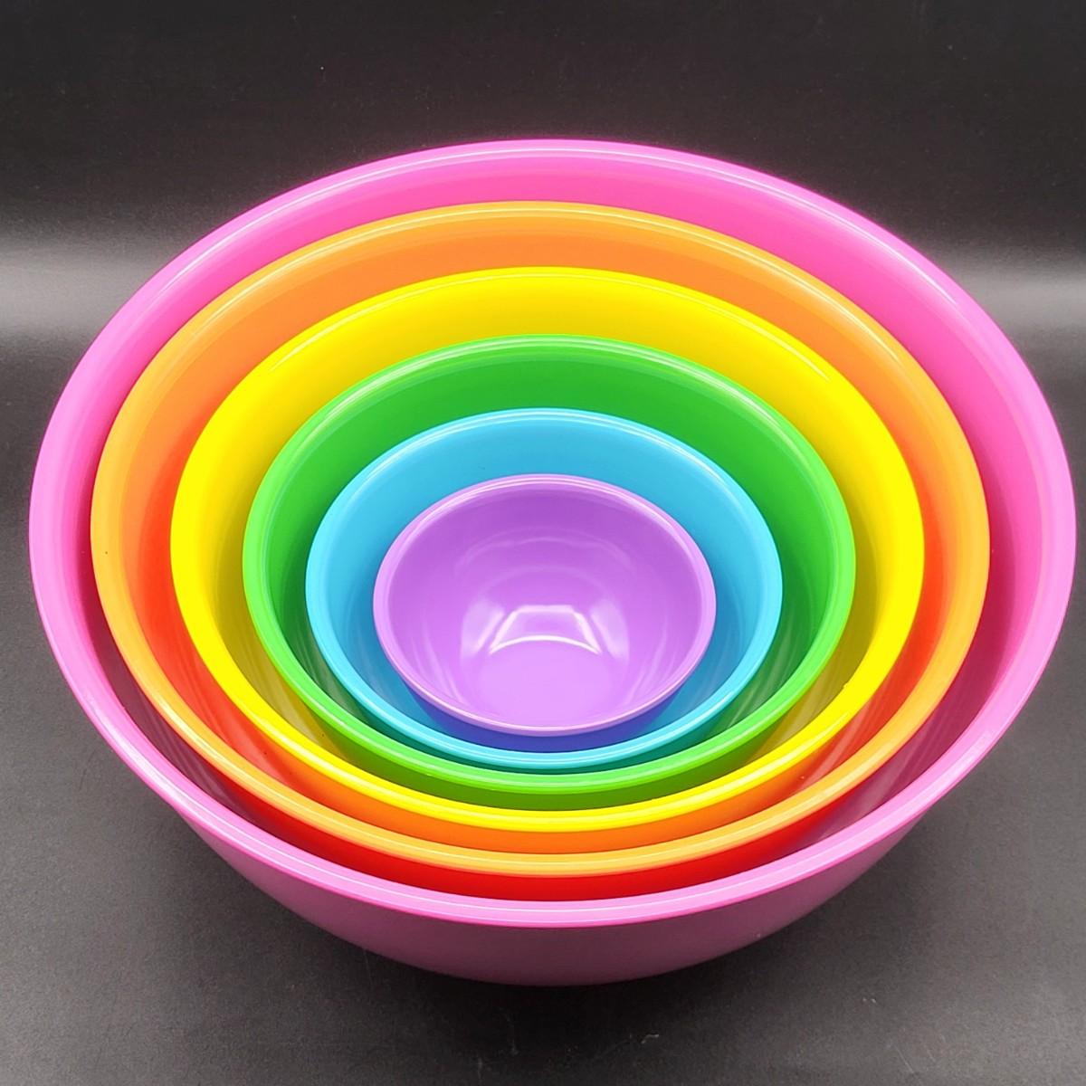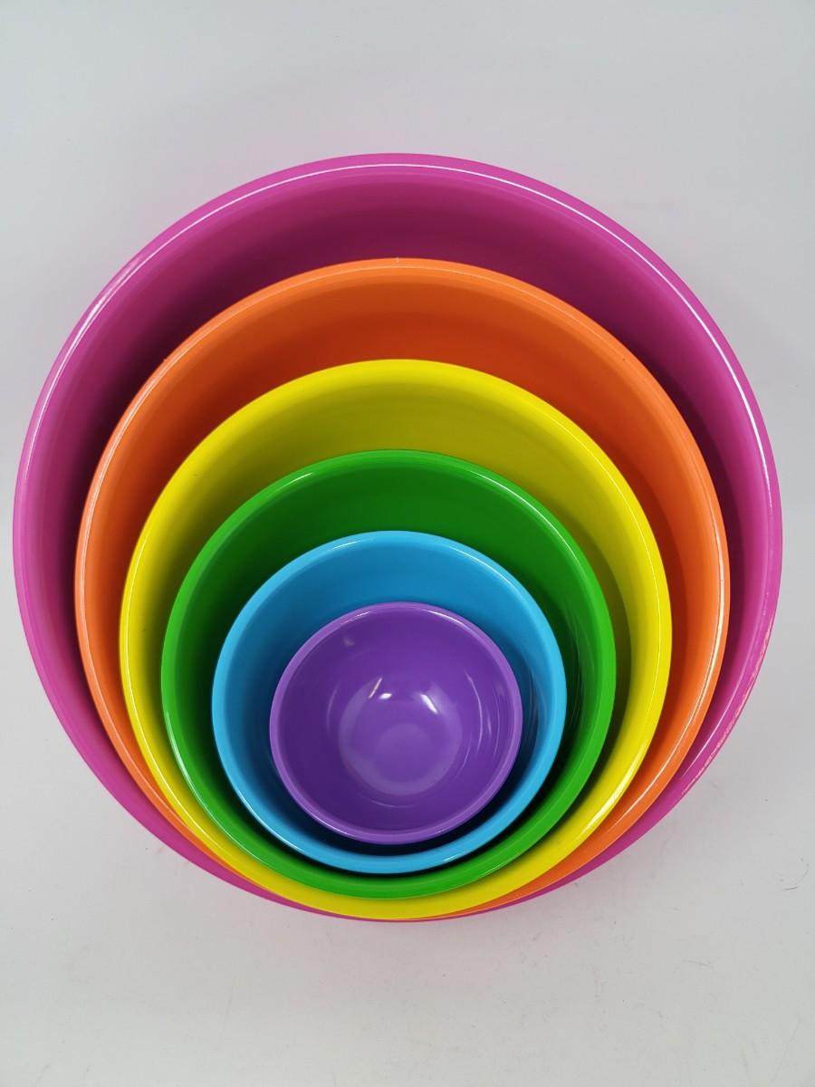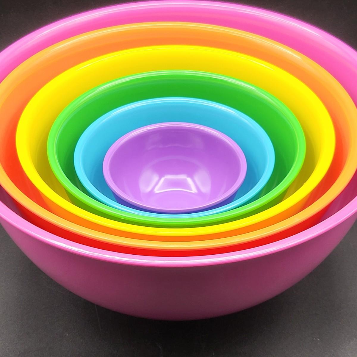 Set of six William Sonoma nesting mixing bowls. Some have lids. Largest bowl is 11.5" x 5.5" and smallest 4" x 2".
