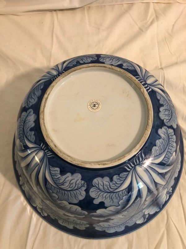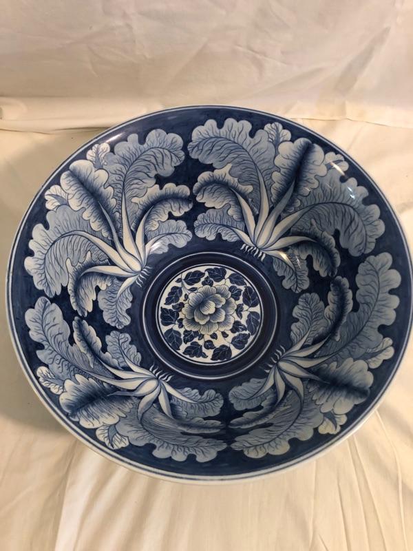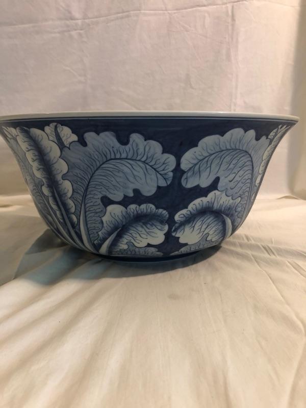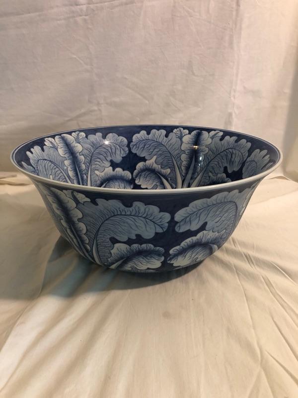 Extra large blue and white leaf design ceramic bowl from William Sonoma 14.5 inches diameter and 6.5in tall at the rim
