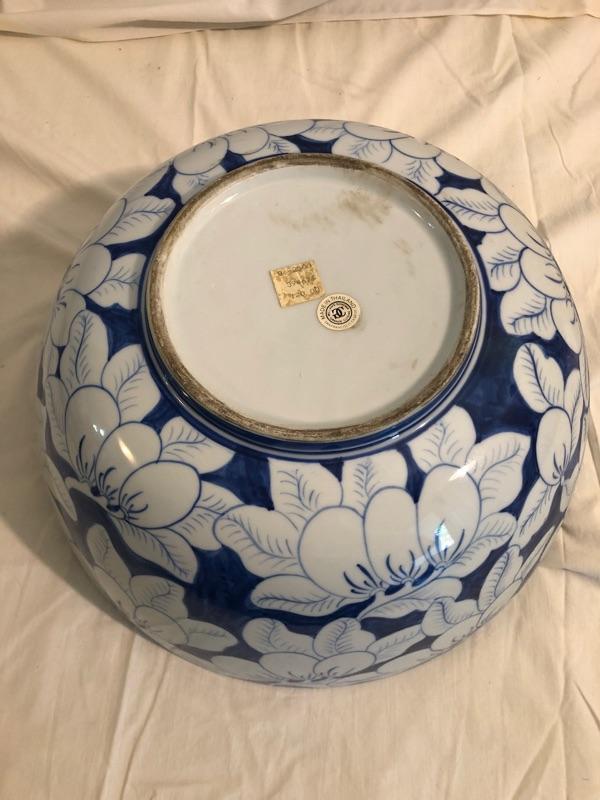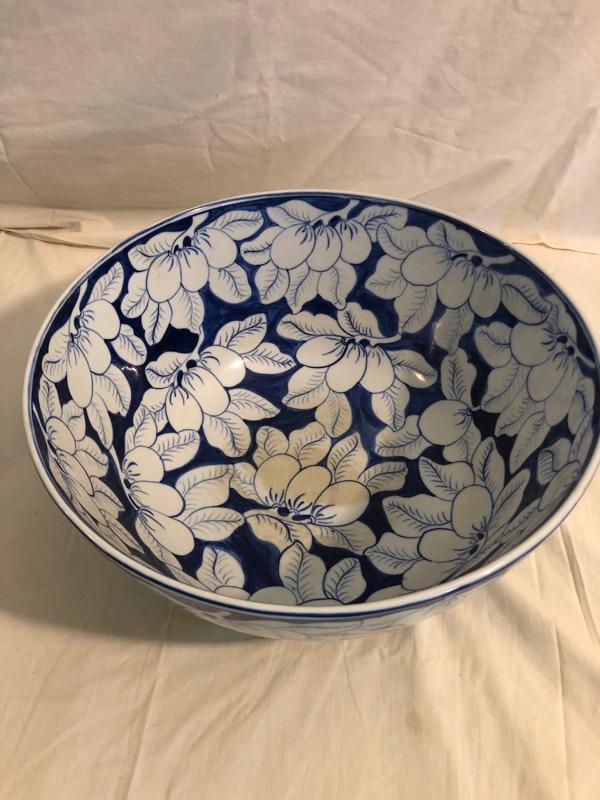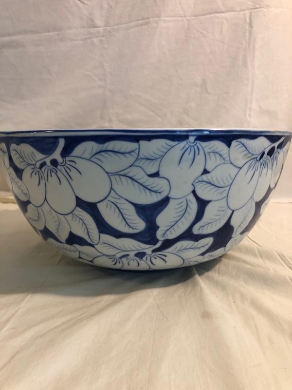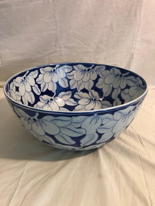 Very large blue and white floral design ceramic bowl from William Sonoma 14in diameter and 6.5in tall at the rim