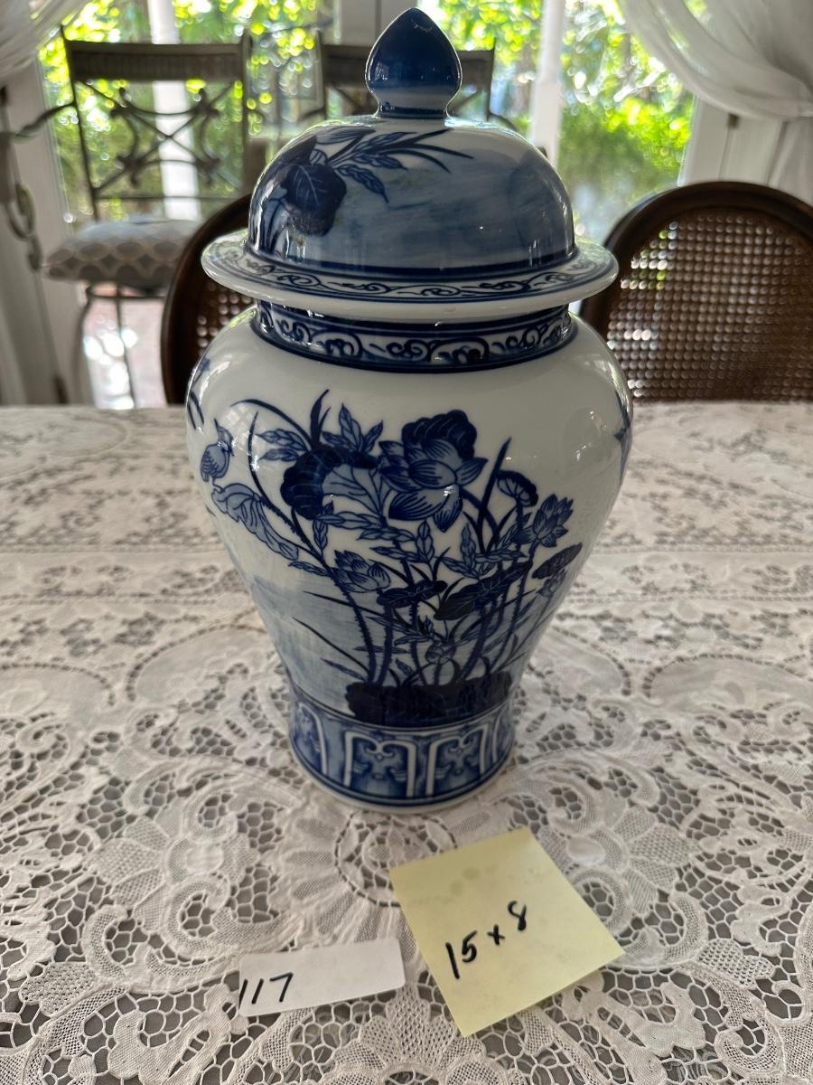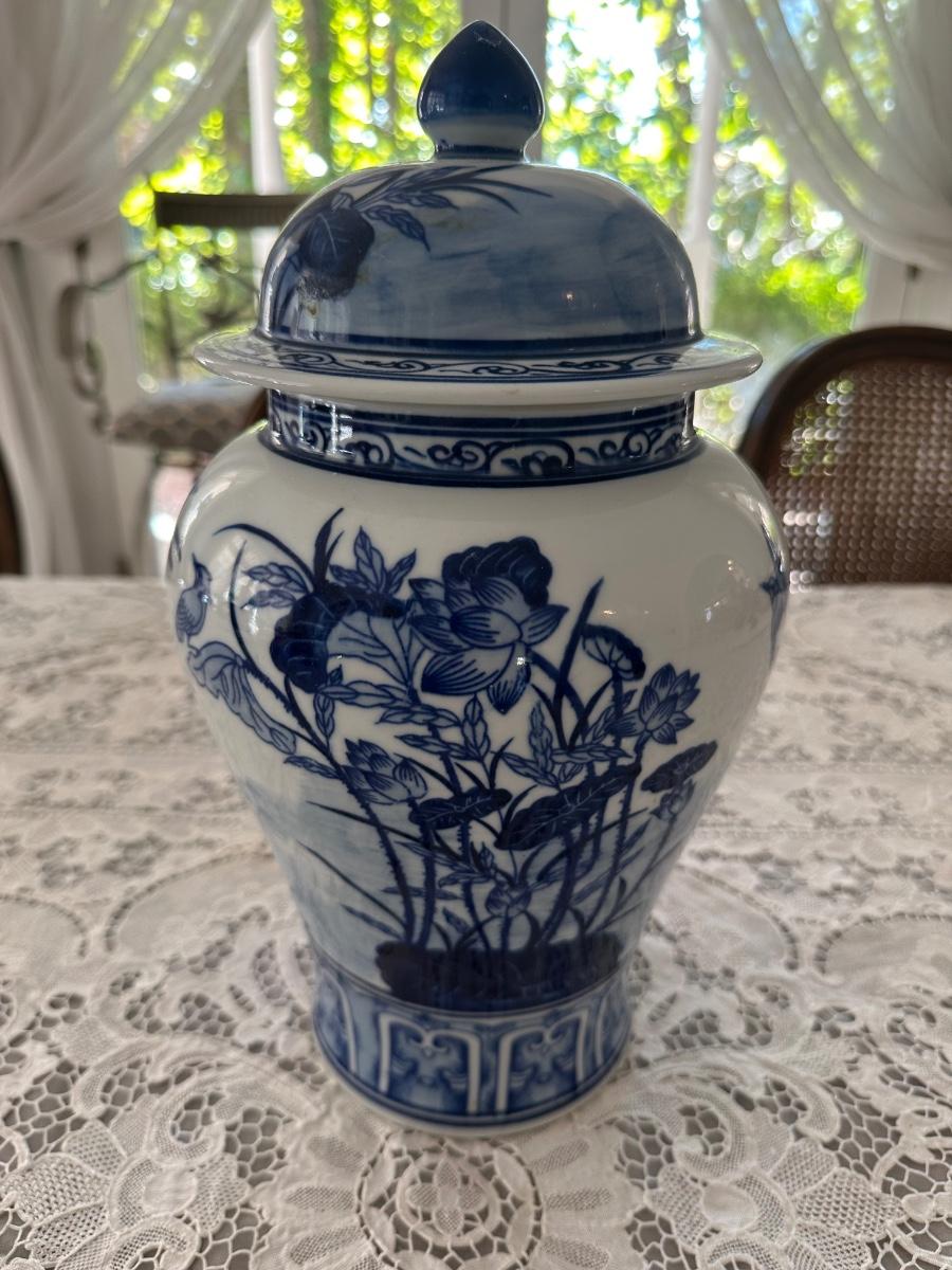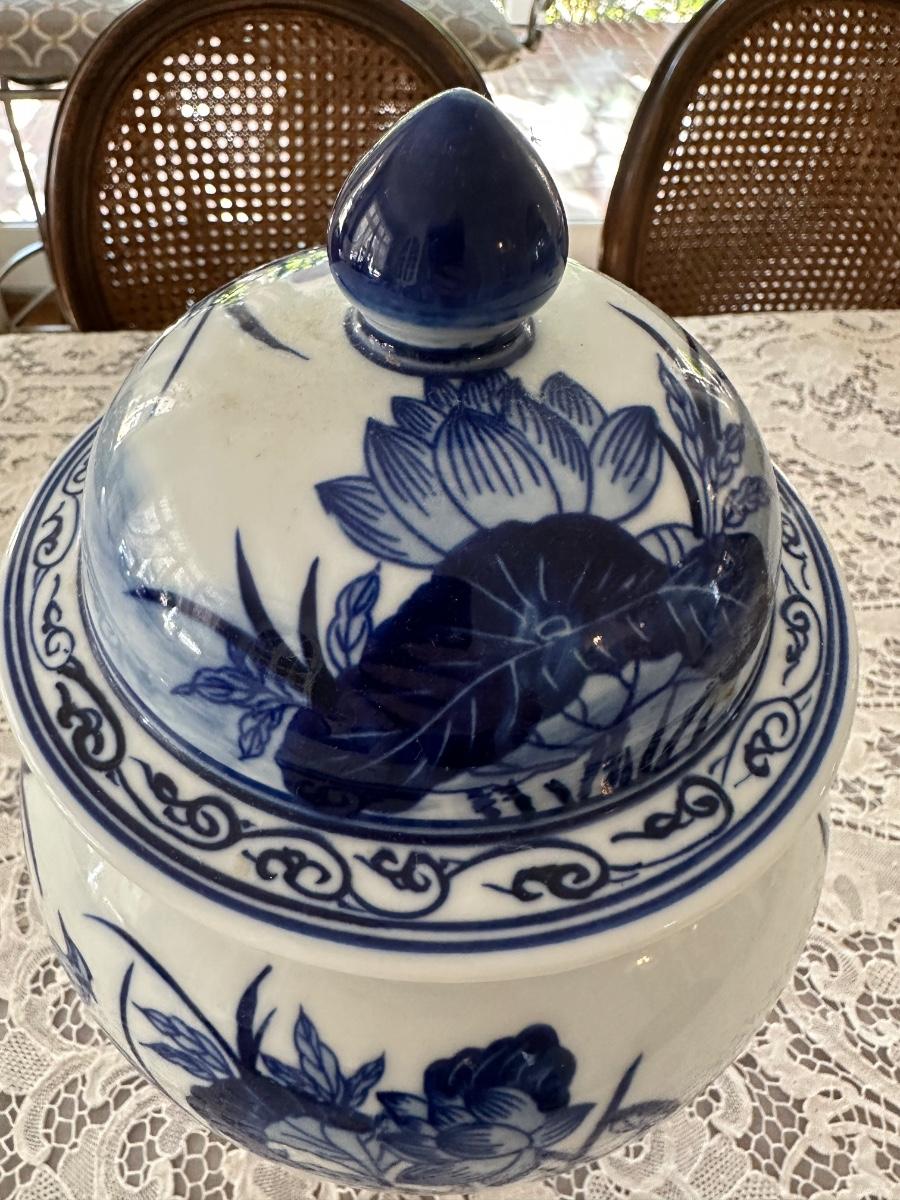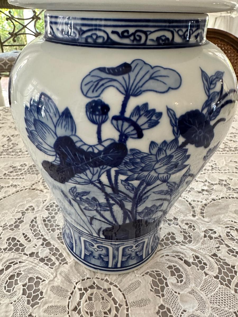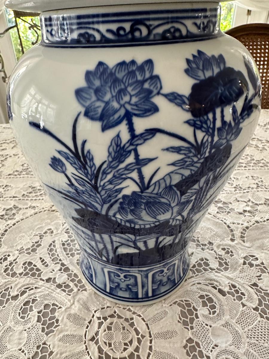 WILLIAMS SONOMA BLUE WHITE LIDDED JAR 15" TALL