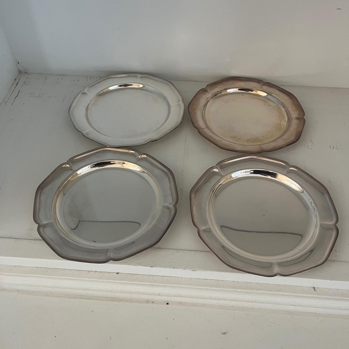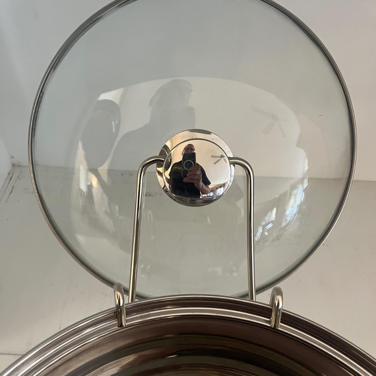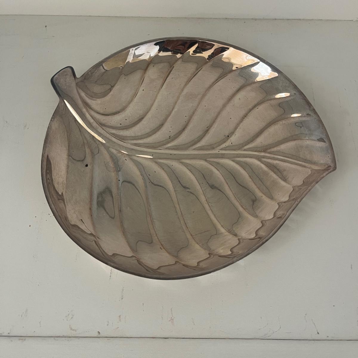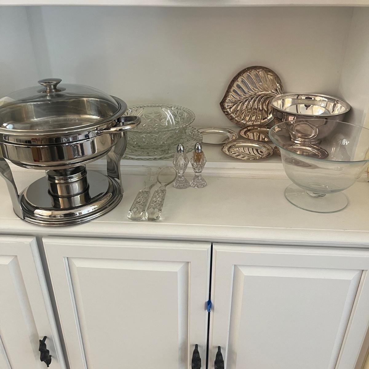 Lot includes a William Sonoma glass bowl, stainless steel chafing dish, Reed & Barton Silverplate bowl, four Silverplate bread-sized plates and a leaf shaped silverplate plate. Chafing dish measures 16” x 13” x 11”H. Also includes formed glass bowl and serving dish plate, glass salad fork and spoon and glass salt and pepper shakers.