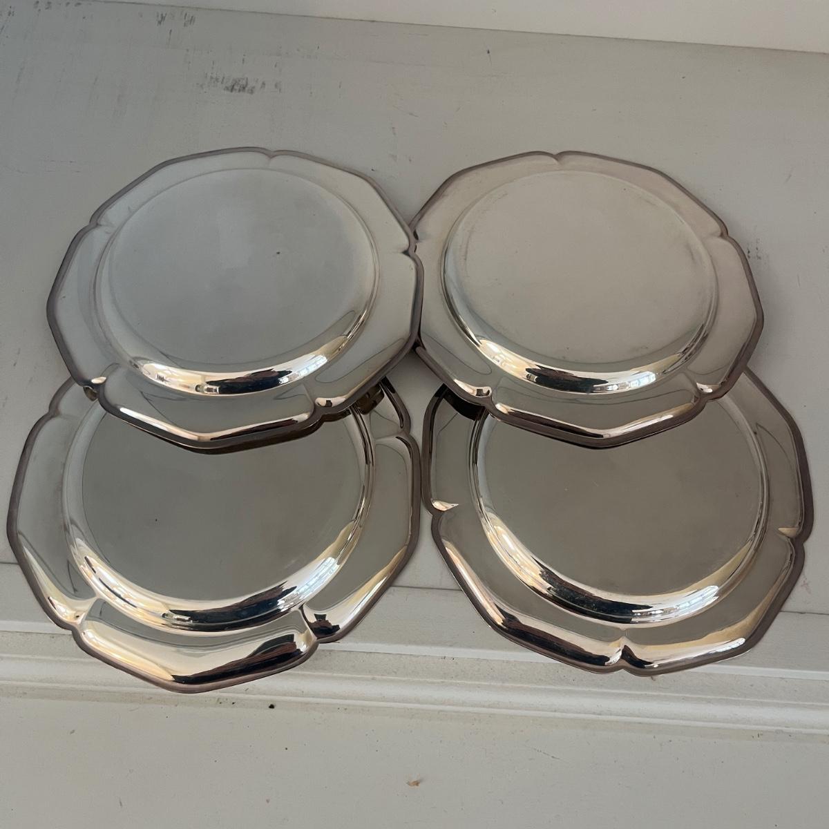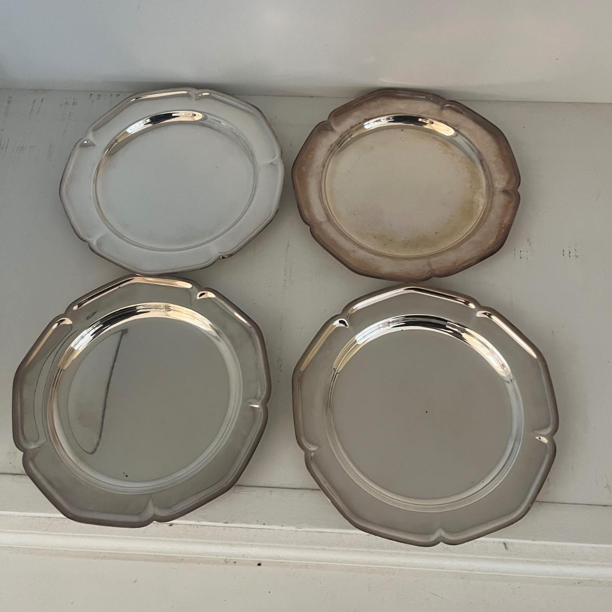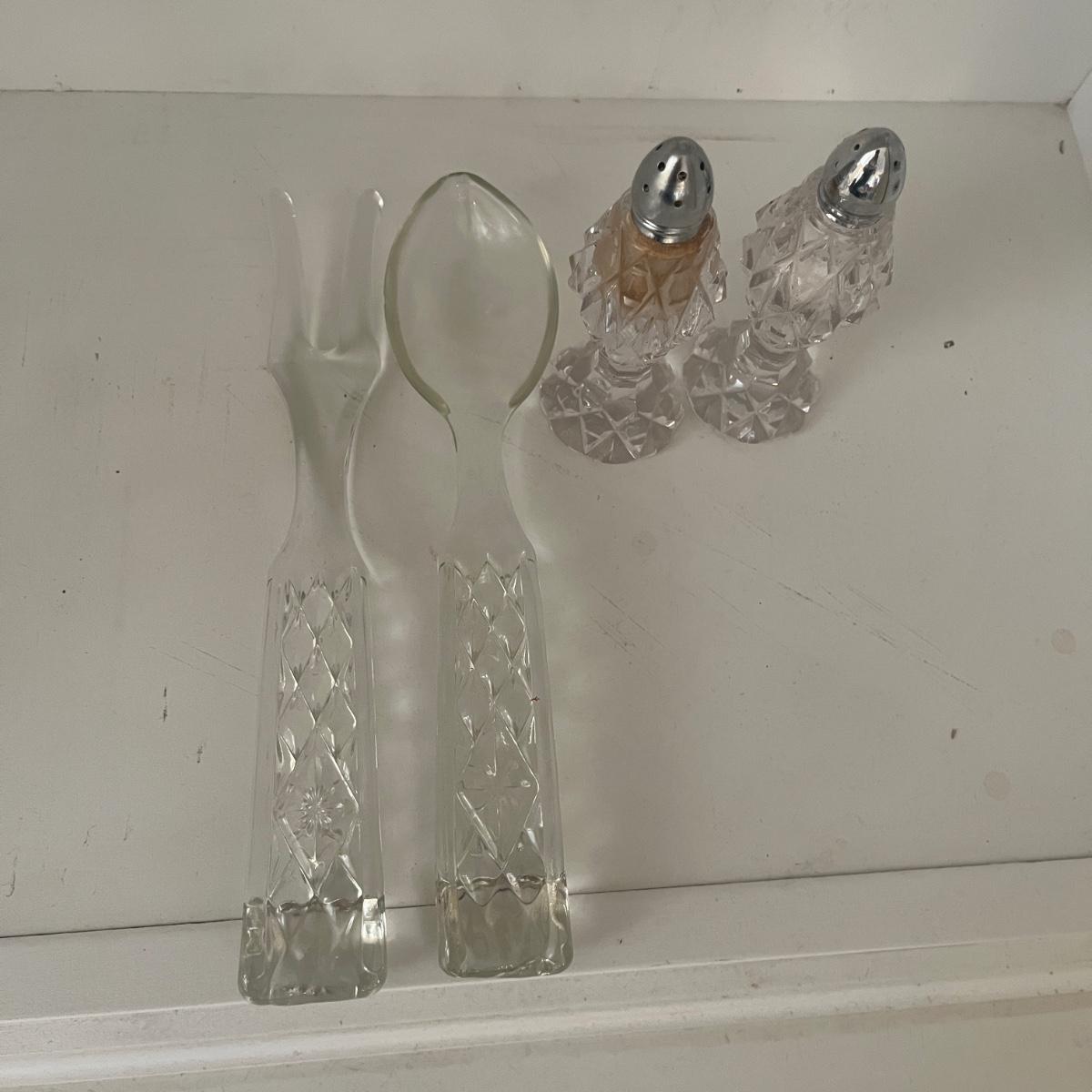 Lot includes a William Sonoma glass bowl, stainless steel chafing dish, Reed & Barton Silverplate bowl, four Silverplate bread-sized plates and a leaf shaped silverplate plate. Chafing dish measures 16” x 13” x 11”H. Also includes formed glass bowl and serving dish plate, glass salad fork and spoon and glass salt and pepper shakers.