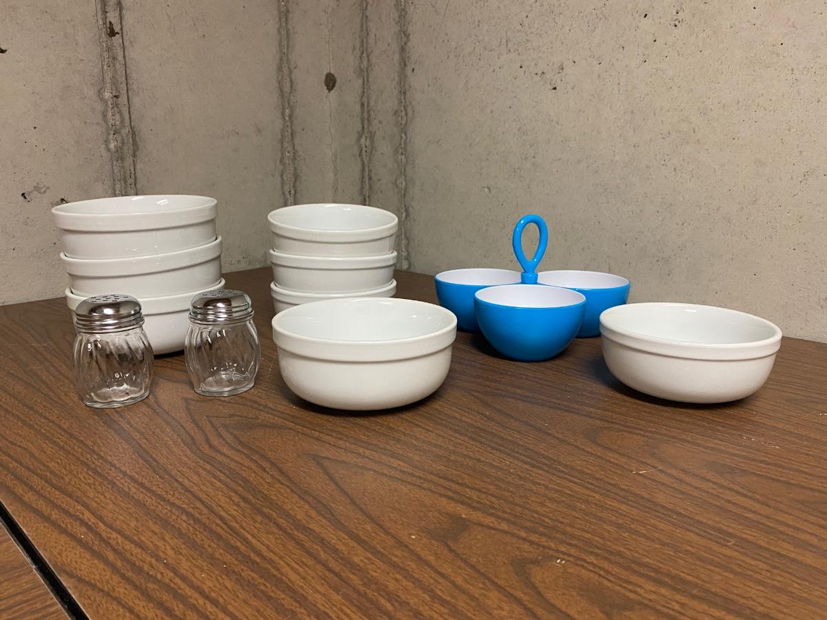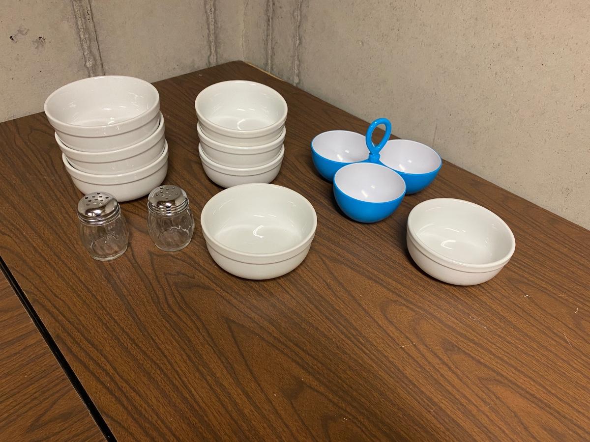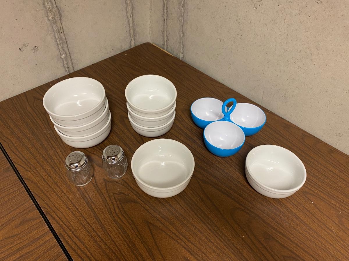 WILLIAMS- SONOMA BOWLS (TWO SIZES), DIP TRAY AND SHAKERS