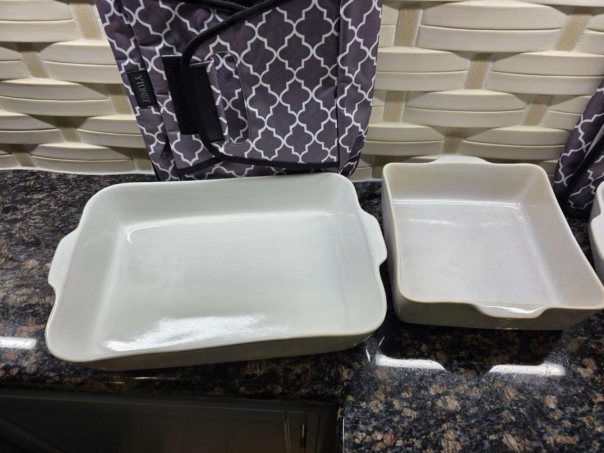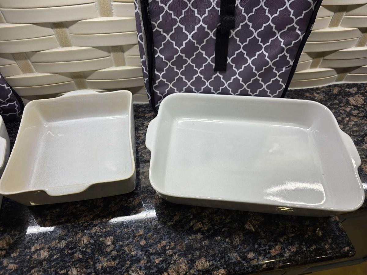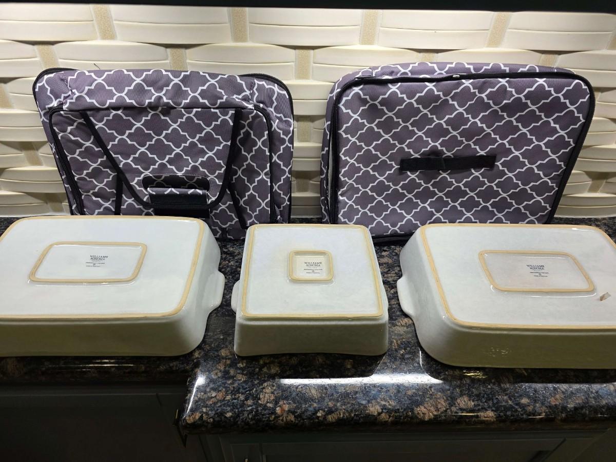 Lot of 3 Williams Sonoma "California" baking casserole dishes with 2 carriers (carriers are not WS brand). You are bidding on the lot meaning you must pay for and take the entire lot.