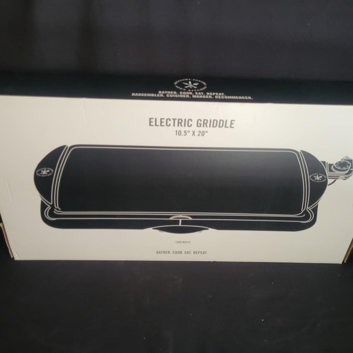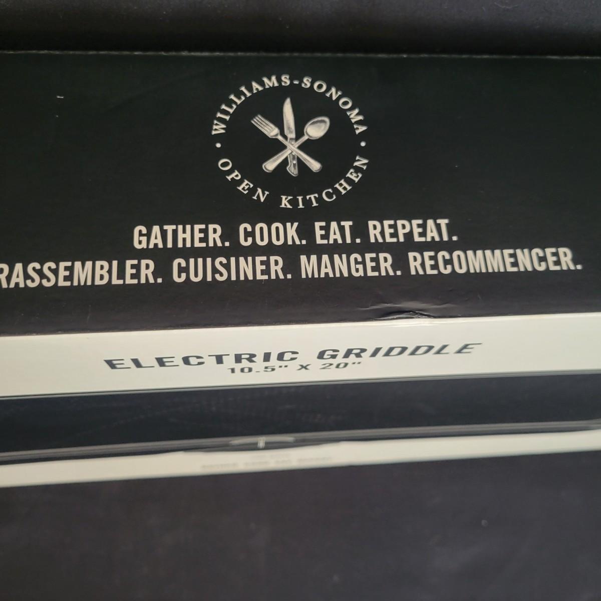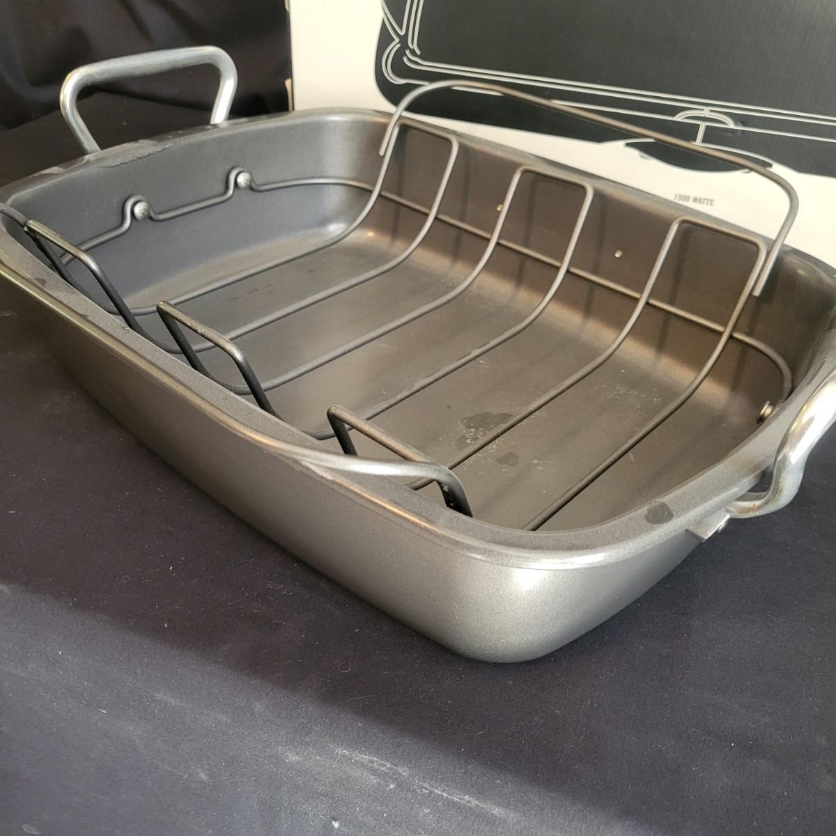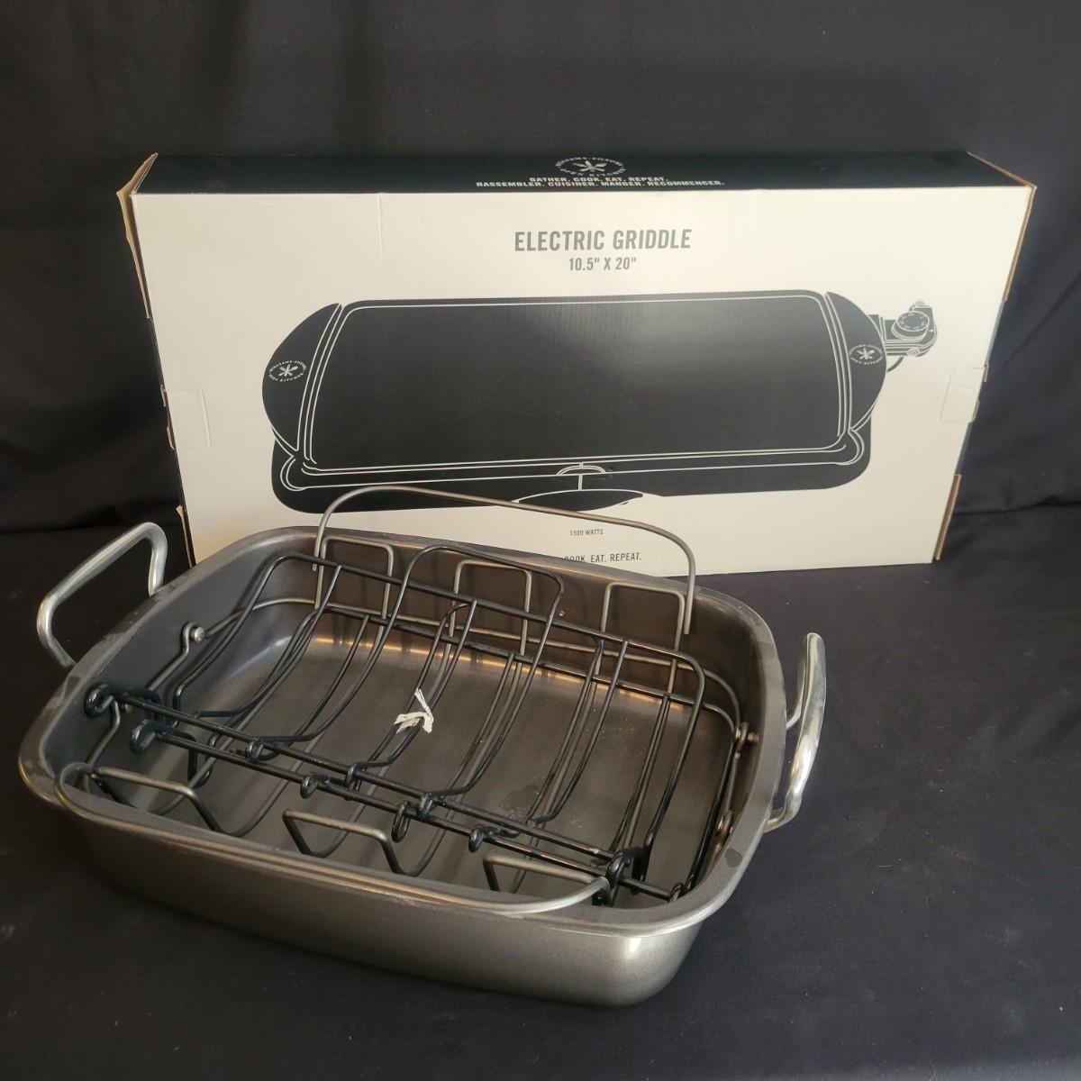 A Williams Sonoma 1500 watt electric griddle that powered on when plugged in. It measures approximately 24" x 12" x 3.5"H. Also included is a Food Network roasting pan with multiple roasting racks. Shipping available.