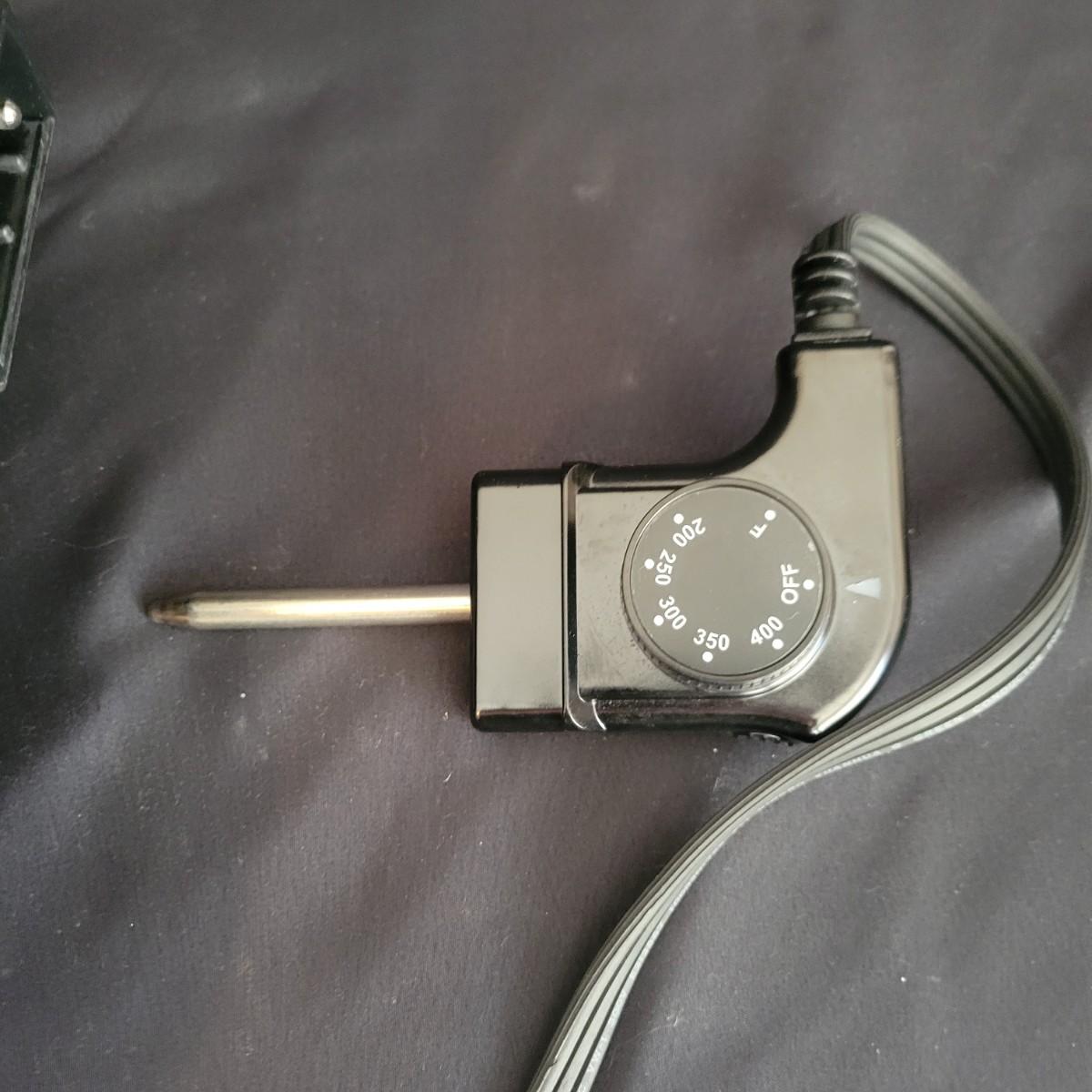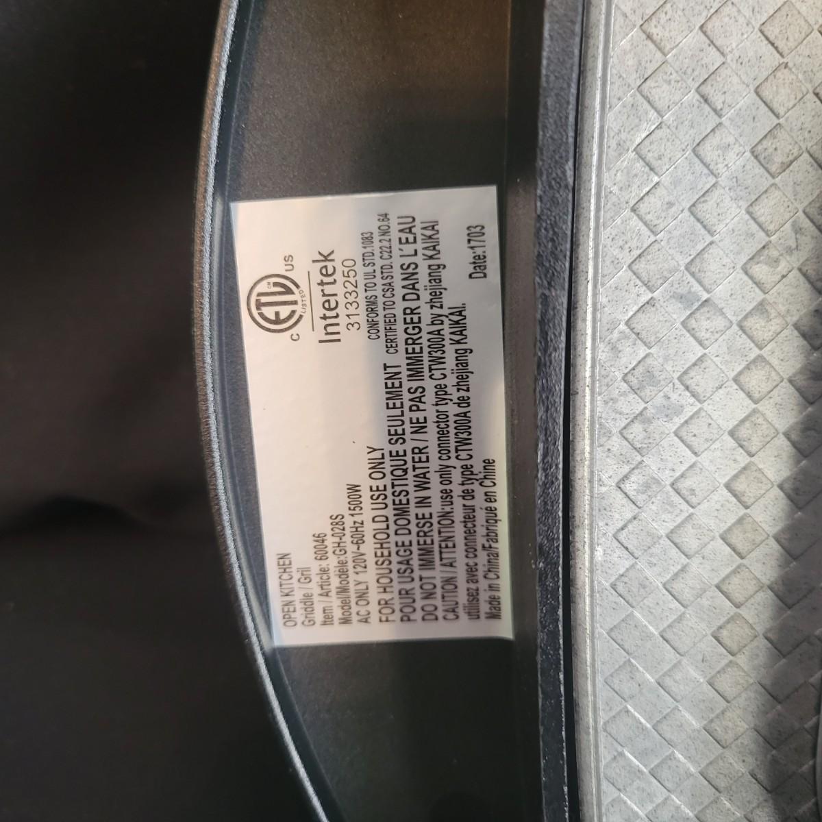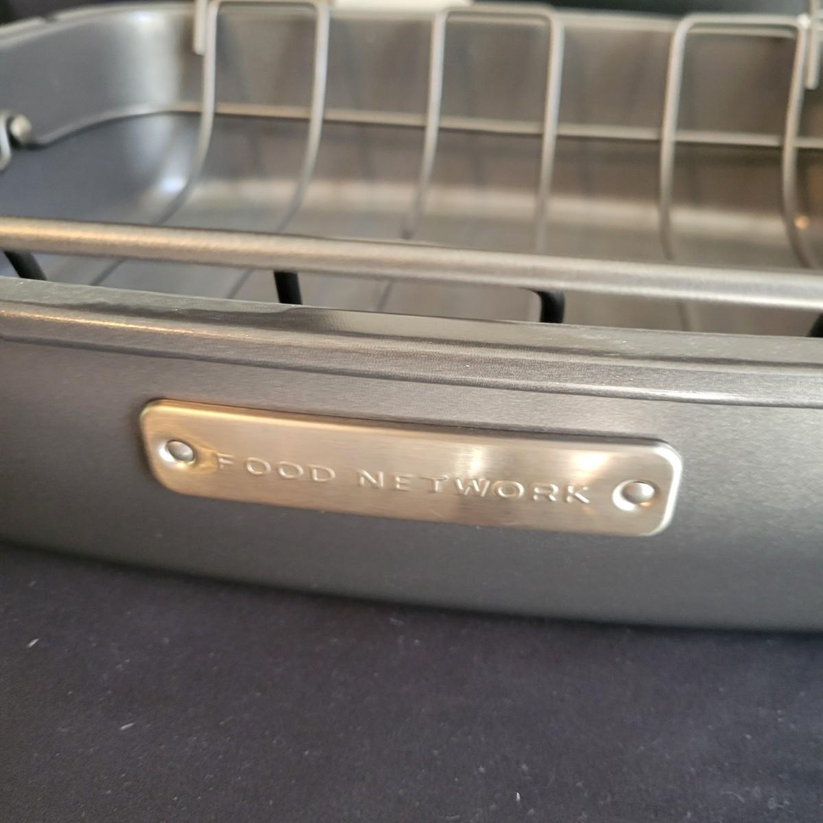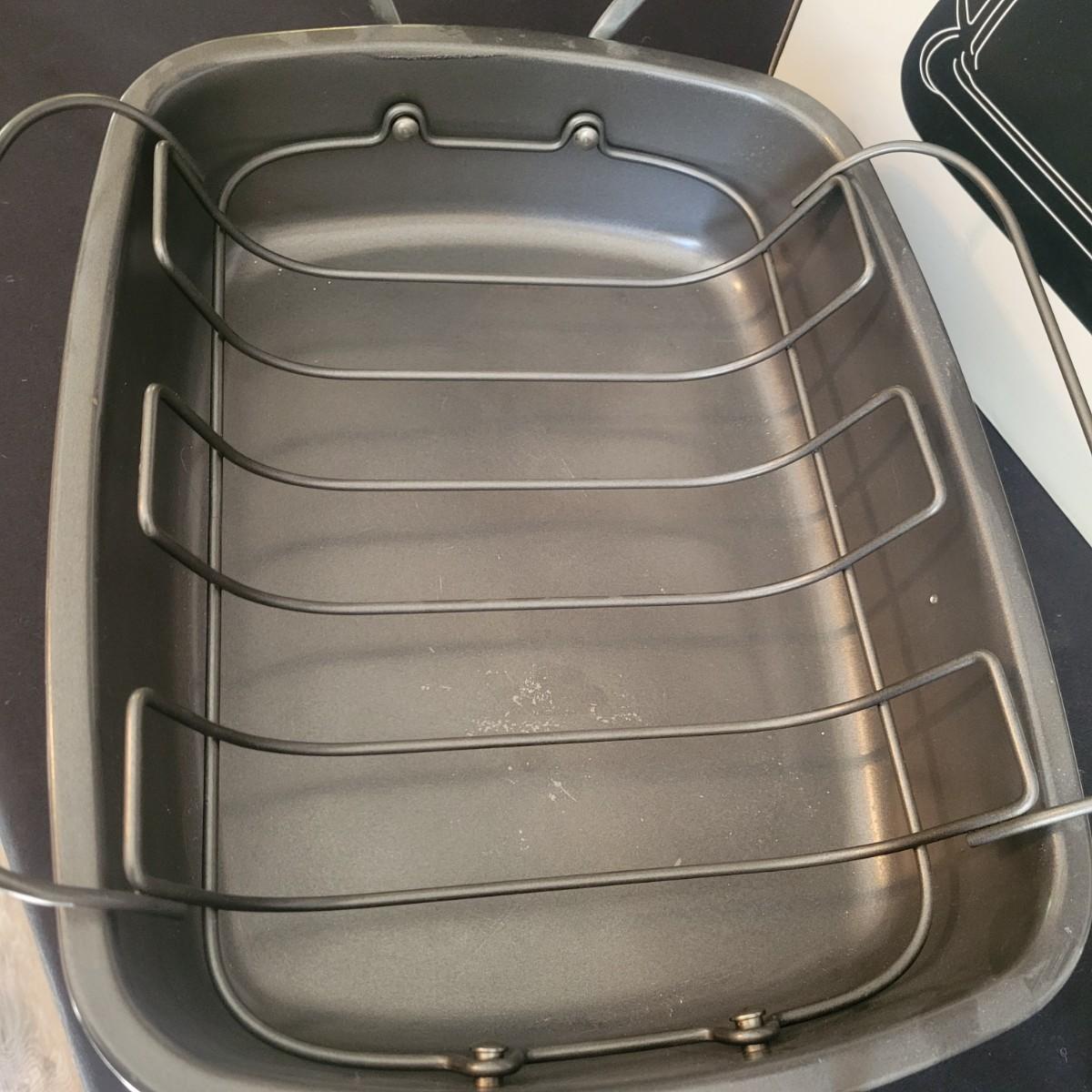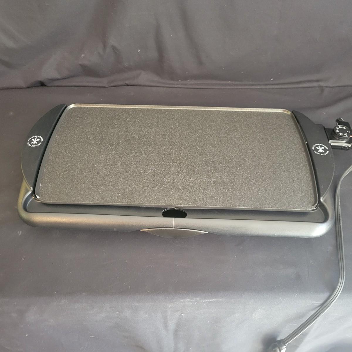 A Williams Sonoma 1500 watt electric griddle that powered on when plugged in. It measures approximately 24" x 12" x 3.5"H. Also included is a Food Network roasting pan with multiple roasting racks. Shipping available.