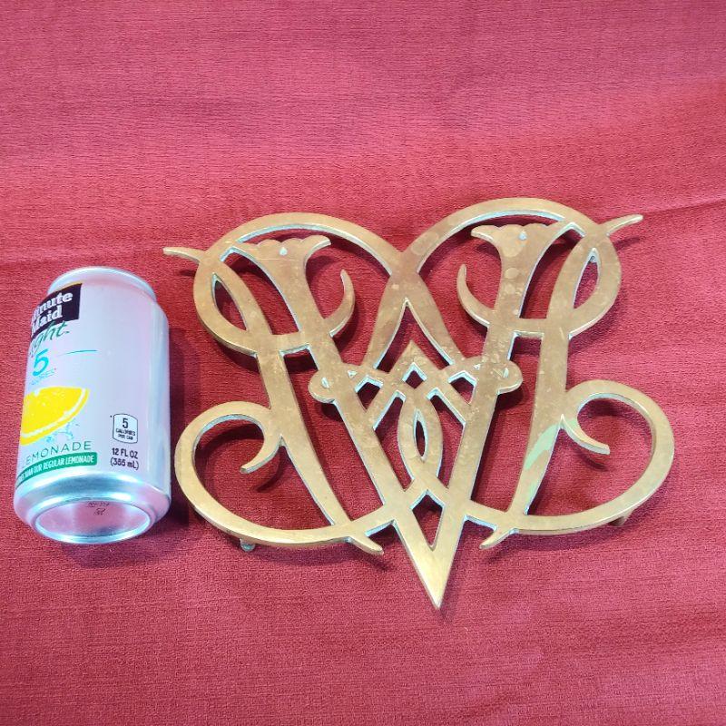 Measures 10 1/2-inches wide X 5-inches tall. Shows some wear and tarnish consistent with age and use. Very solid and heavy brass.