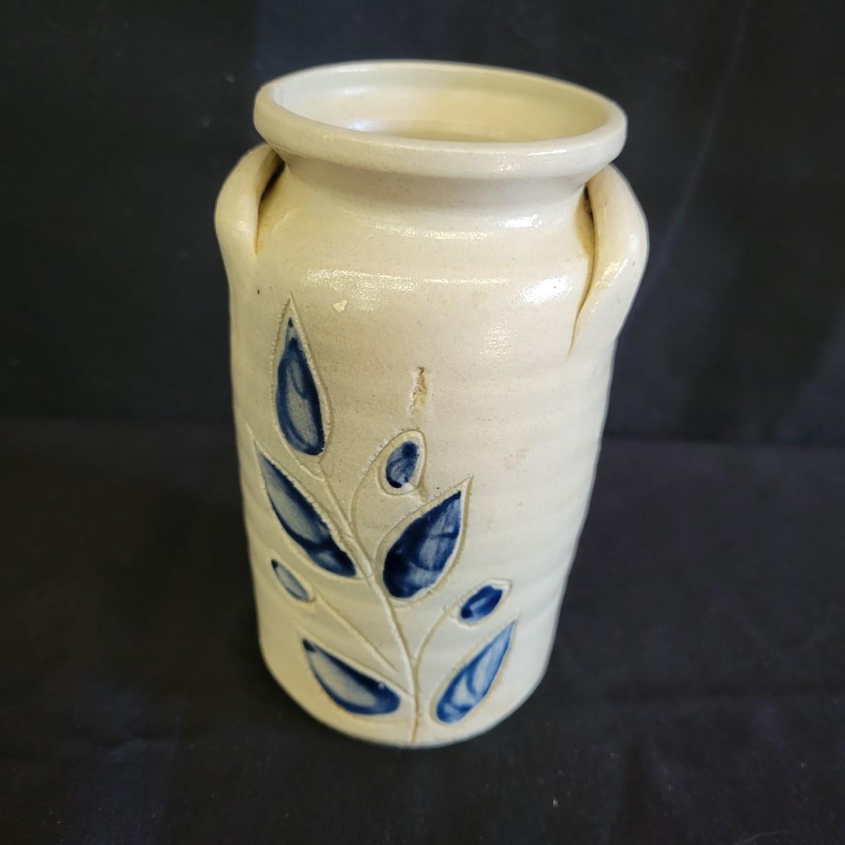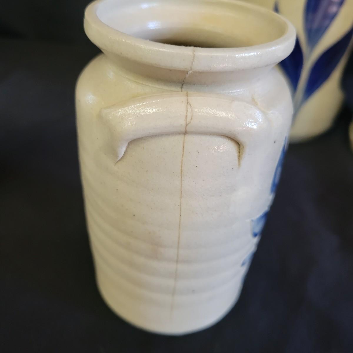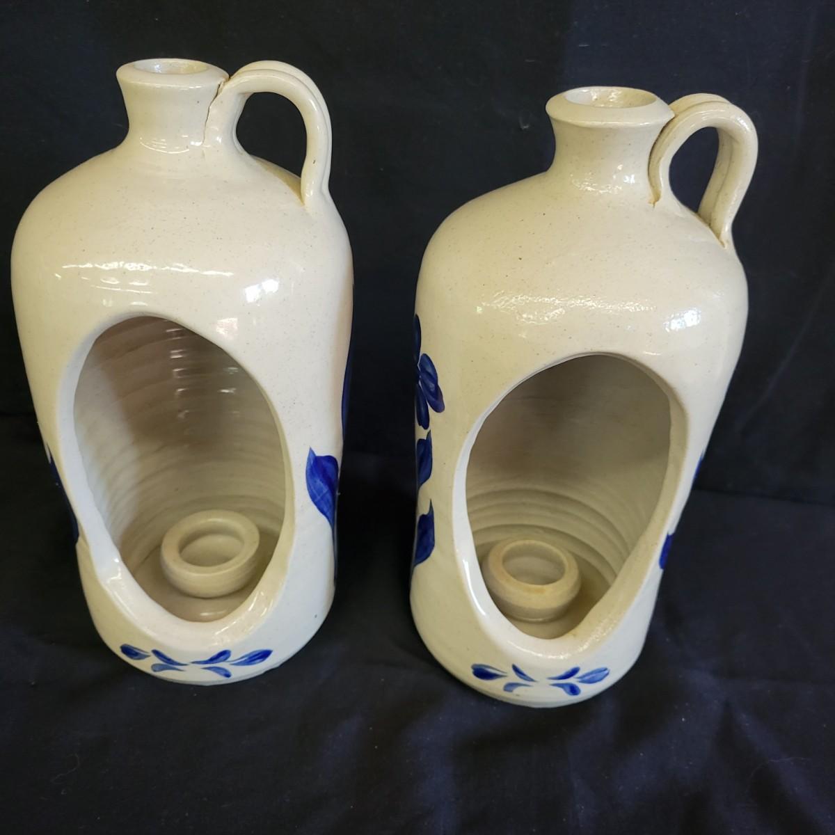 A collection of six Williamsburg Pottery Factory pieces in a cream stone color with blue botanical accents Included is a pitcher, two cups, two candle holders and a small vase with a notable crack. The candle holders measure approximately 3.5"D x 8"H. Shipping available. Shipping can be costly. We suggest contacting our preferred local shipping provider, Postage Express, with dimensions and getting an estimate before bidding: (828) 670-5501 or postageexpress@yahoo.com.