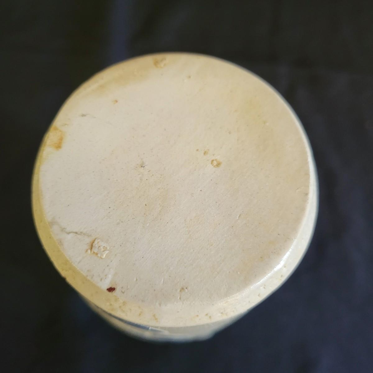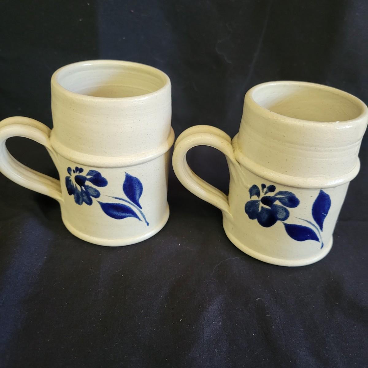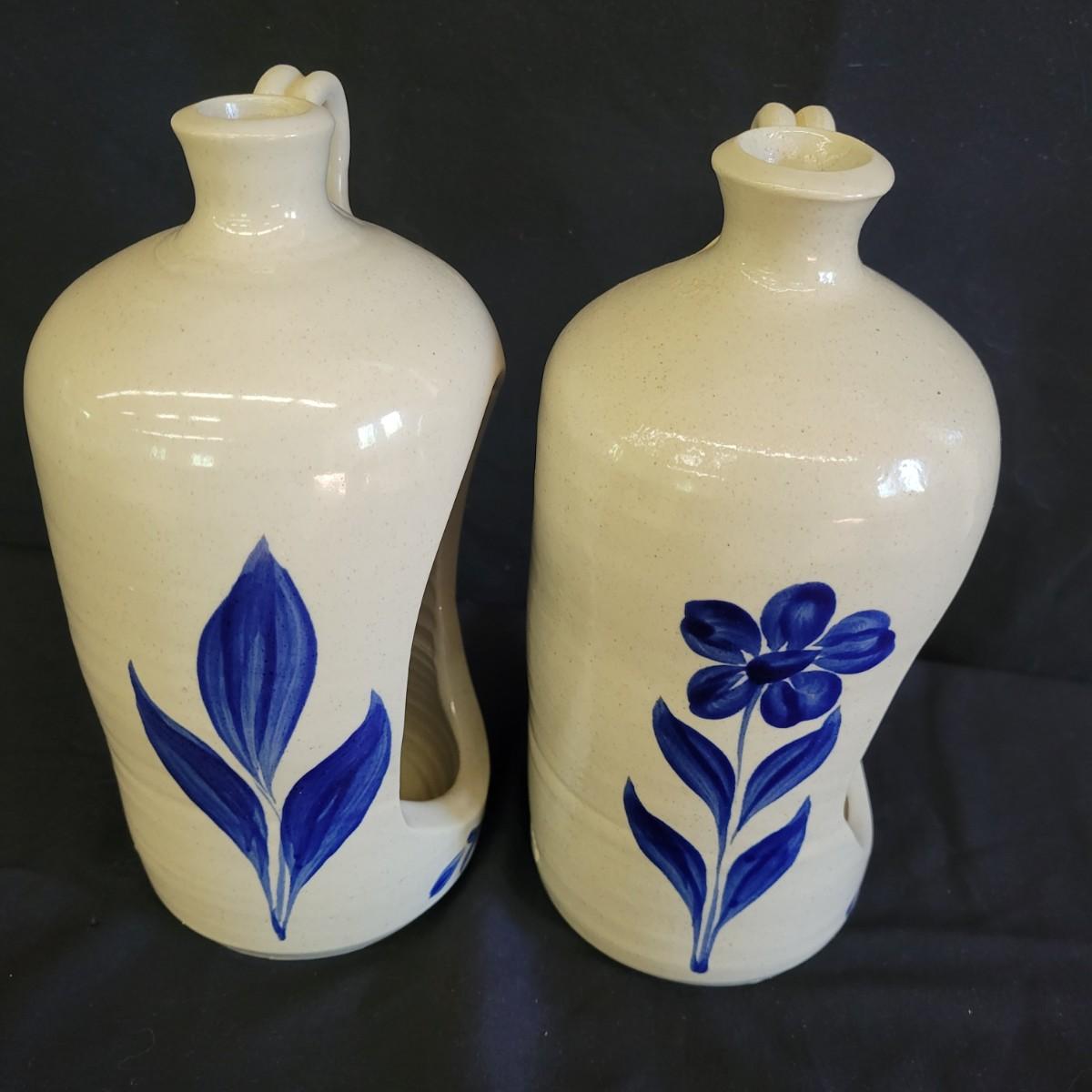 A collection of six Williamsburg Pottery Factory pieces in a cream stone color with blue botanical accents Included is a pitcher, two cups, two candle holders and a small vase with a notable crack. The candle holders measure approximately 3.5"D x 8"H. Shipping available. Shipping can be costly. We suggest contacting our preferred local shipping provider, Postage Express, with dimensions and getting an estimate before bidding: (828) 670-5501 or postageexpress@yahoo.com.