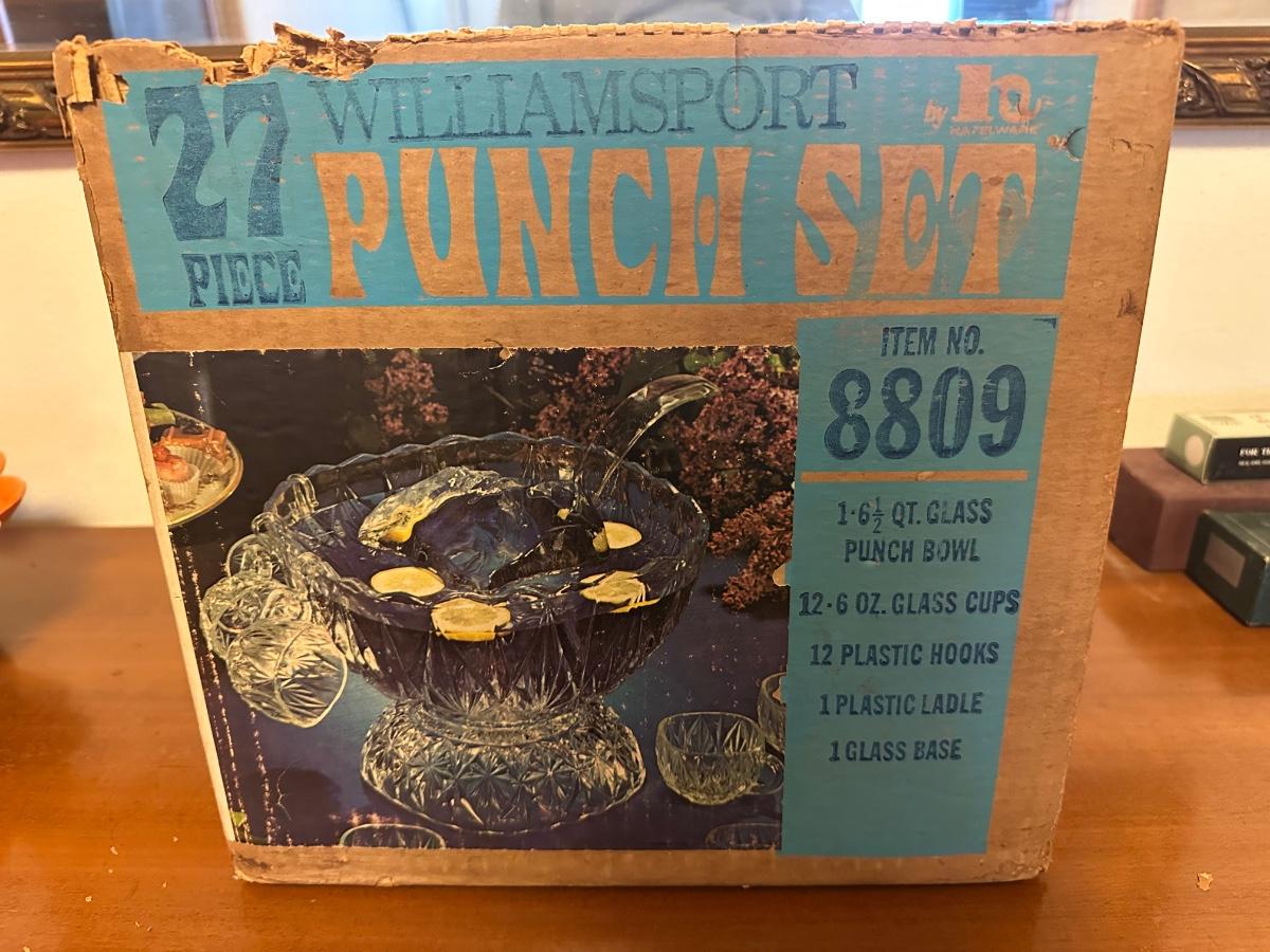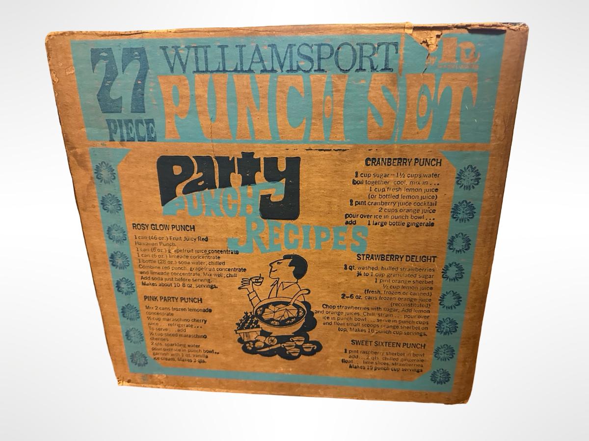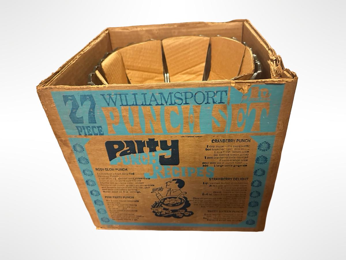 Williamsport glass punch set with 27 total pieces. Includes the glass punch bowl and a mix of cups, hooks, ladle, and base pieces as shown. Original box has wear from age. Cups box is sealed.