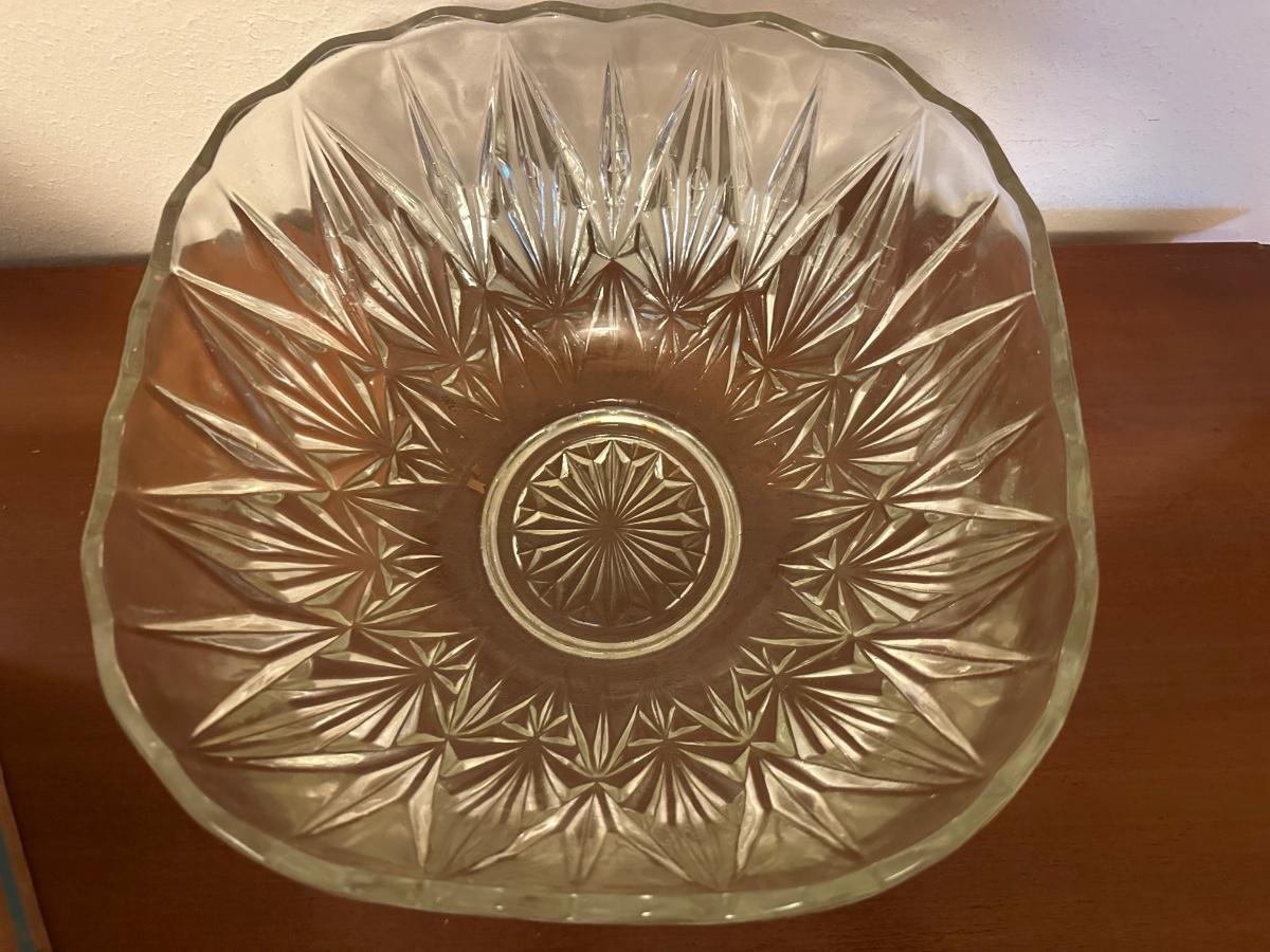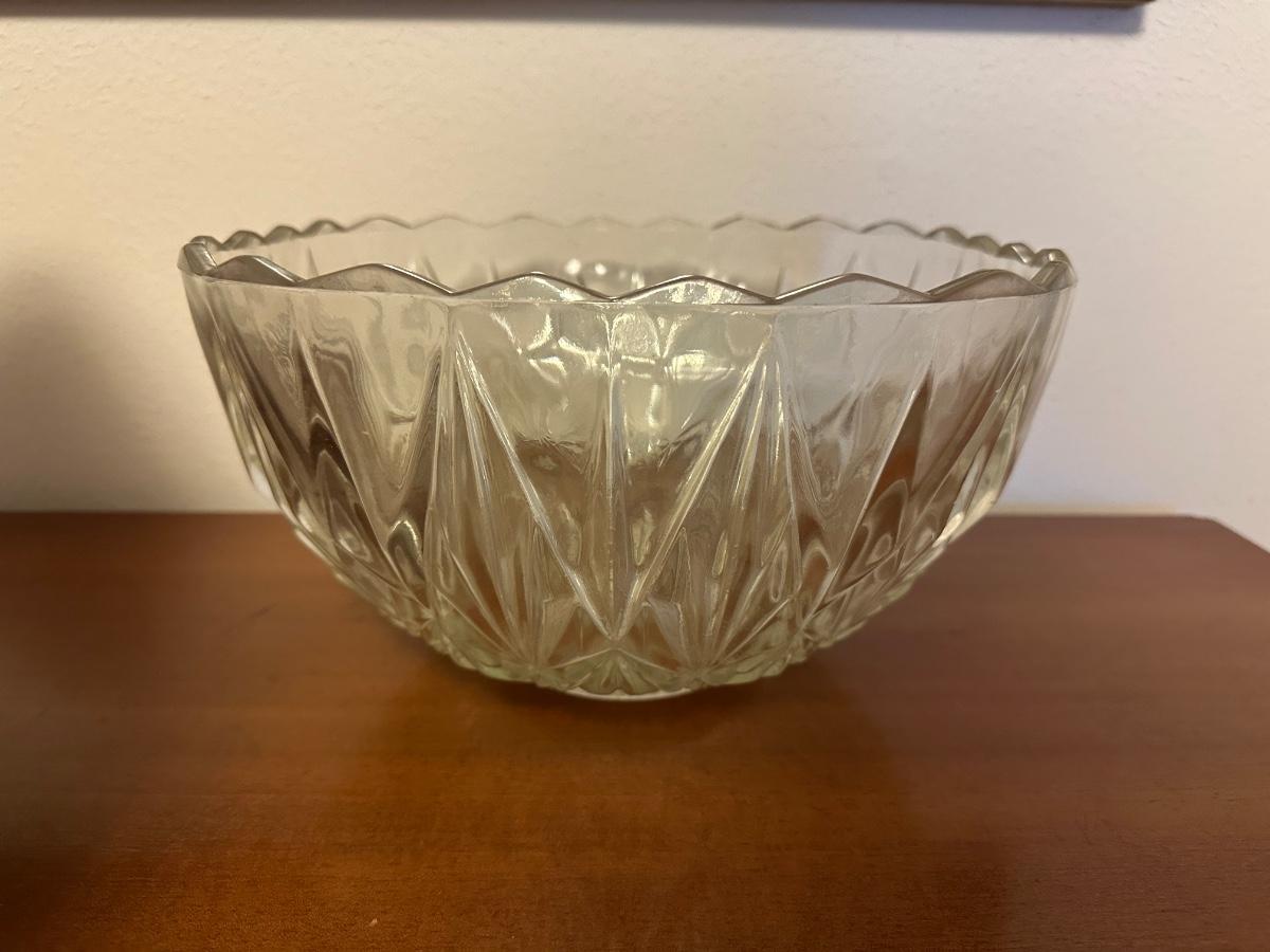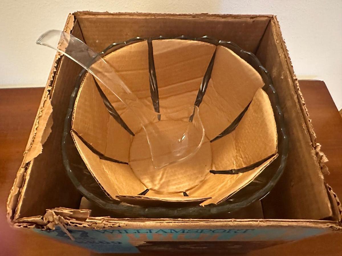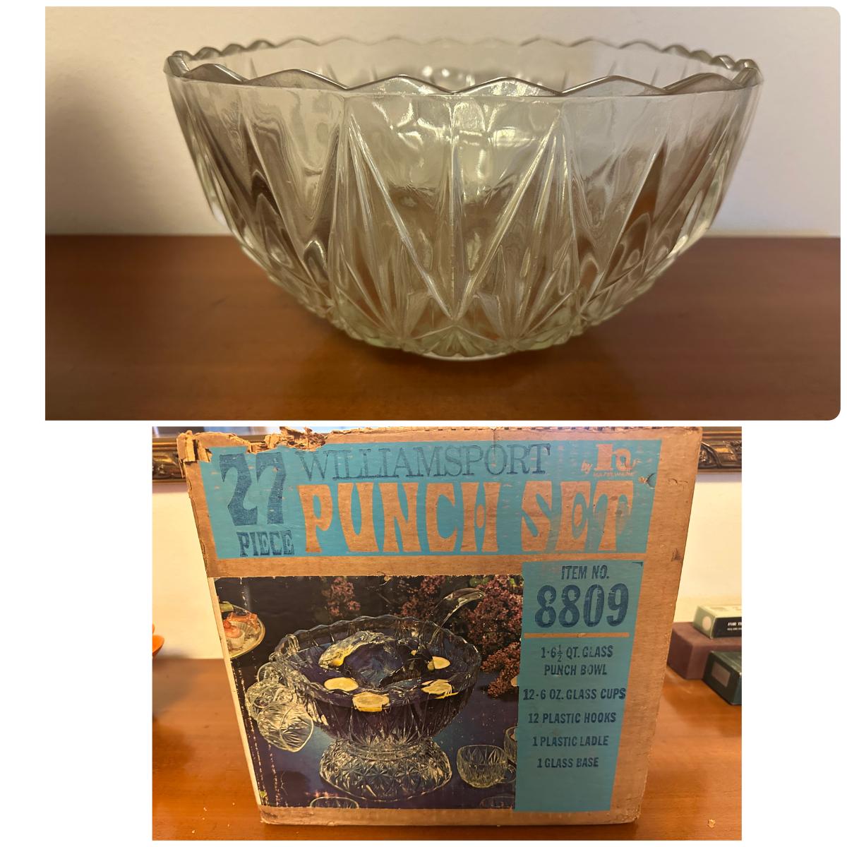 Williamsport glass punch set with 27 total pieces. Includes the glass punch bowl and a mix of cups, hooks, ladle, and base pieces as shown. Original box has wear from age. Cups box is sealed.
