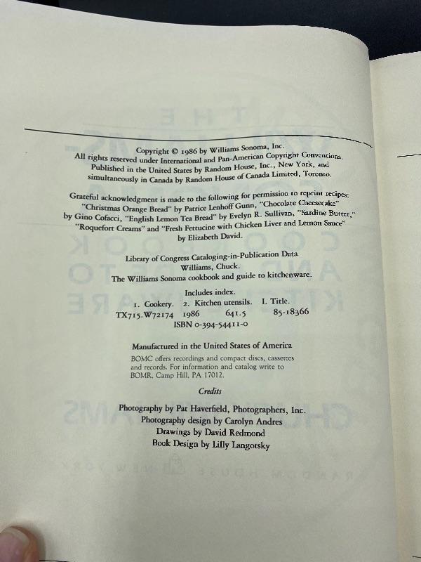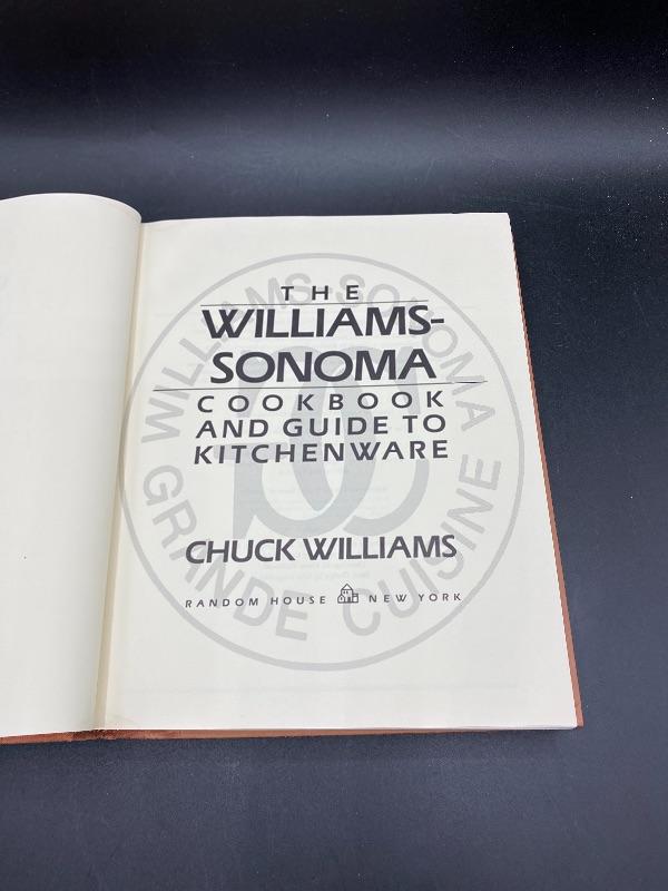 Williams-Sonoma Cookbook and Guide to Kitchenware hardback book. Great section on kitchenware. Recipes show you the best pan to use for dish. 304 pages. Copyright 1986.